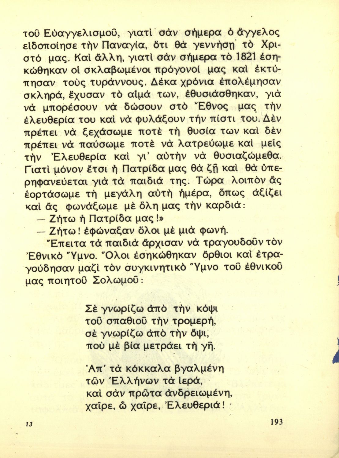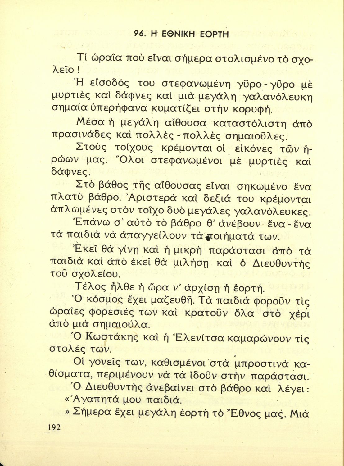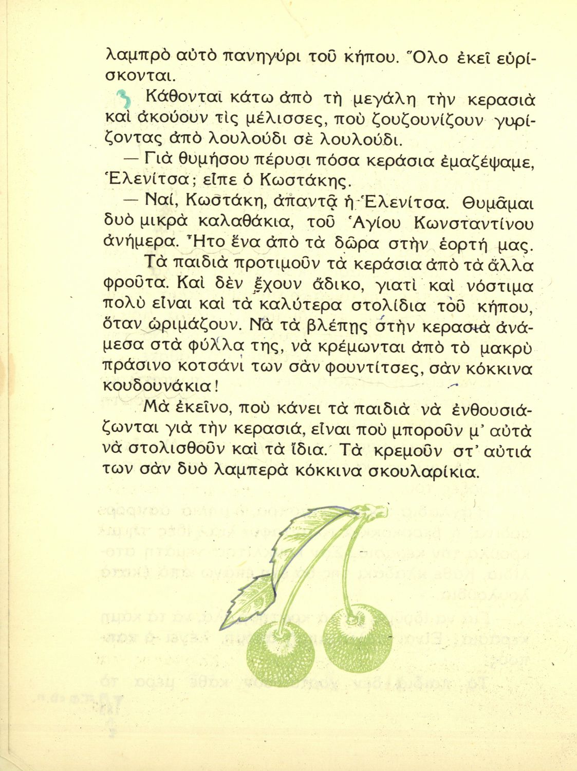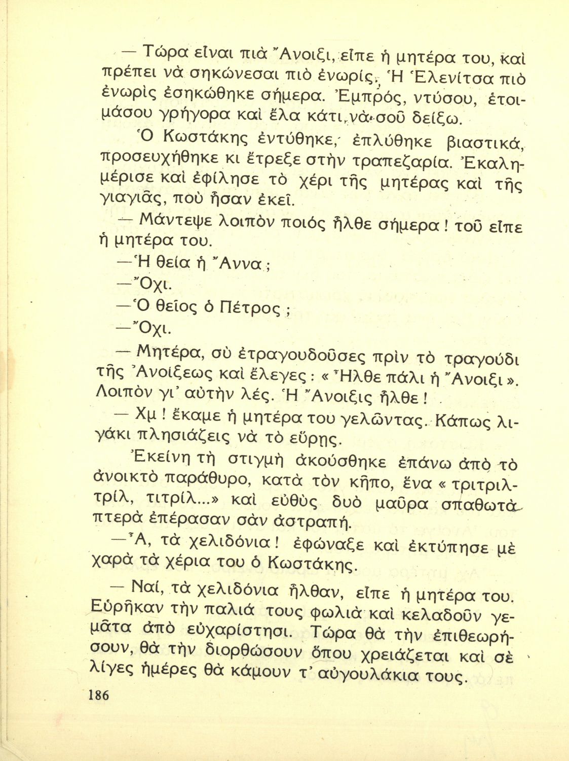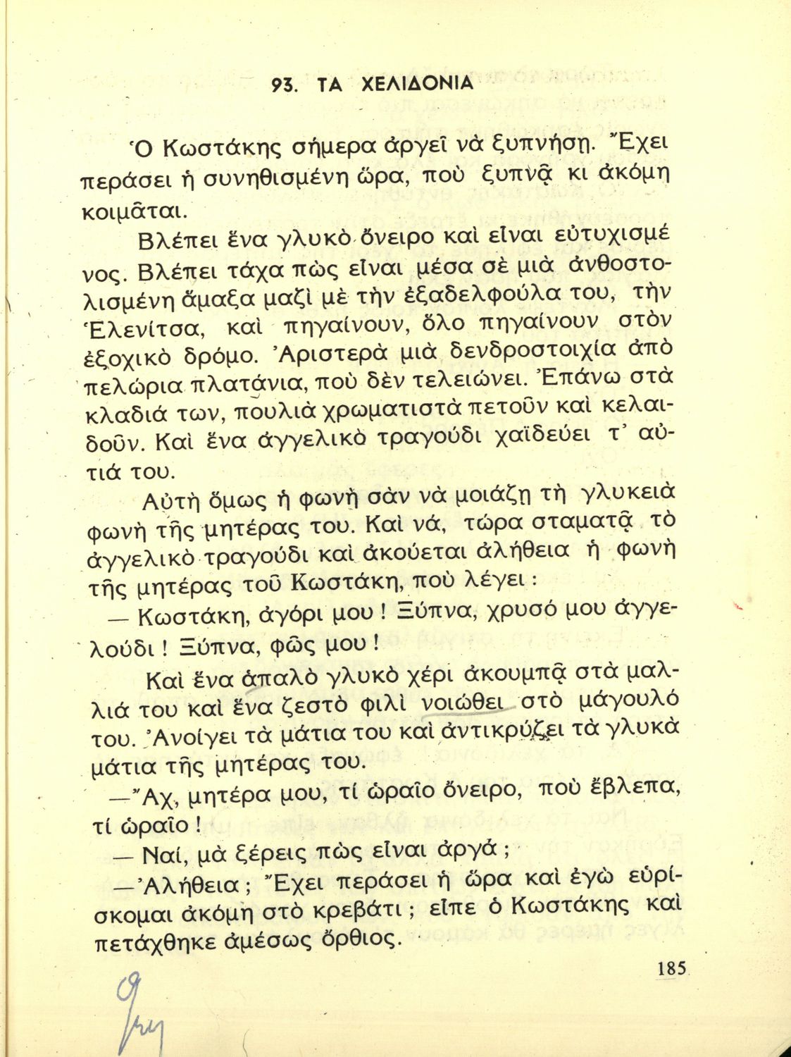 Αναγνωστικό της Γ΄ Δημοτικού που περιλαμβάνει μικρές ιστορίες εθνικιστικού περιεχομένου εμπνευσμένες από την ύπαιθρο, την οικογενειακή και κοινωνική ζωή αλλά και το εθνικό παρελθόν.