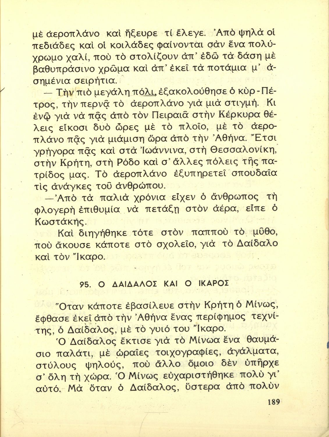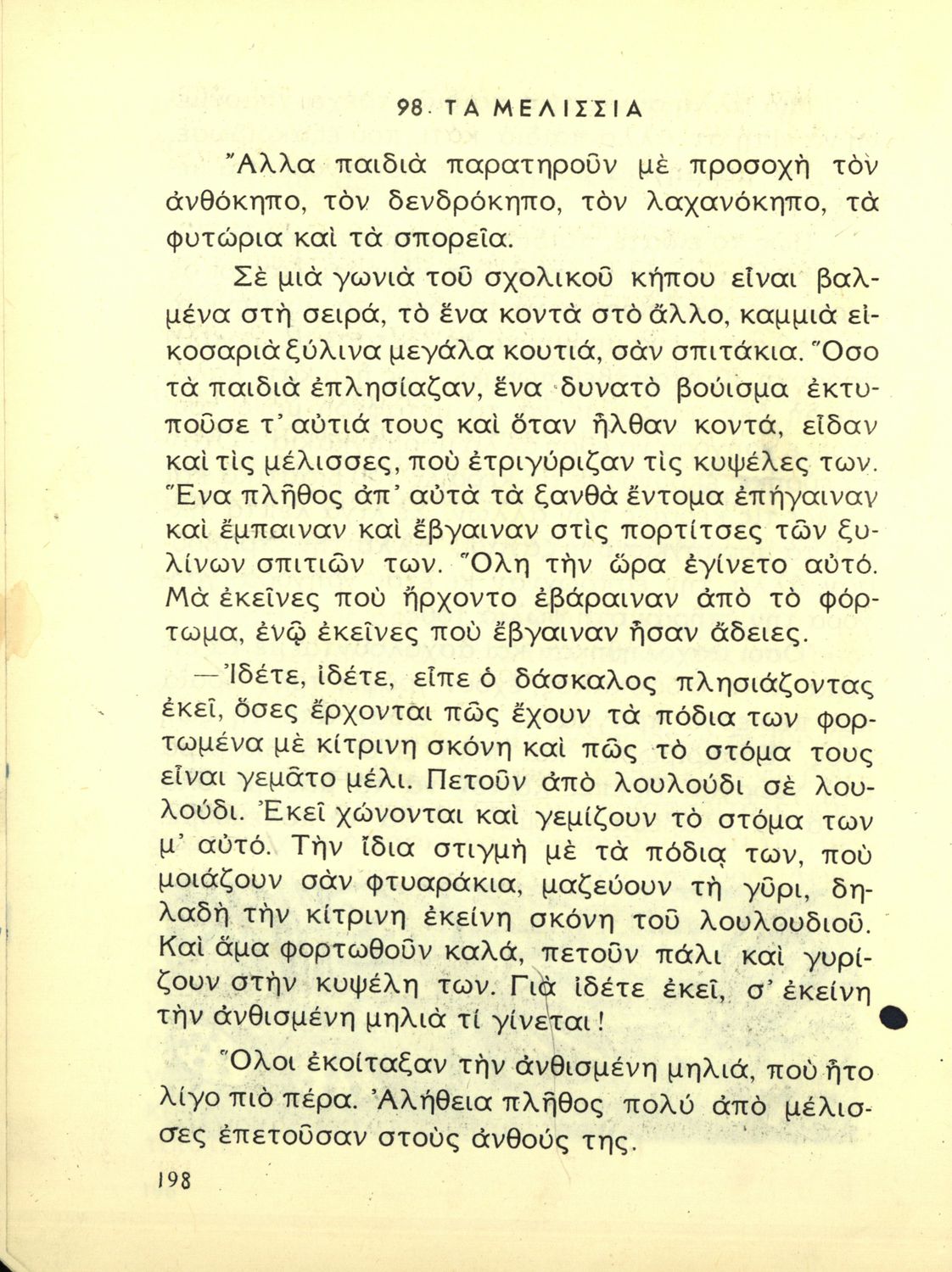 Αναγνωστικό Γ΄ Δημοτικού που περιλαμβάνει ποιήματα και πεζά εμπνευσμένα από την ελληνική φύση, τις ασχολίες των κατοίκων, την σύγχρονη ελληνική ιστορία, την ελληνική μυθολογία και τις θρησκευτικές γιορτές.