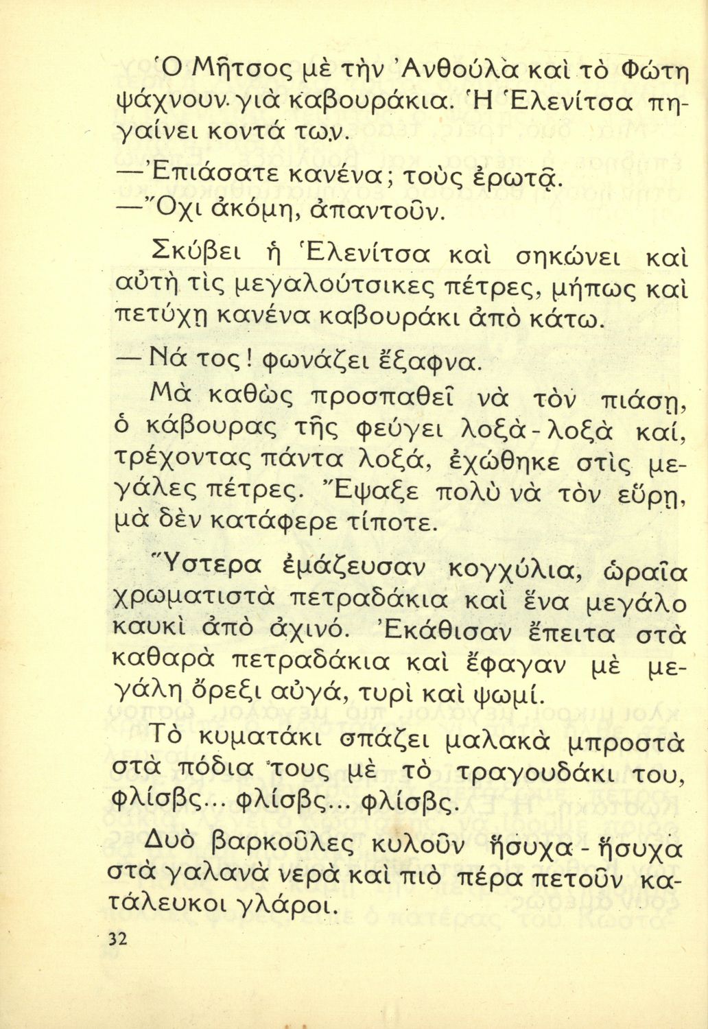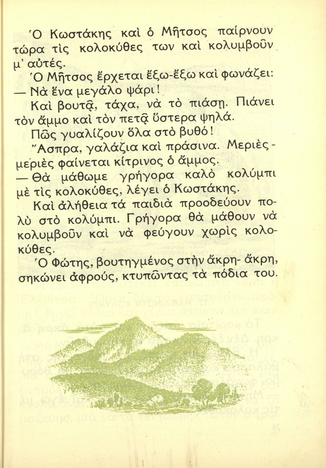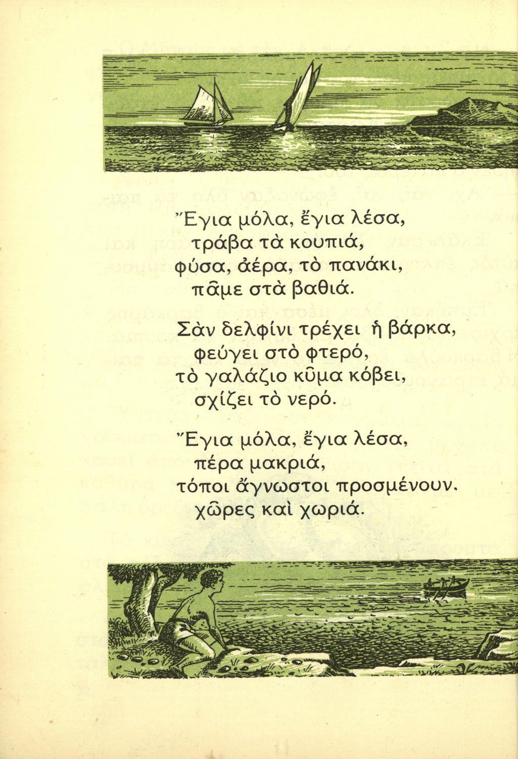 Αναγνωστικό Γ΄ Δημοτικού που περιλαμβάνει ποιήματα και πεζά εμπνευσμένα από την ελληνική φύση, τις ασχολίες των κατοίκων, την σύγχρονη ελληνική ιστορία, την ελληνική μυθολογία και τις θρησκευτικές γιορτές.