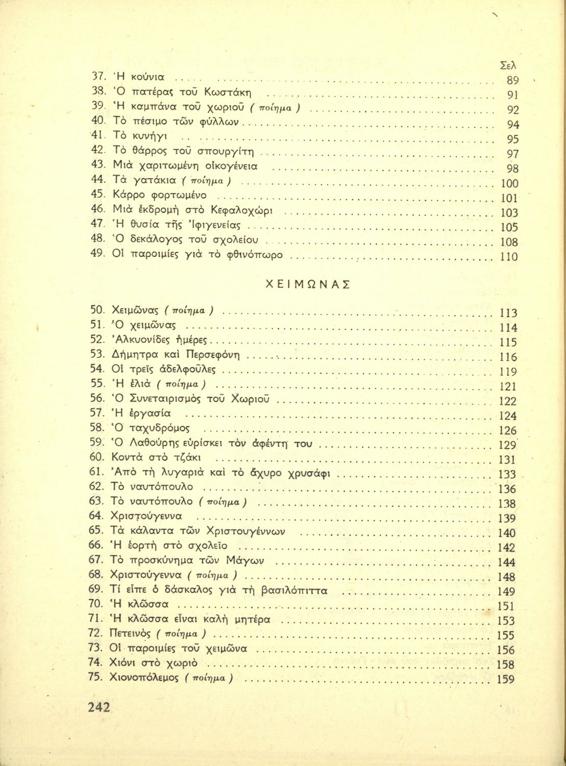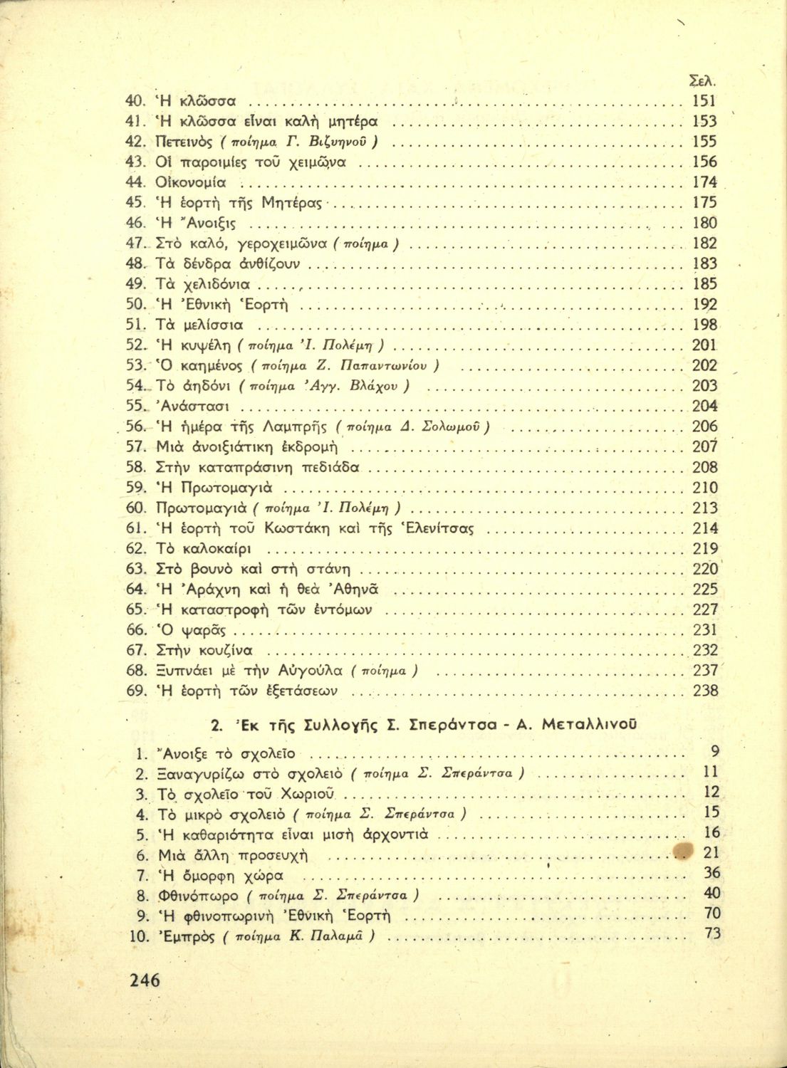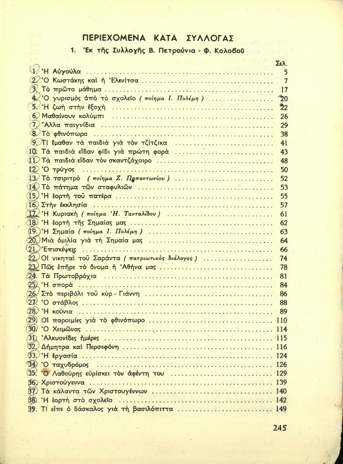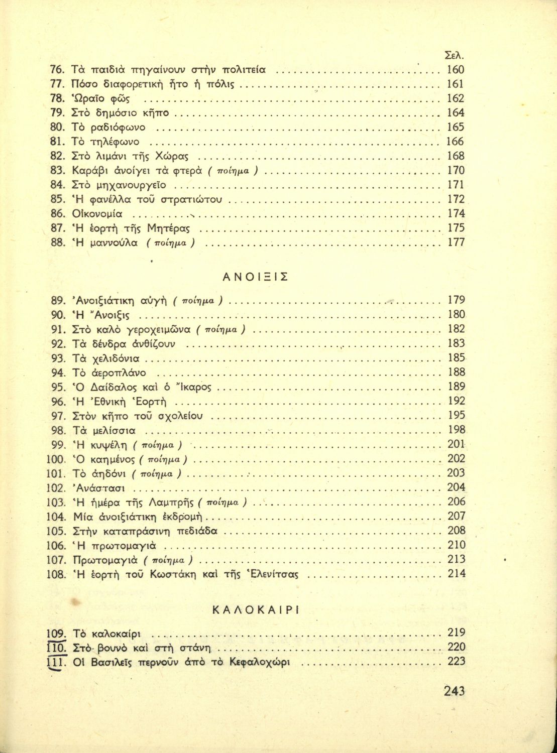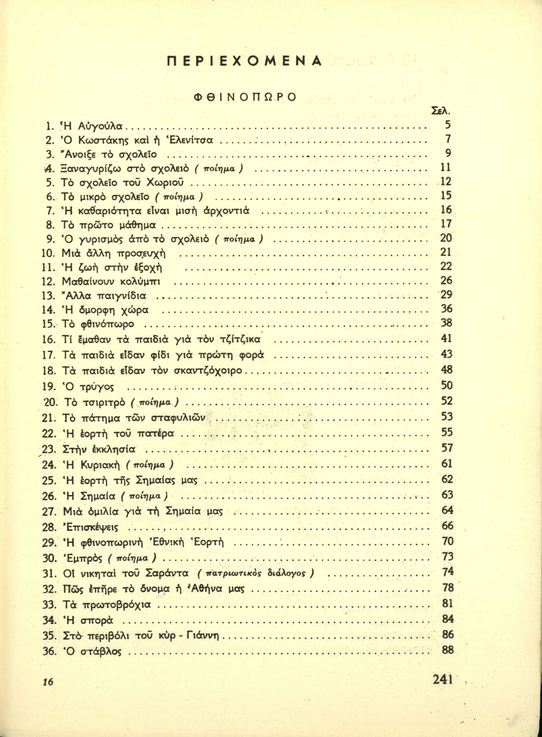 Αναγνωστικό Γ' Δημοτικού που είναι χωρισμένο σύμφωνα με τις εποχές του χρόνου και περιλαμβάνει ποιήματα και πεζά εμπνευσμένα από τη ζωή στην ύπαιθρο, την εθνική, οικογενειακή και κοινωνική ζωή, τη θρησκευτική παράδοση, τις ασχολίες των ανθρώπων, και την ελληνική φύση.