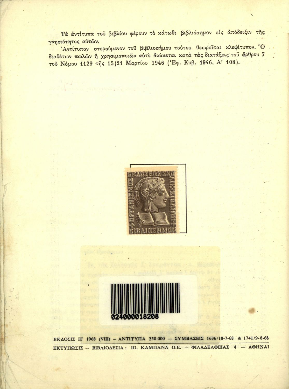 Εκδότης: Οργανισμός Εκδόσεως Διδακτικών Βιβλίων Έτος έκδοσης: 1968 Τόπος έκδοσης: Αθήνα Έκδοση: 8η Υπουργική απόφαση / Σύμβαση: 1636/18-7-1968 Έτος έγκρισης: 1968 |