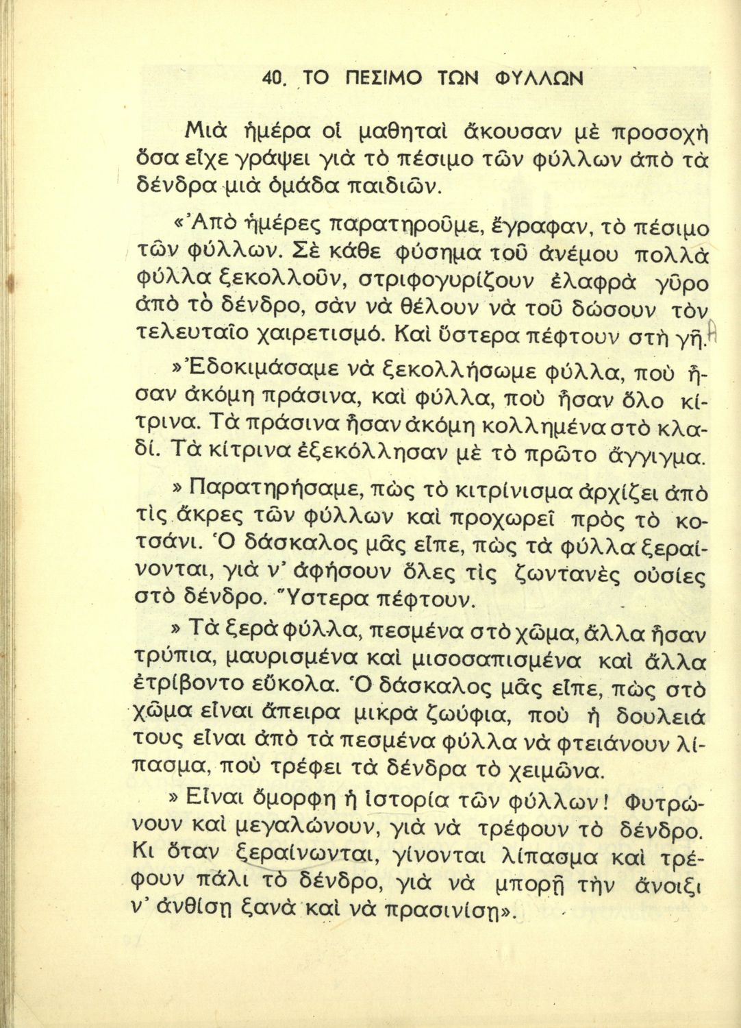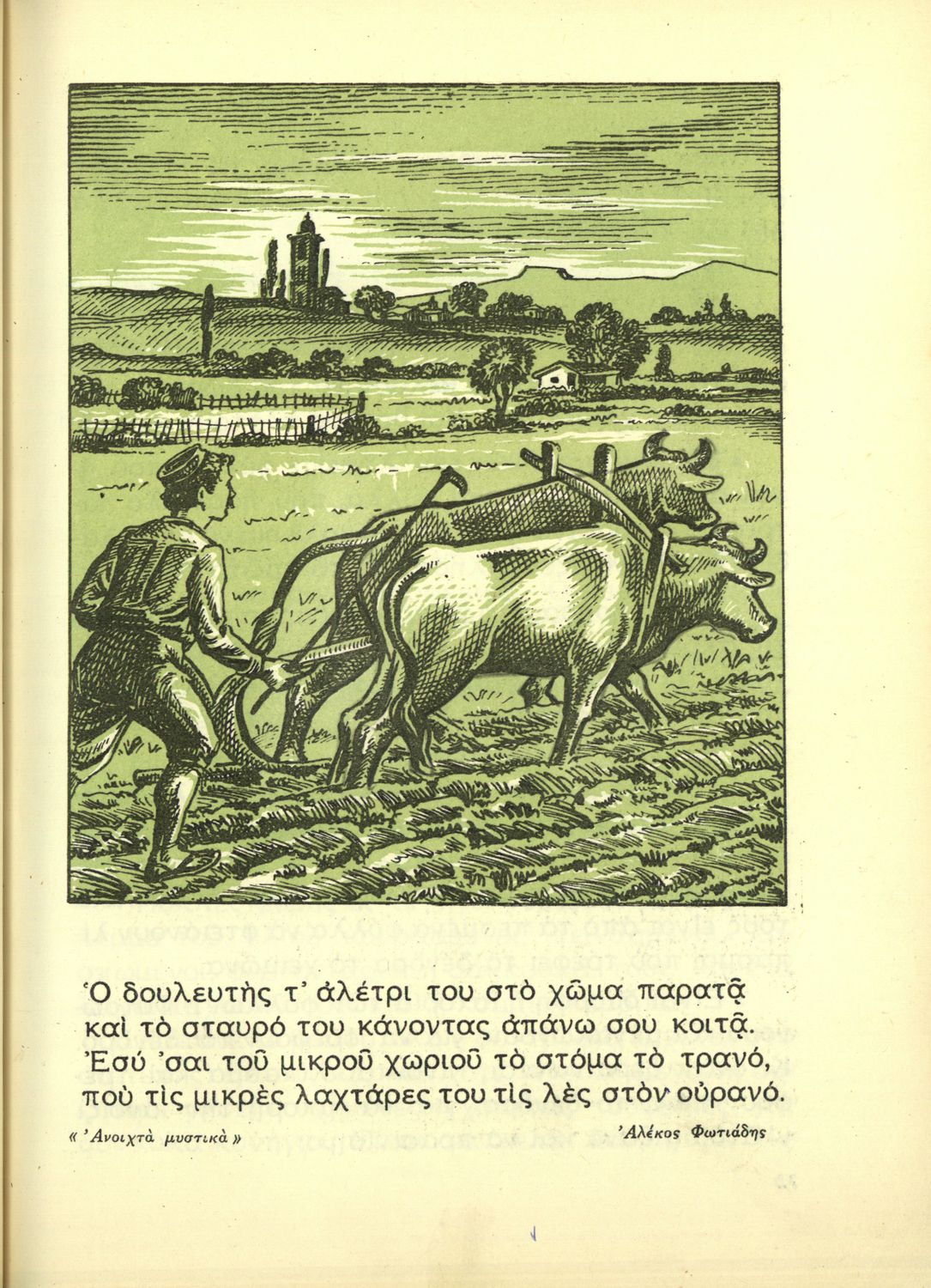 Αναγνωστικό Γ΄ Δημοτικού που περιλαμβάνει ποιήματα και πεζά εμπνευσμένα από την ελληνική φύση, τις ασχολίες των κατοίκων, την σύγχρονη ελληνική ιστορία, την ελληνική μυθολογία και τις θρησκευτικές γιορτές.
