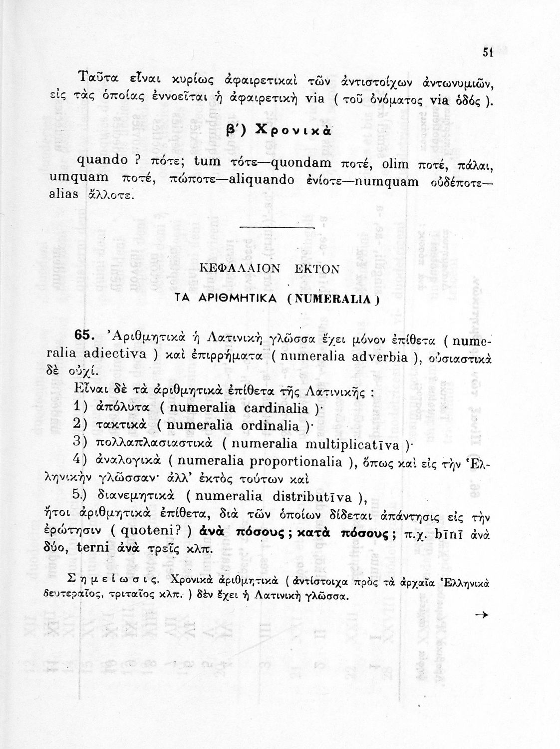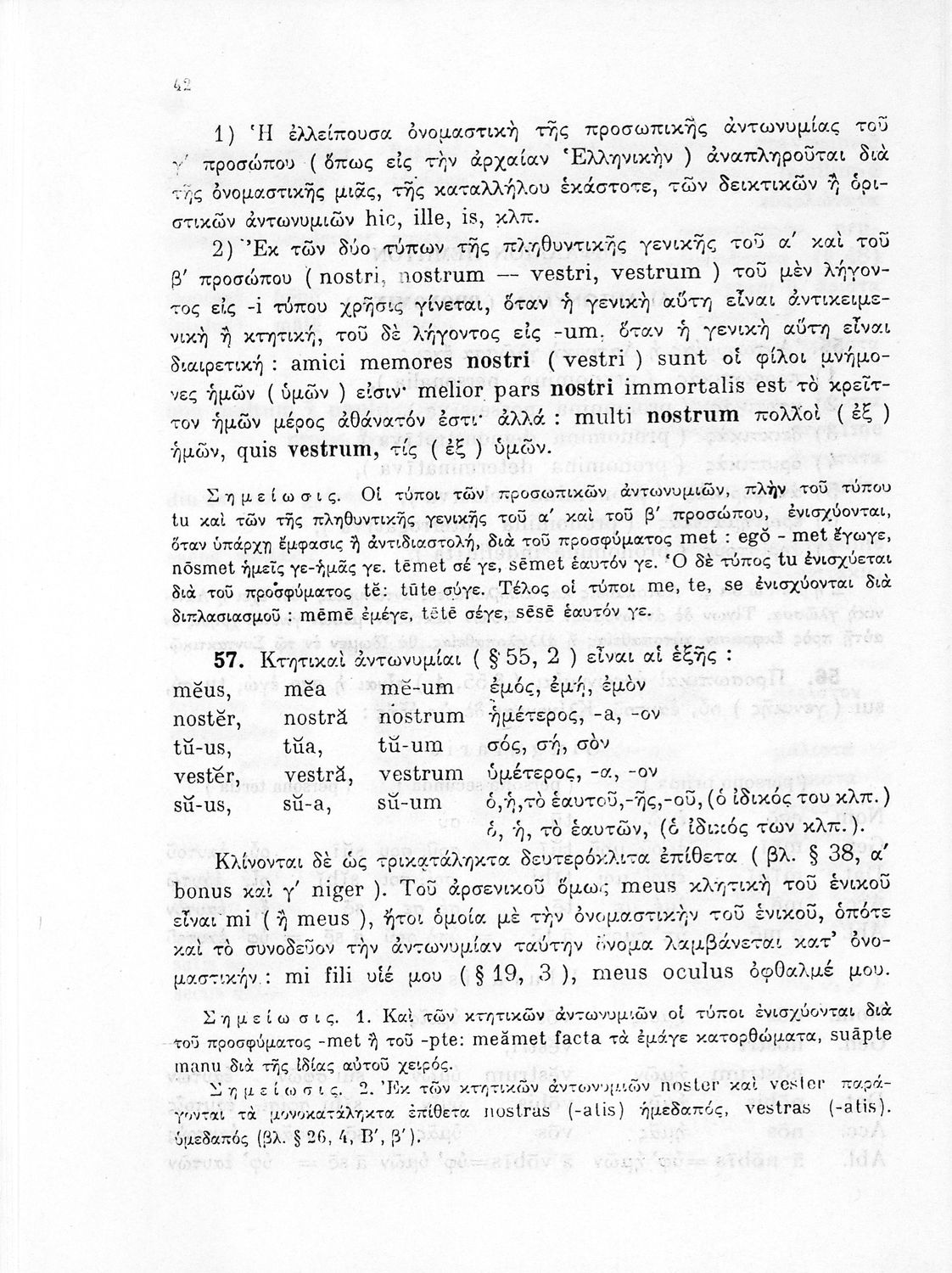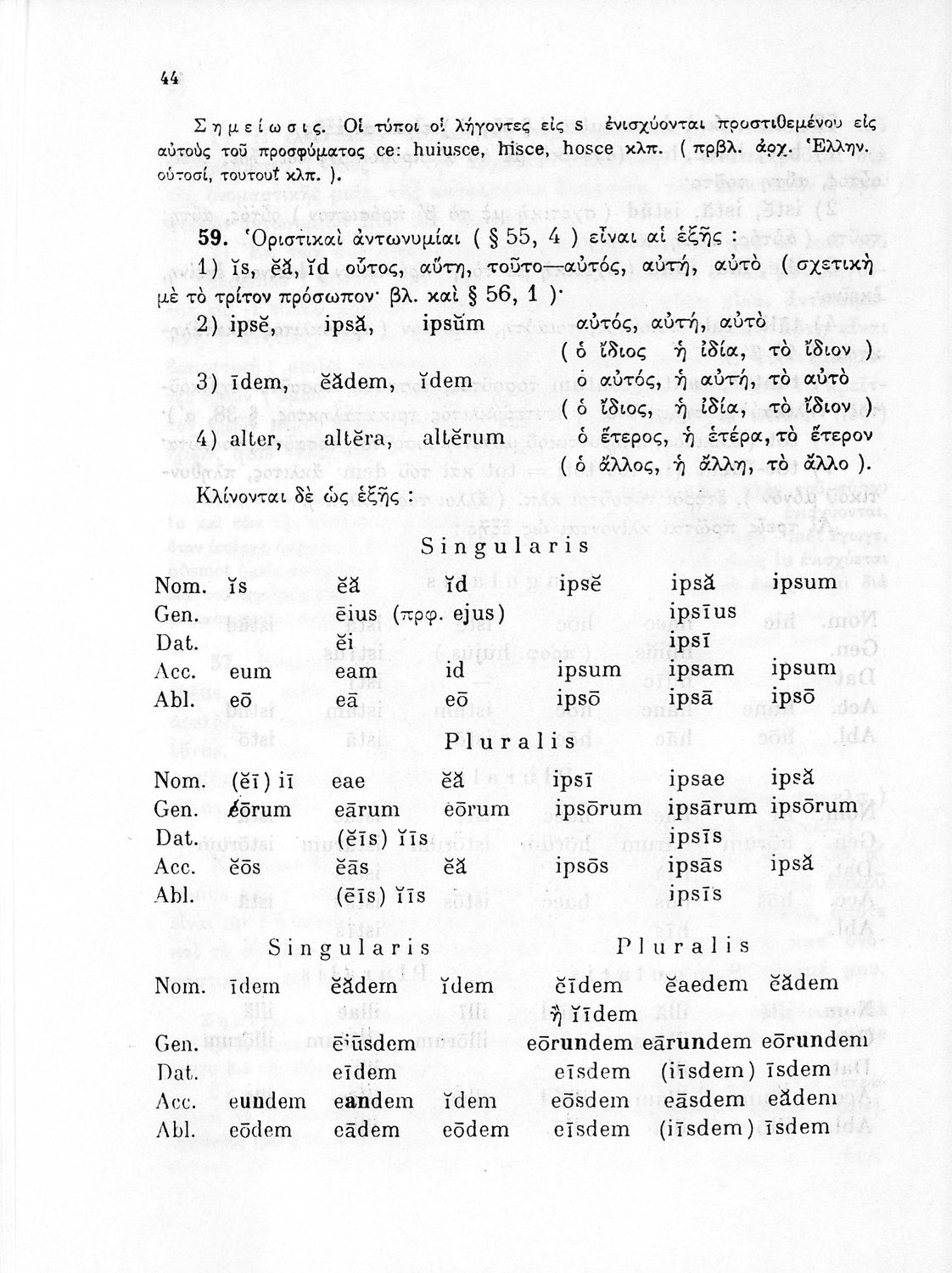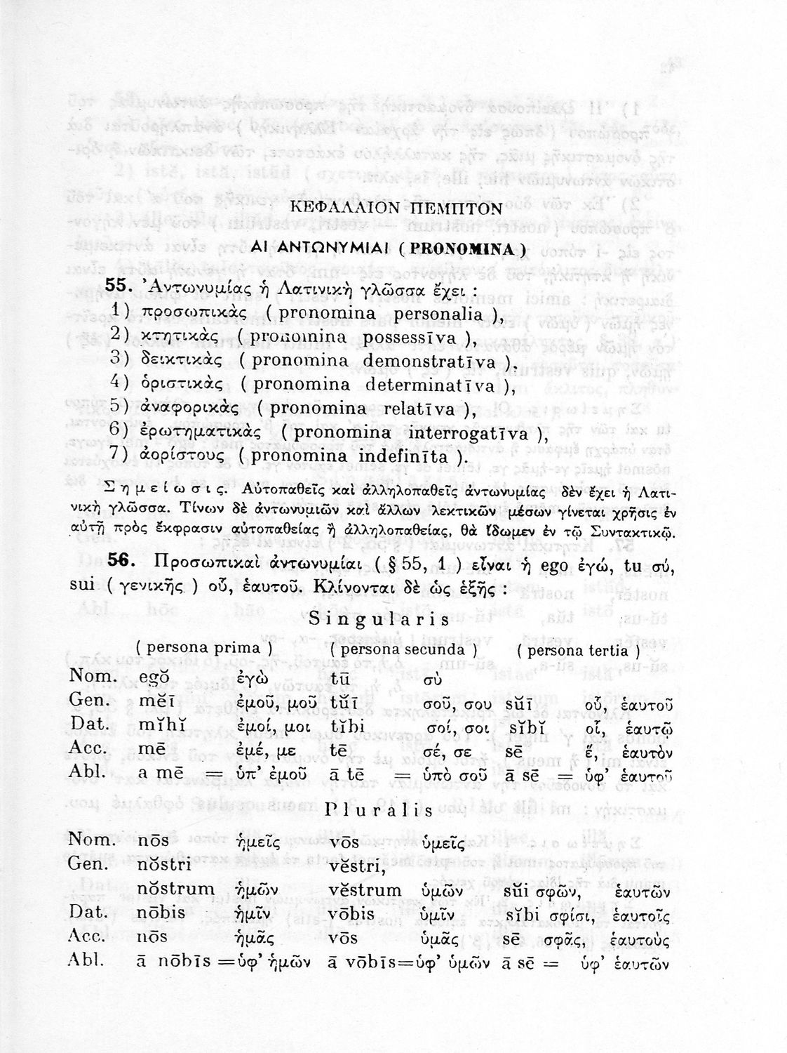 Σχολικό εγχειρίδιο Λατινικών Γυμνασίου που περιλαμβάνει γραμματική και συντακτικό και είναι χωρισμένο σε φθογγολογικό, τυπολογικό και ετυμολογικό μέρος.