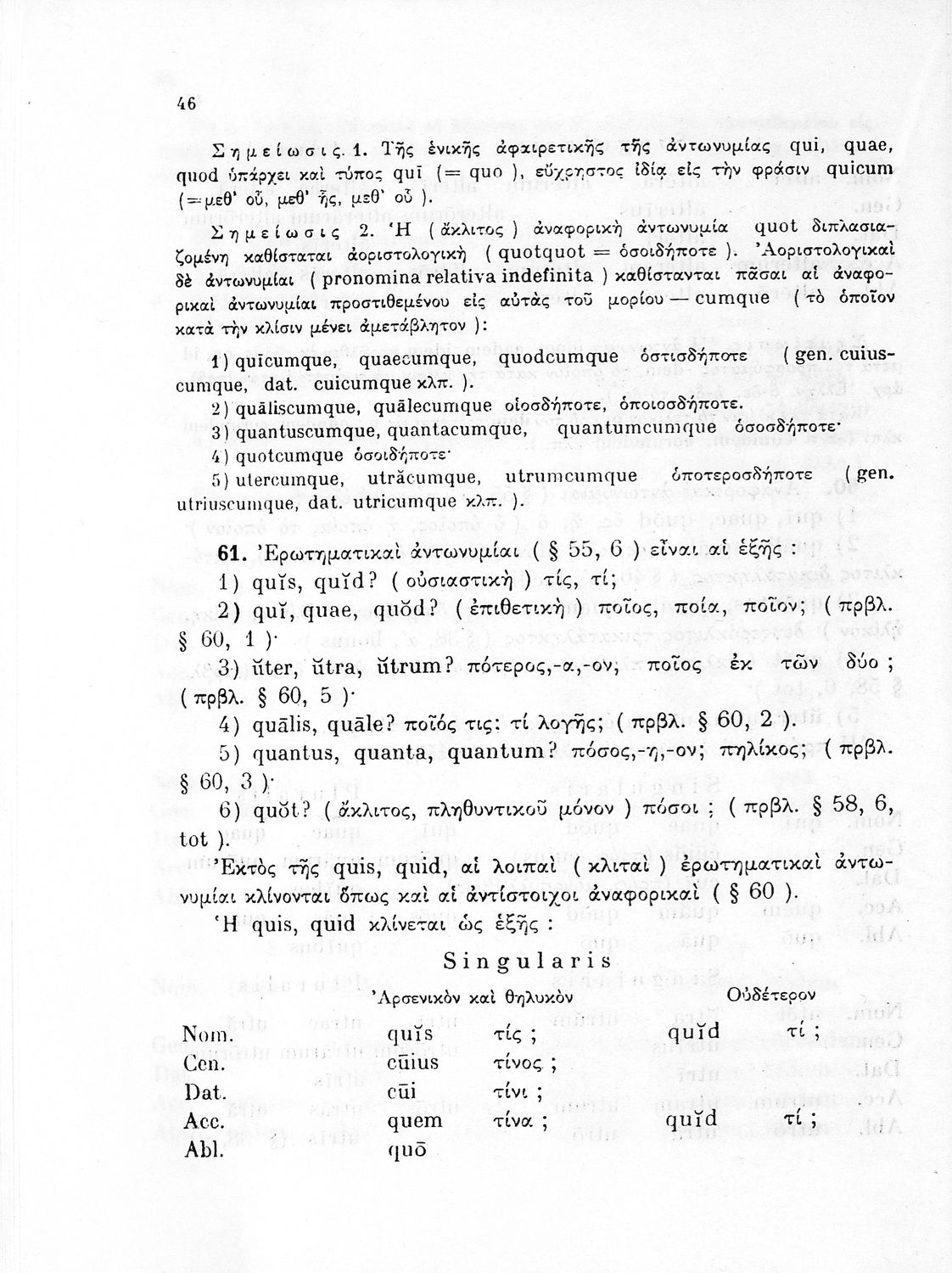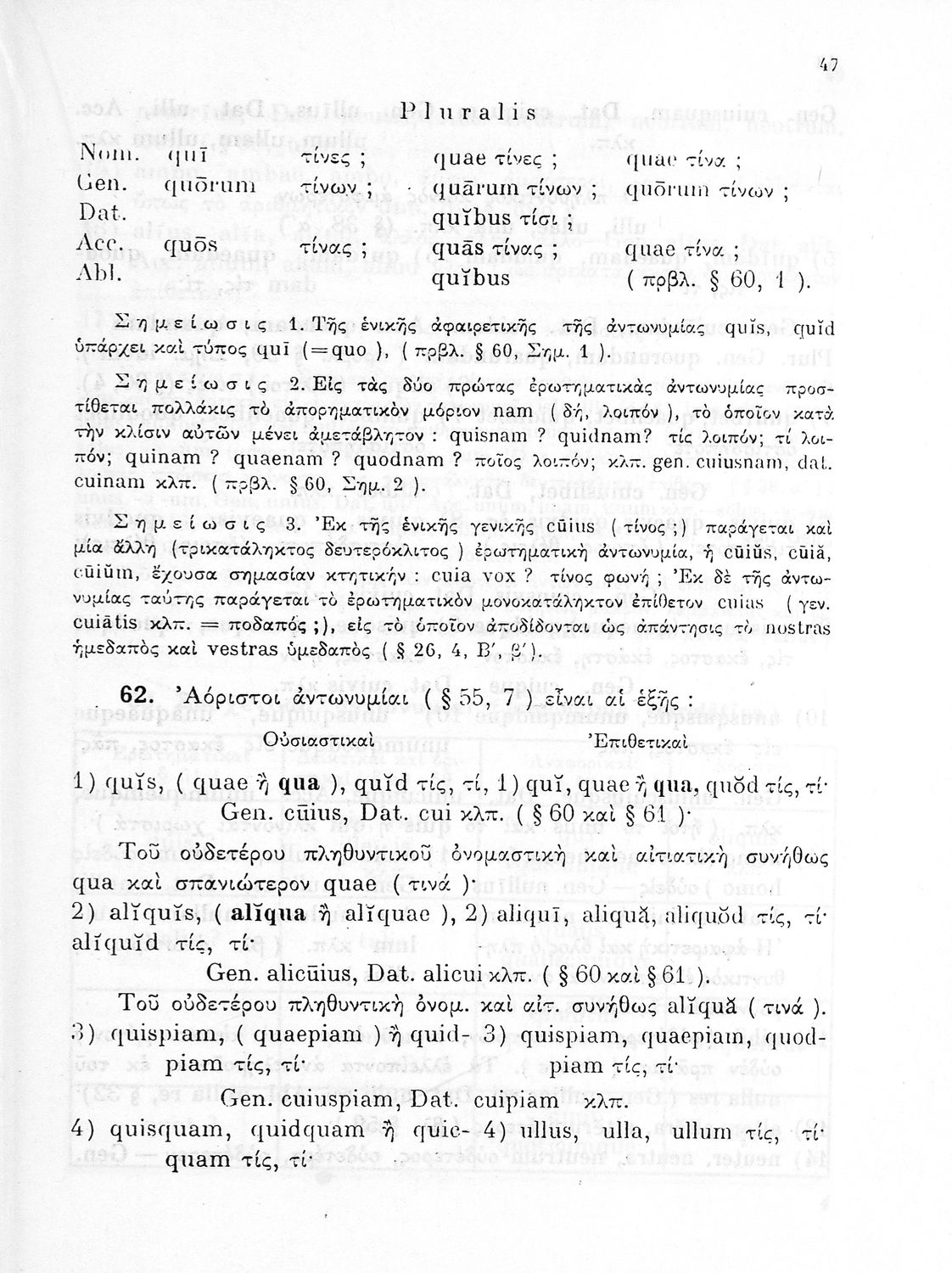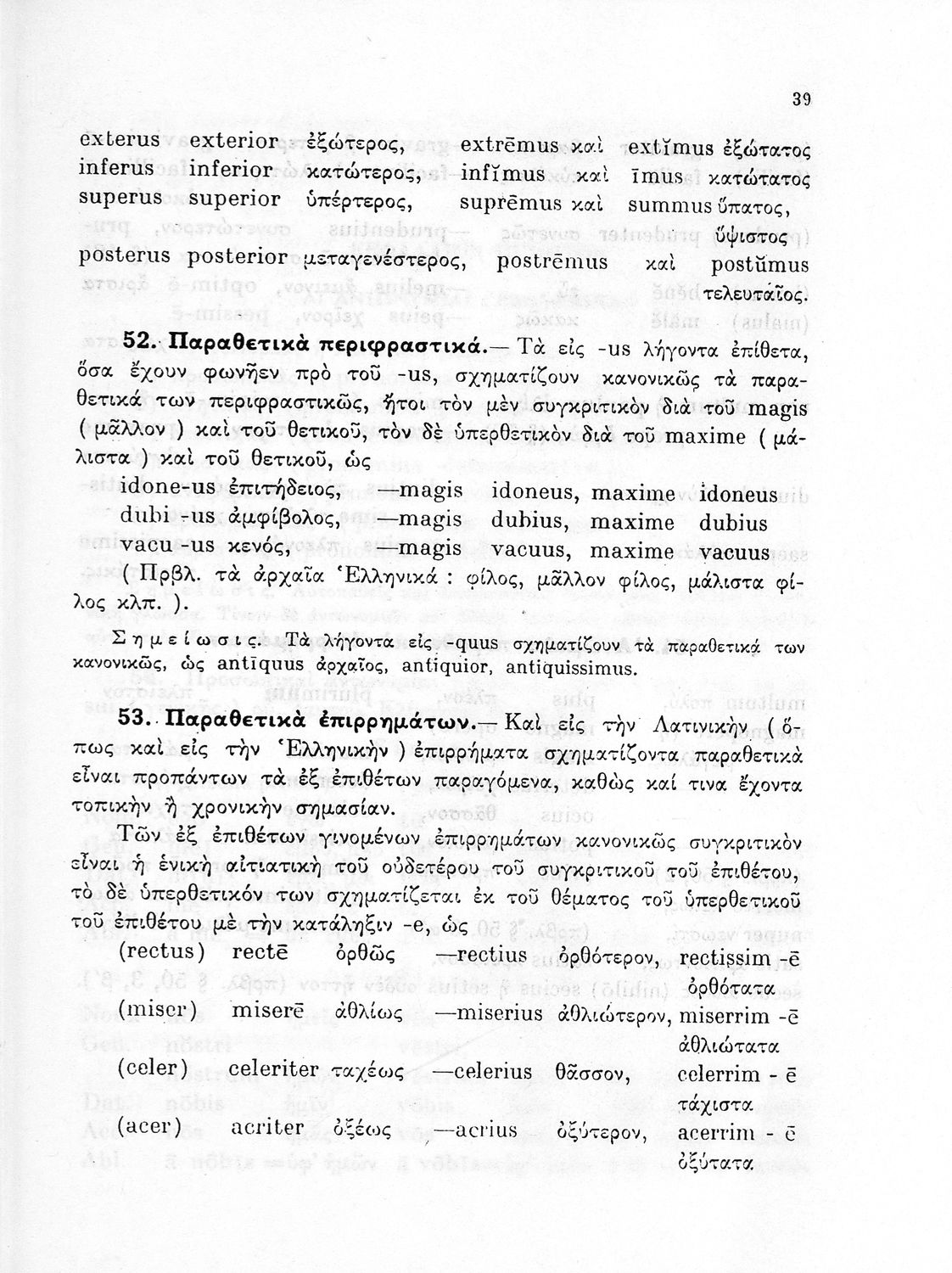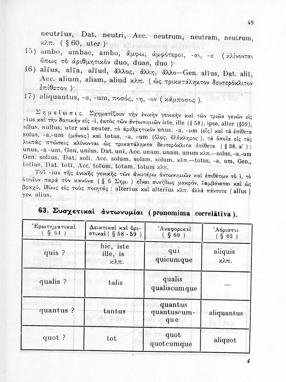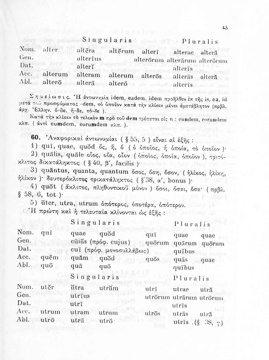 Σχολικό εγχειρίδιο Λατινικών Γυμνασίου που περιλαμβάνει γραμματική και συντακτικό και είναι χωρισμένο σε φθογγολογικό, τυπολογικό και ετυμολογικό μέρος.