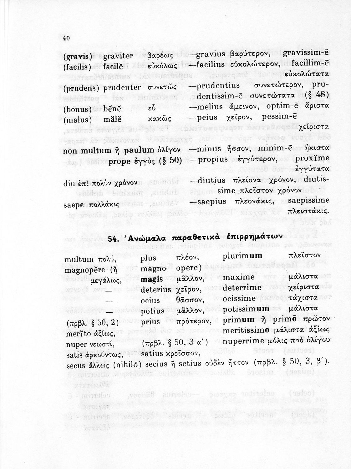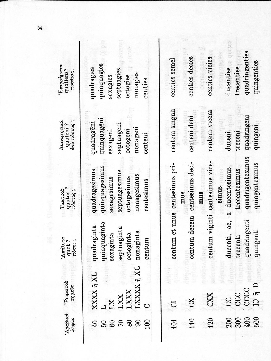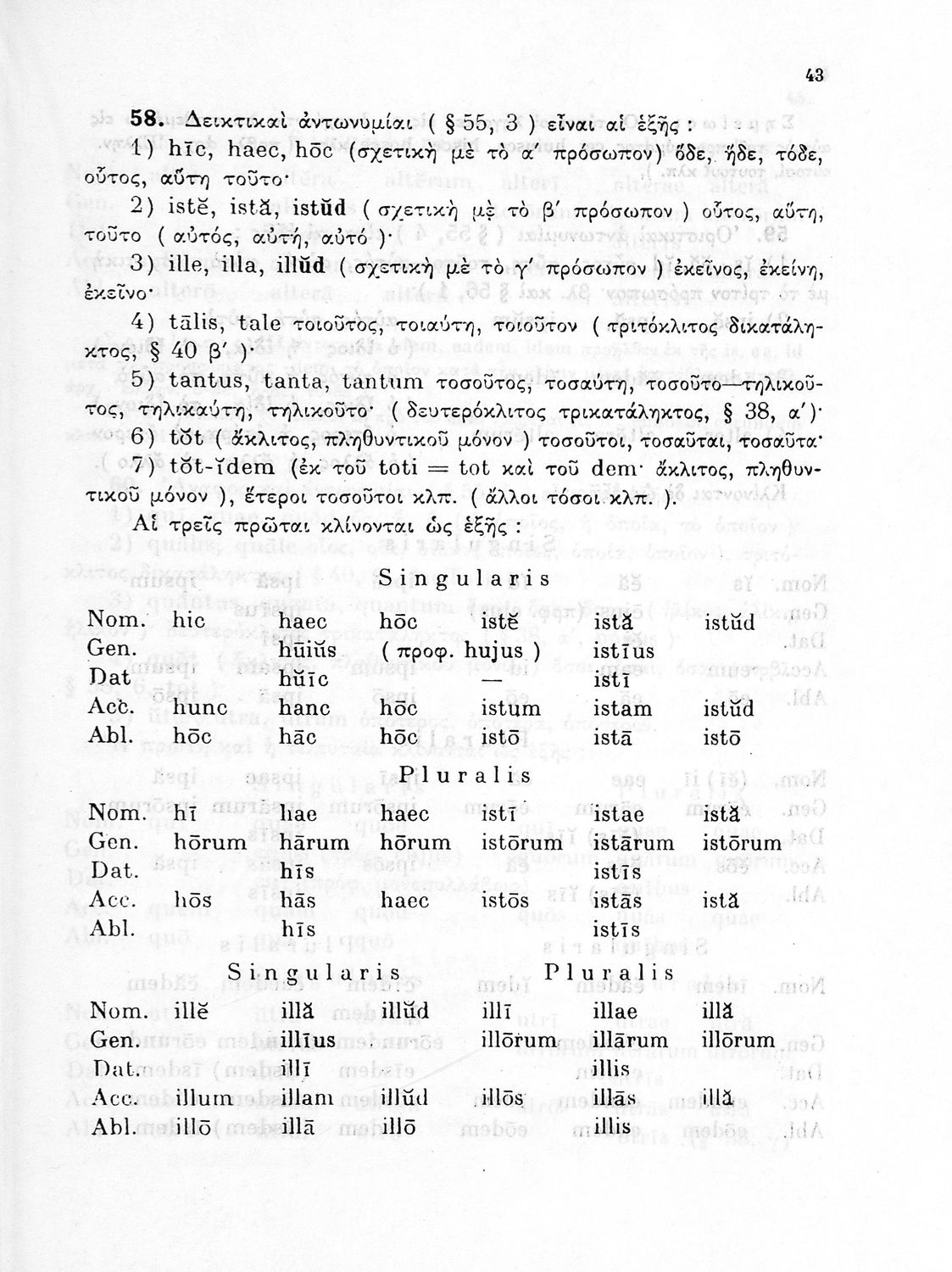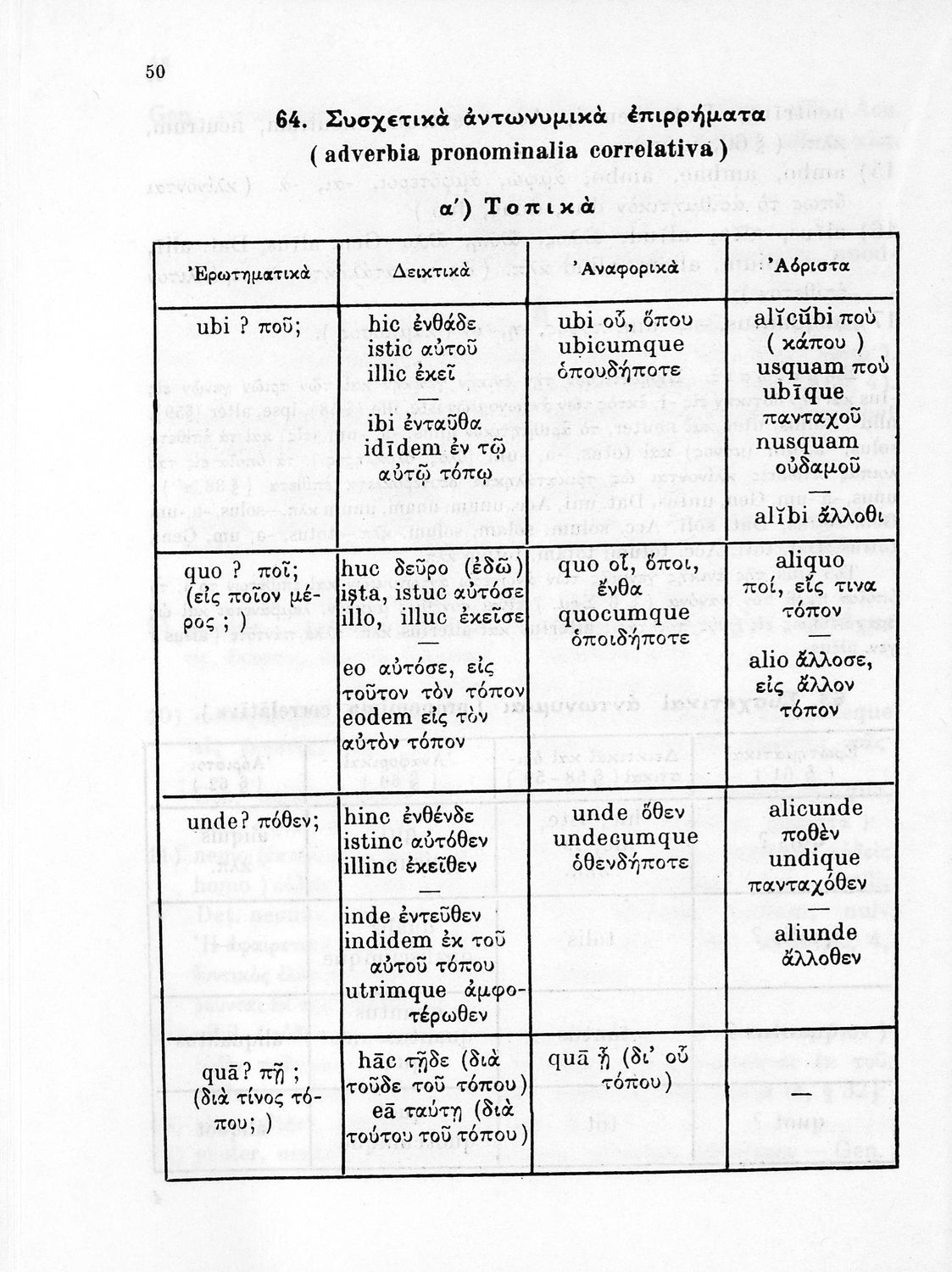 Σχολικό εγχειρίδιο Λατινικών Γυμνασίου που περιλαμβάνει γραμματική και συντακτικό και είναι χωρισμένο σε φθογγολογικό, τυπολογικό και ετυμολογικό μέρος.