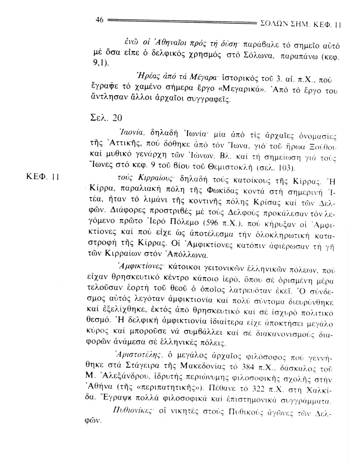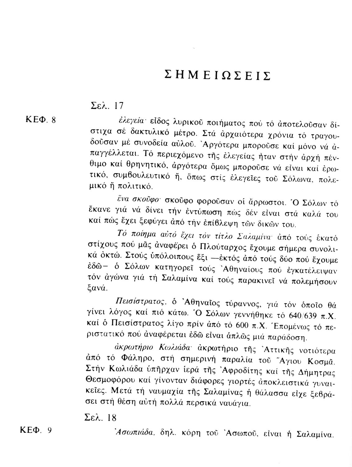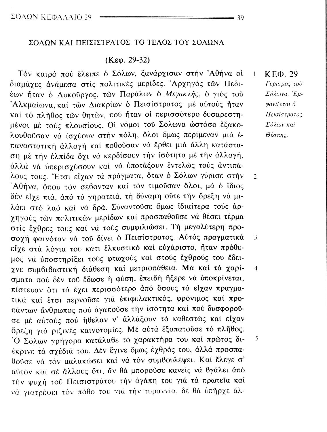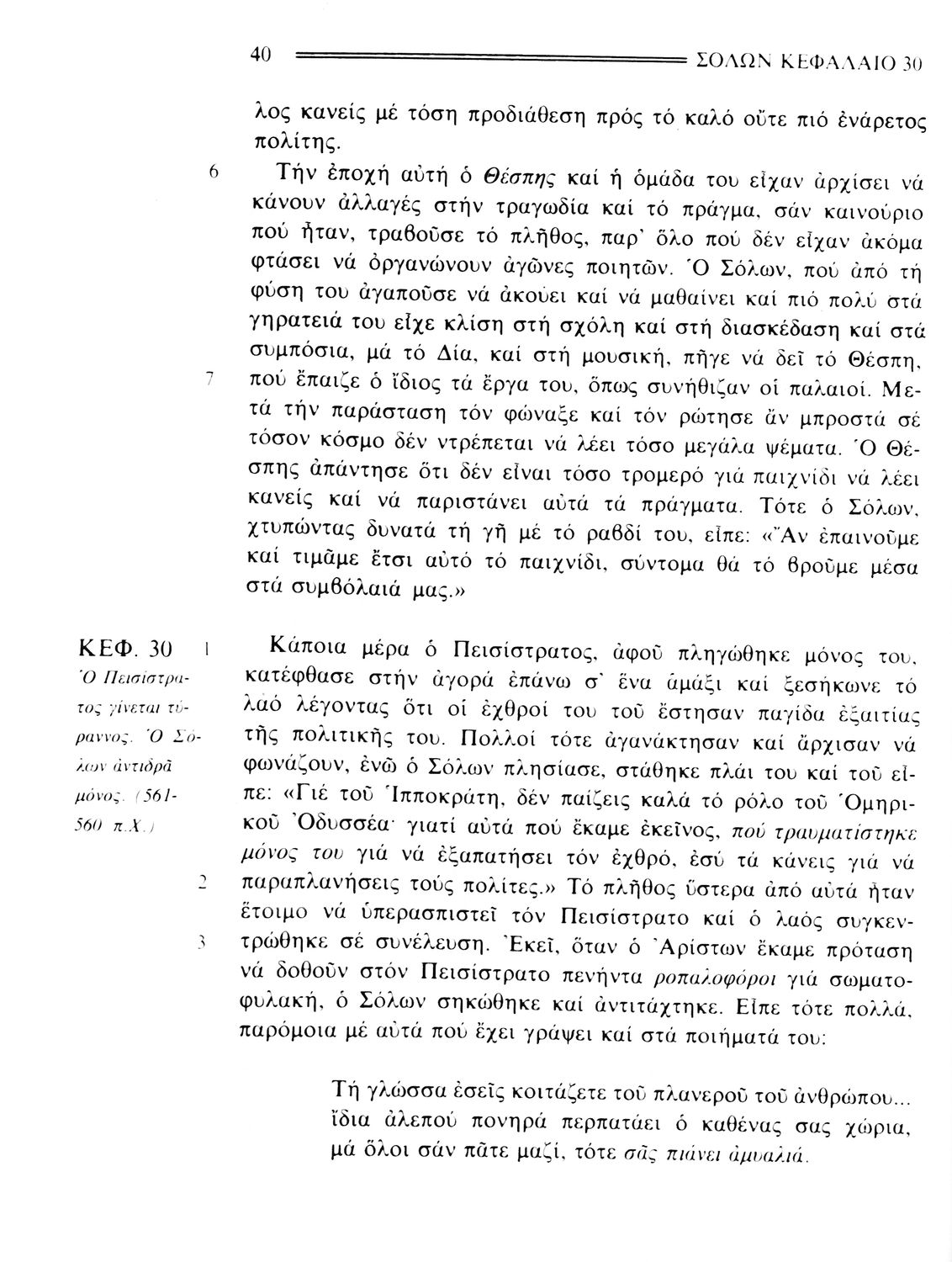 Σχολικό εγχειρίδιο Αρχαίων Ελληνικών. Αρχικά ένα εισαγωγικό σημείωμα αναφέρεται στη ζωή και το έργο του Πλουτάρχου. Ακολουθούν από το έργο του "Παράλληλοι Βίοι", σε μετάφραση, οι βιογραφίες του Σόλωνα, του ...