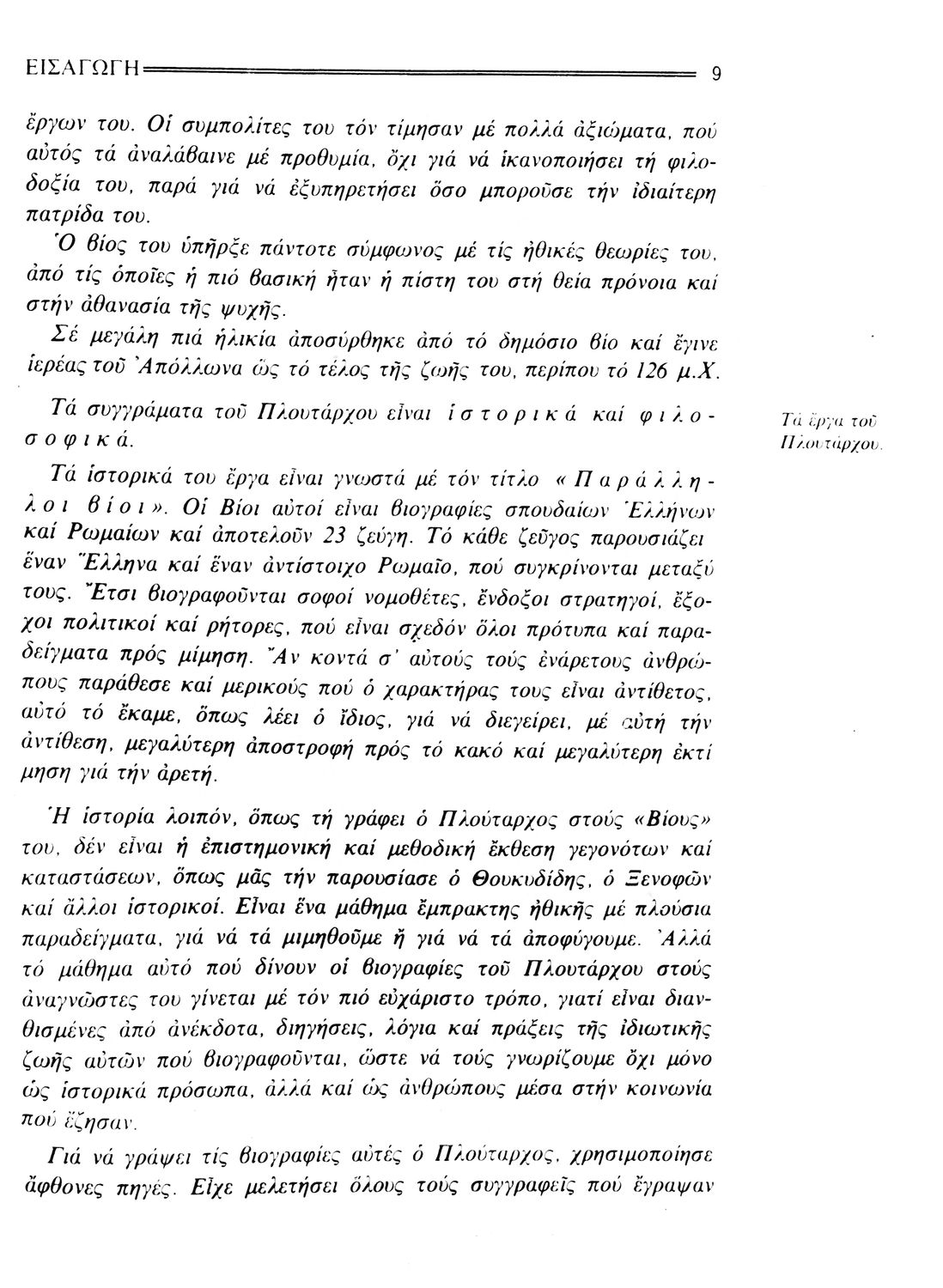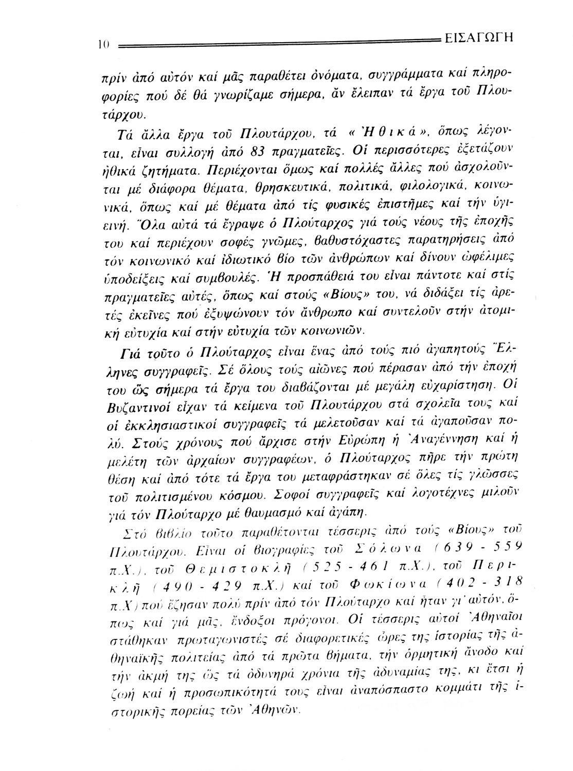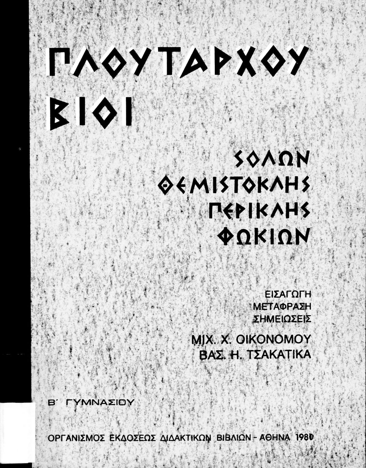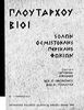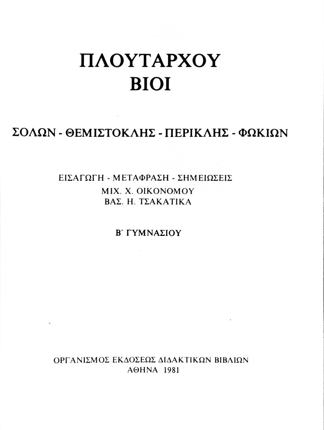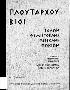 Σχολικό εγχειρίδιο Αρχαίων Ελληνικών. Το βιβλίο περιλαμβάνει εισαγωγή σχετικά με τη ζωή και το έργο του Πλουτάρχου. Η εισαγωγή και η μετάφραση των βίων του Θεμιστοκλή και του Περικλή έγιναν από τον Μιχ. Οικονόμου ενώ ο Βασ. Τσακατίκας επιμελήθηκε τους βίους του Σόλωνα και του Φωκίωνα.