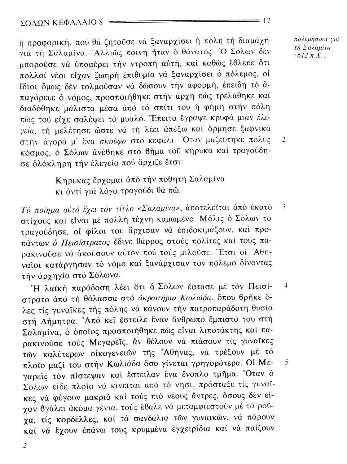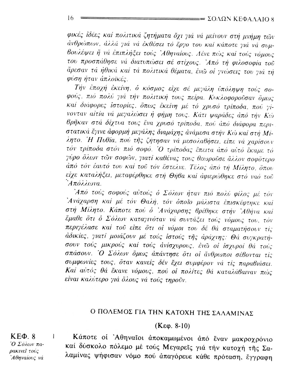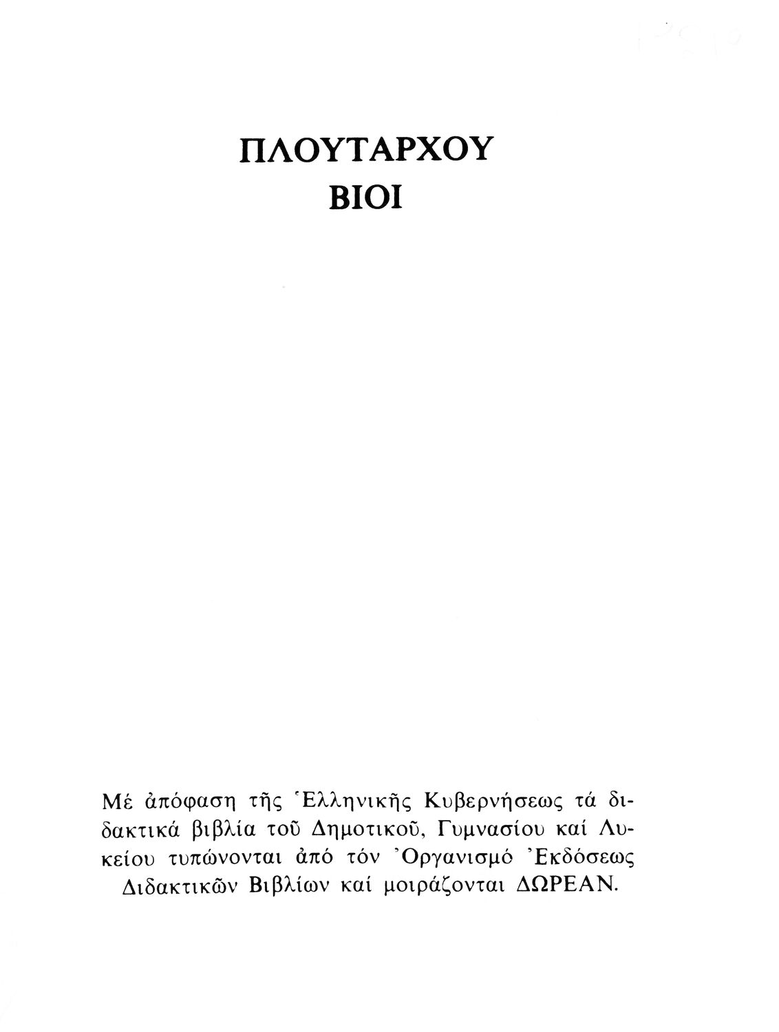 Βαθμίδα εκπαίδευσης: Δευτεροβάθμια Τάξη: Β' Γυμνασίου Μάθημα: Αρχαία Ελληνικά Γλώσσα: Δημοτική Παρουσίαση περιεχομένου: Σχολικό εγχειρίδιο Αρχαίων Ελληνικών. Το βιβλίο περιλαμβάνει εισαγωγή σχετικά με τη ζωή και το έργο του Πλουτάρχου. Η εισαγωγή και η μετάφραση των βίων του Θεμιστοκλή και του Περικλή έγιναν από τον Μιχ. Οικονόμου ενώ ο Βασ. Τσακατίκας επιμελήθηκε τους βίους του Σόλωνα και του Φωκίωνα. |