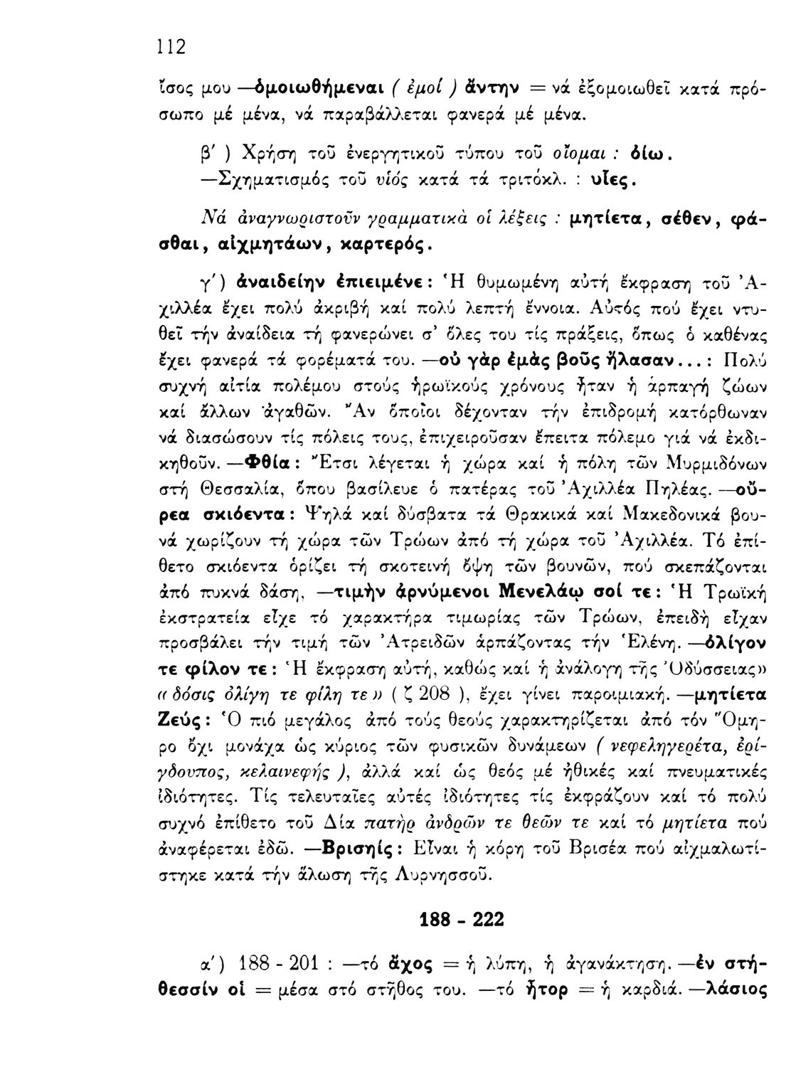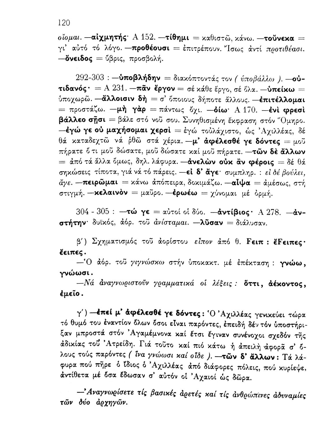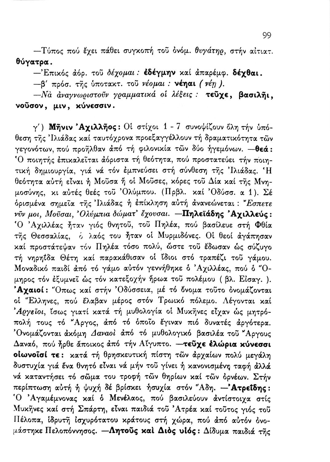 Σχολικό εγχειρίδιο Αρχαίων Ελληνικών που περιέχει εισαγωγικό σημείωμα σχετικά με το περιεχόμενο της Ιλιάδας του Ομήρου και την εποχή στην οποία αναφέρεται ο μύθος. Σε πρωτότυπο κείμενο περιλαμβάνονται αποσπάσματα από τις Ραψωδίες της Ιλιάδας Α, Γ, Ε, Ζ, Ι, Ω και παρεμβάλλονται συνδετικές περιλήψεις μεταξύ των ραψωδιών στη δημοτική γλώσσα. Τέλος, περιέχονται ερμηνευτικές σημειώσεις (σημασιολογικές, γραμματικές, πραγματολογικές) και παράρτημα εικόνων και χαρτών.