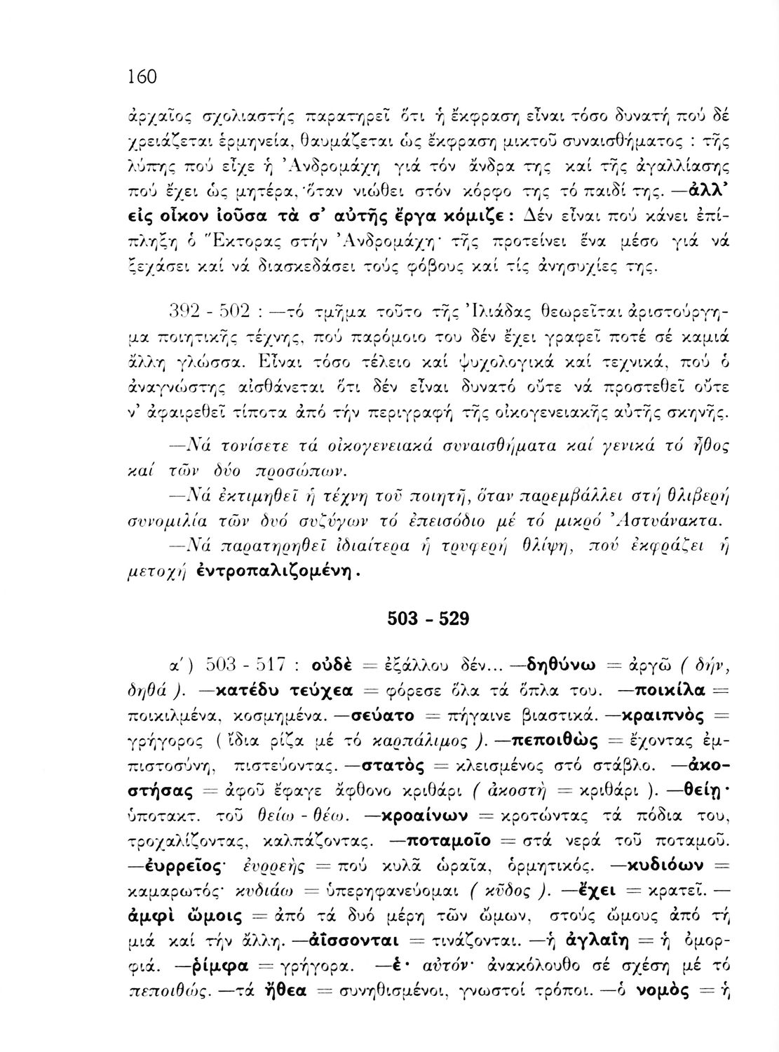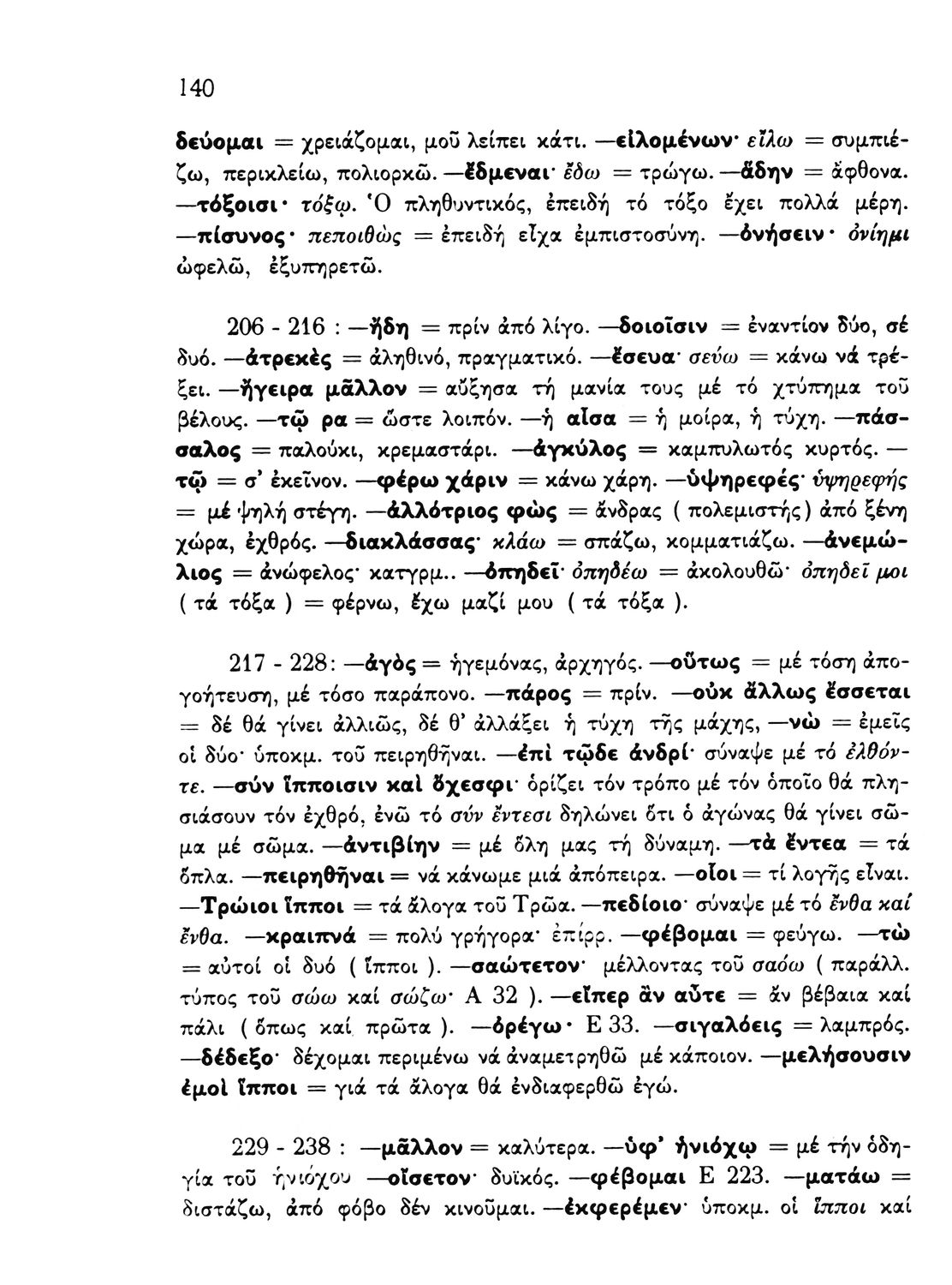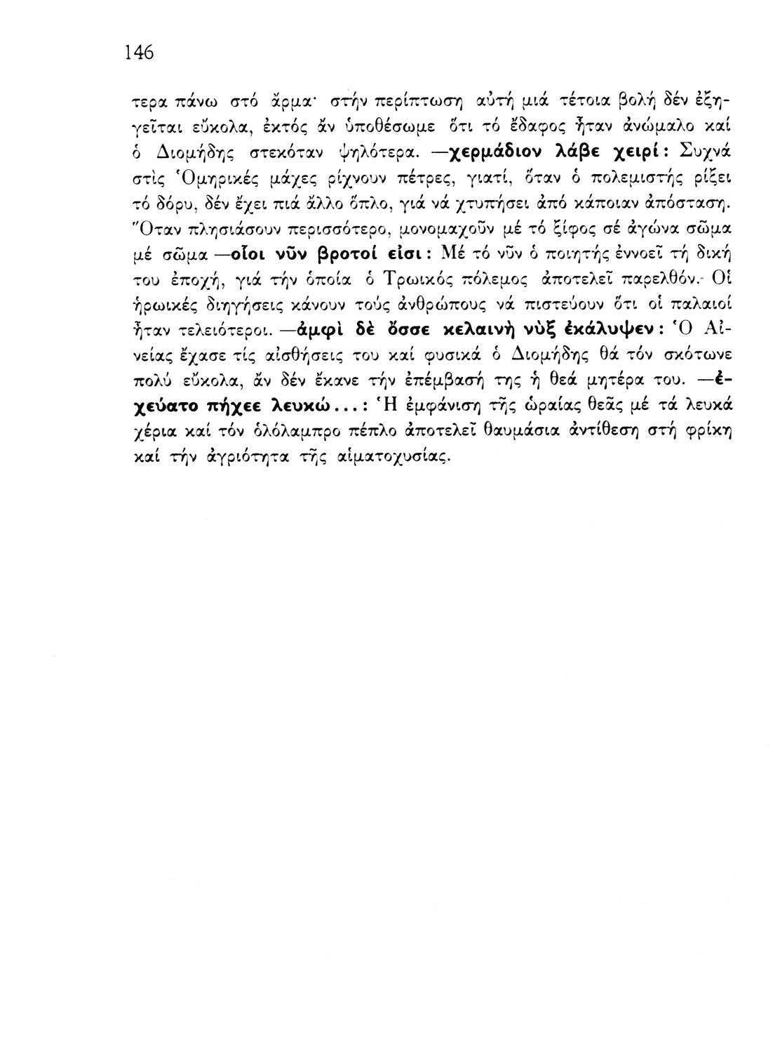 Σχολικό εγχειρίδιο Αρχαίων Ελληνικών που περιέχει εισαγωγικό σημείωμα σχετικά με το περιεχόμενο της Ιλιάδας του Ομήρου και την εποχή στην οποία αναφέρεται ο μύθος. Σε πρωτότυπο κείμενο περιλαμβάνονται αποσπάσματα από τις Ραψωδίες της Ιλιάδας Α, Γ, Ε, Ζ, Ι, Ω και παρεμβάλλονται συνδετικές περιλήψεις μεταξύ των ραψωδιών στη δημοτική γλώσσα. Τέλος, περιέχονται ερμηνευτικές σημειώσεις (σημασιολογικές, γραμματικές, πραγματολογικές) και παράρτημα εικόνων και χαρτών.