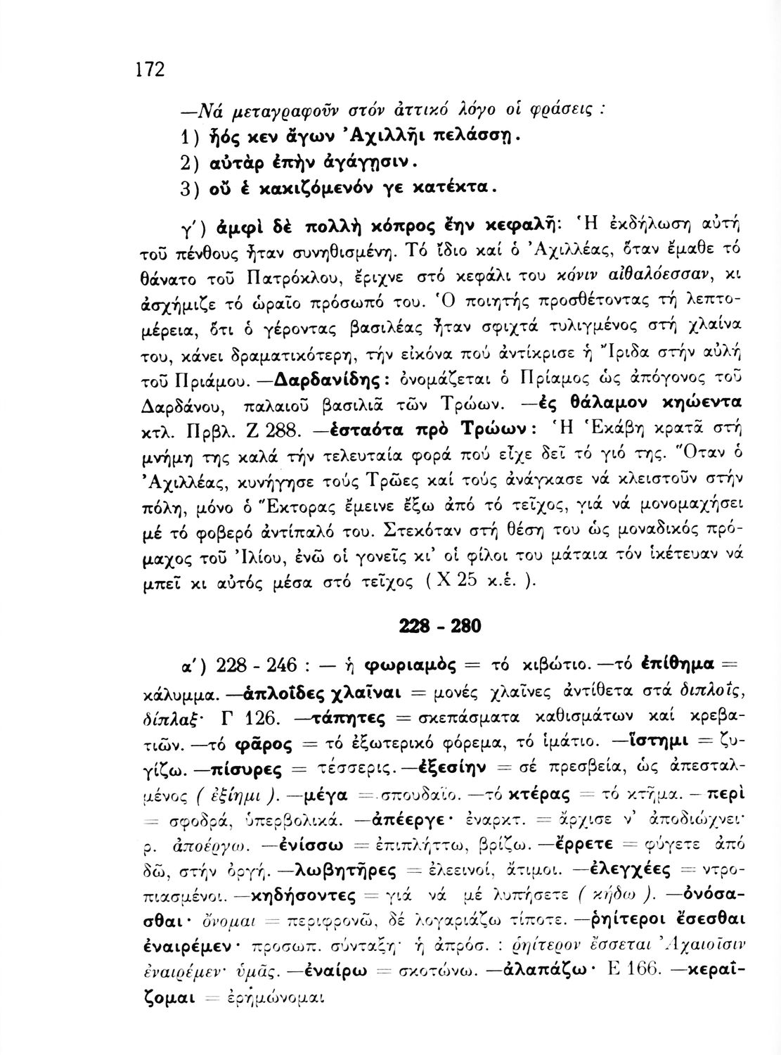 Σχολικό εγχειρίδιο Αρχαίων Ελληνικών που περιέχει εισαγωγικό σημείωμα σχετικά με το περιεχόμενο της Ιλιάδας του Ομήρου και την εποχή στην οποία αναφέρεται ο μύθος. Σε πρωτότυπο κείμενο περιλαμβάνονται αποσπάσματα από τις Ραψωδίες της Ιλιάδας Α, Γ, Ε, Ζ, Ι, Ω και παρεμβάλλονται συνδετικές περιλήψεις μεταξύ των ραψωδιών στη δημοτική γλώσσα. Τέλος, περιέχονται ερμηνευτικές σημειώσεις (σημασιολογικές, γραμματικές, πραγματολογικές) και παράρτημα εικόνων και χαρτών.