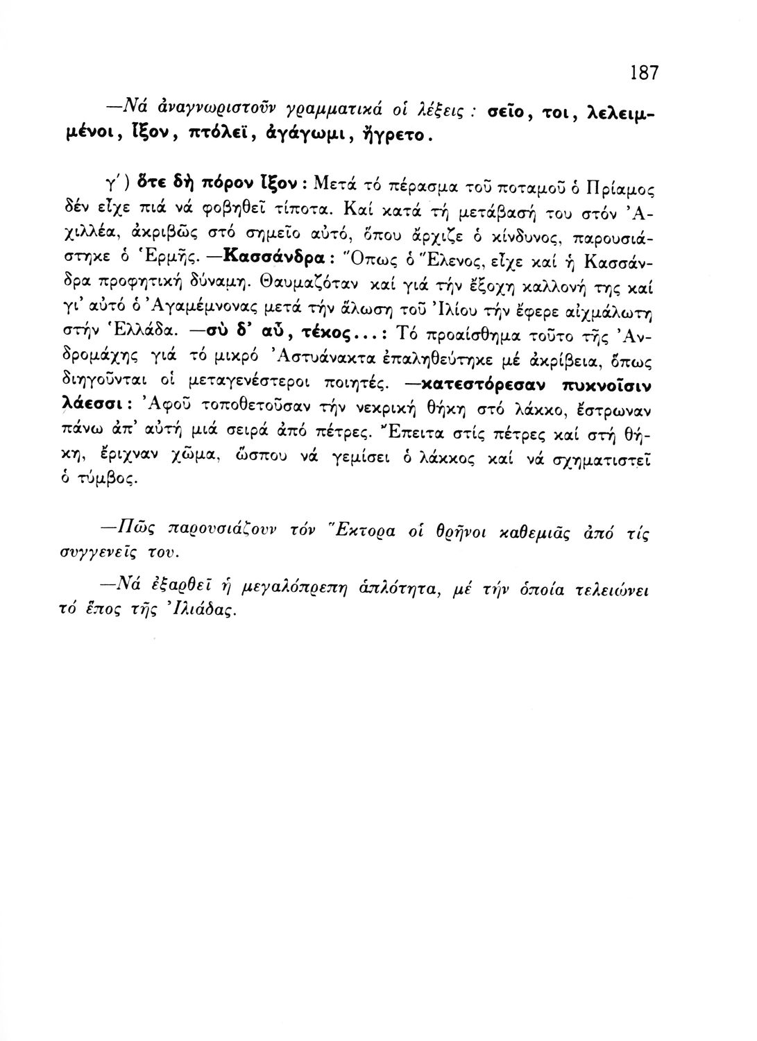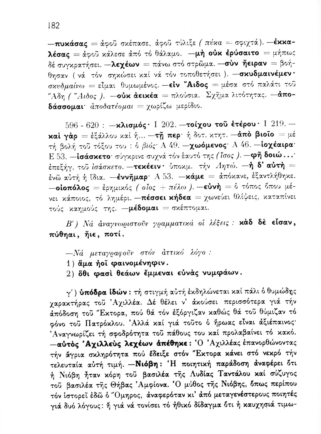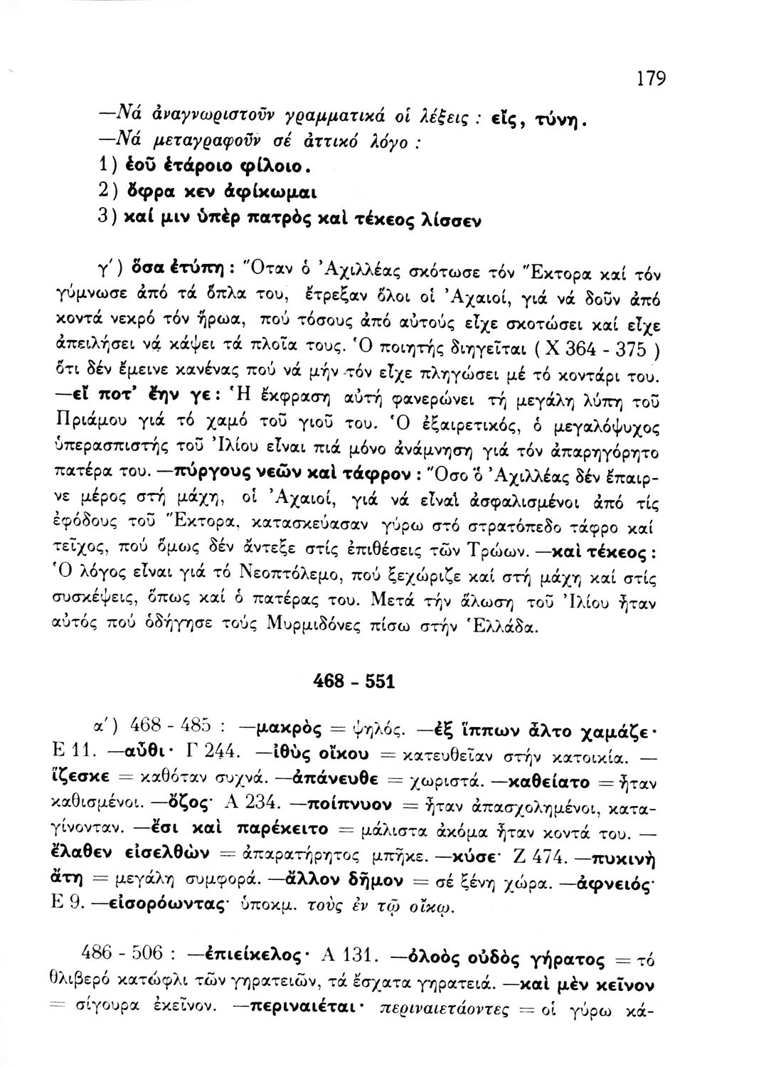 520 ## _aΣχολικό εγχειρίδιο Αρχαίων Ελληνικών που περιέχει εισαγωγικό σημείωμα σχετικά με το περιεχόμενο της Ιλιάδας του Ομήρου και την εποχή στην οποία αναφέρεται ο μύθος. Σε πρωτότυπο κείμενο περιλαμβάνονται αποσπάσματα από τις Ραψωδίες της Ιλιάδας Α, Γ, Ε, Ζ, Ι, Ω και παρεμβάλλονται συνδετικές περιλήψεις μεταξύ των ραψωδιών στη δημοτική γλώσσα. Τέλος, περιέχονται ερμηνευτικές σημειώσεις (σημασιολογικές, γραμματικές, πραγματολογικές) και παράρτημα εικόνων και χαρτών.