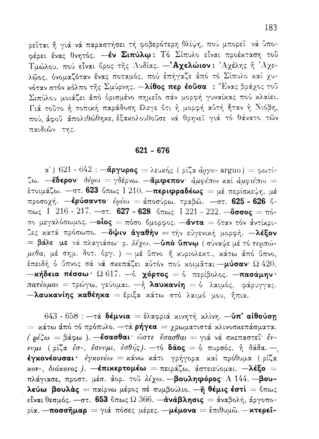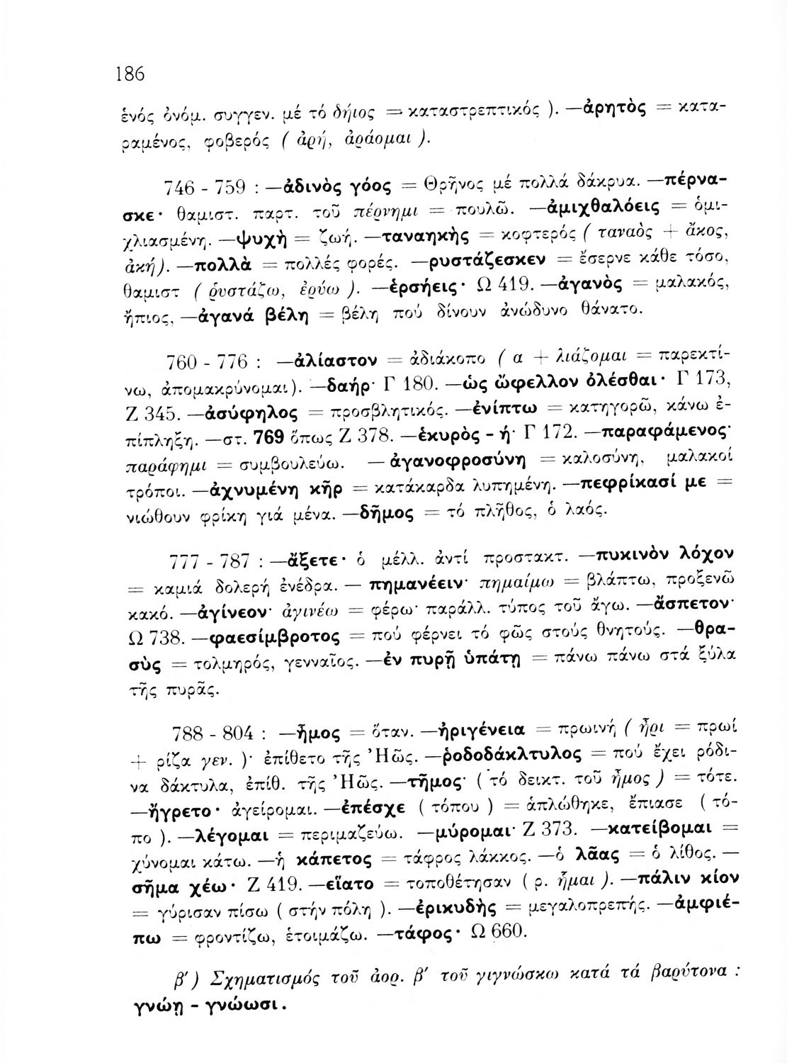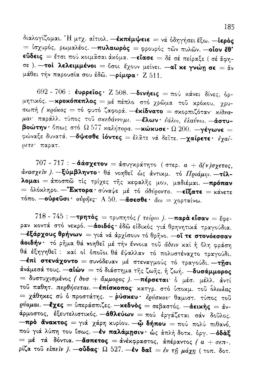 520 ## _aΣχολικό εγχειρίδιο Αρχαίων Ελληνικών που περιέχει εισαγωγικό σημείωμα σχετικά με το περιεχόμενο της Ιλιάδας του Ομήρου και την εποχή στην οποία αναφέρεται ο μύθος. Σε πρωτότυπο κείμενο περιλαμβάνονται αποσπάσματα από τις Ραψωδίες της Ιλιάδας Α, Γ, Ε, Ζ, Ι, Ω και παρεμβάλλονται συνδετικές περιλήψεις μεταξύ των ραψωδιών στη δημοτική γλώσσα. Τέλος, περιέχονται ερμηνευτικές σημειώσεις (σημασιολογικές, γραμματικές, πραγματολογικές) και παράρτημα εικόνων και χαρτών.
