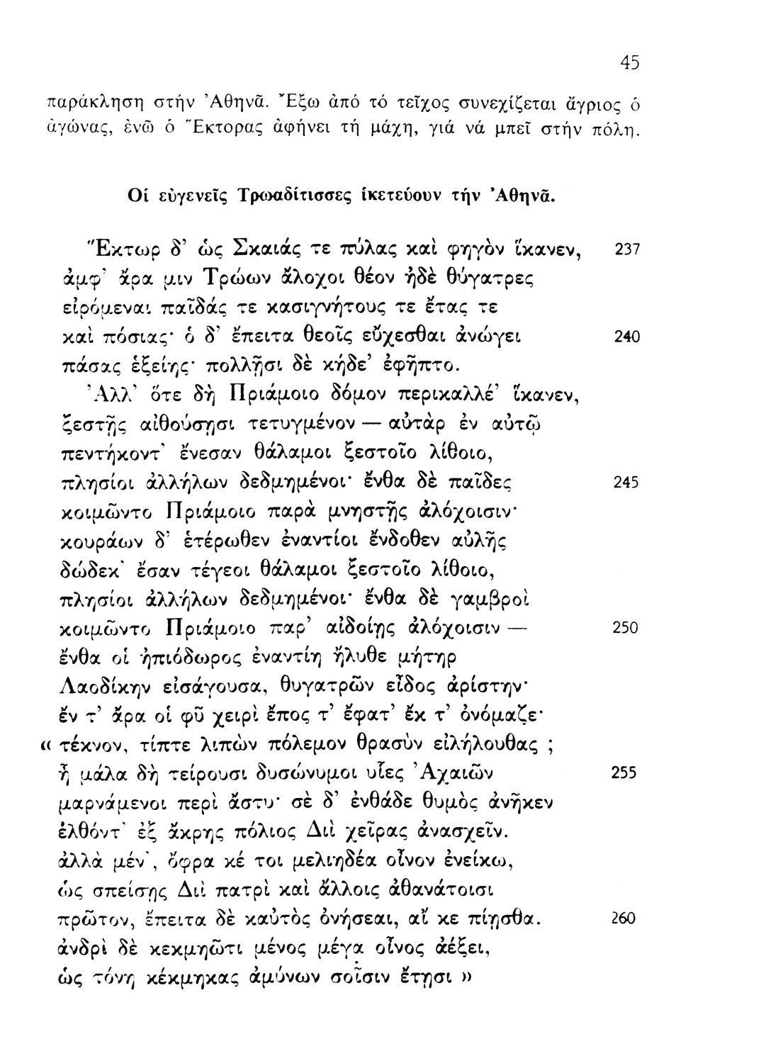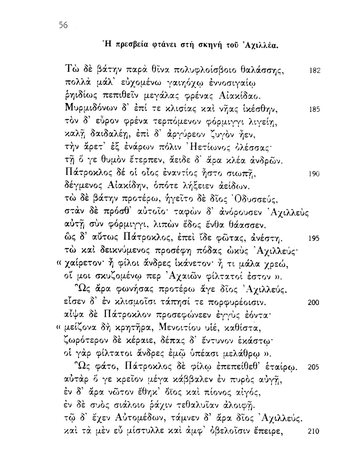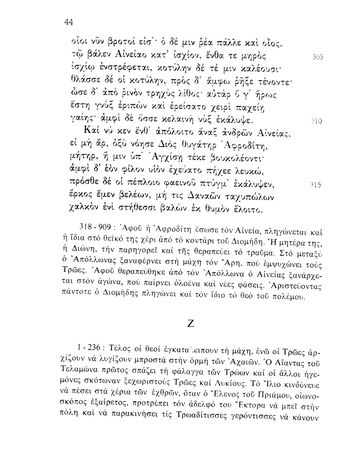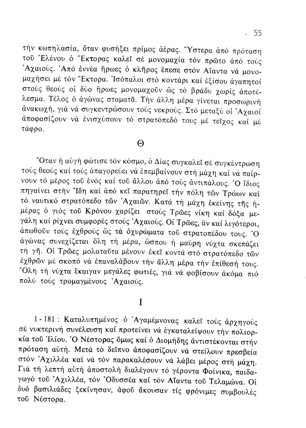 Σχολικό εγχειρίδιο Αρχαίων Ελληνικών που περιέχει εισαγωγικό σημείωμα σχετικά με το περιεχόμενο της Ιλιάδας του Ομήρου και την εποχή στην οποία αναφέρεται ο μύθος. Σε πρωτότυπο κείμενο περιλαμβάνονται αποσπάσματα από τις Ραψωδίες της Ιλιάδας Α, Γ, Ε, Ζ, Ι, Ω και παρεμβάλλονται συνδετικές περιλήψεις μεταξύ των ραψωδιών στη δημοτική γλώσσα. Τέλος, περιέχονται ερμηνευτικές σημειώσεις (σημασιολογικές, γραμματικές, πραγματολογικές) και παράρτημα εικόνων και χαρτών.