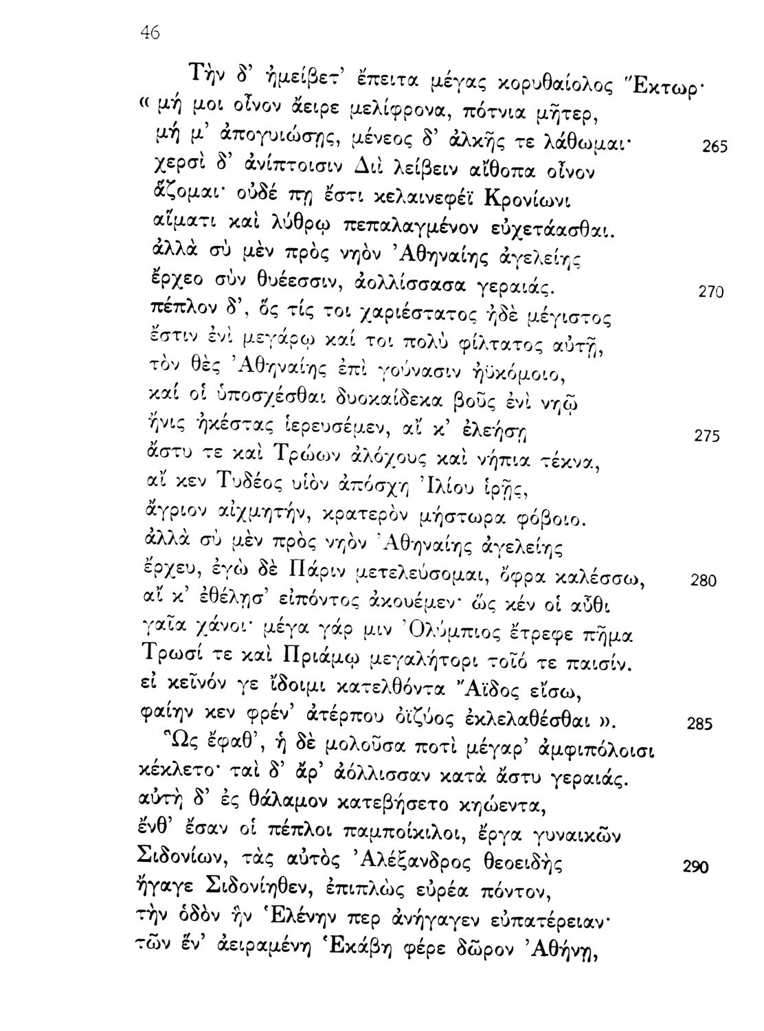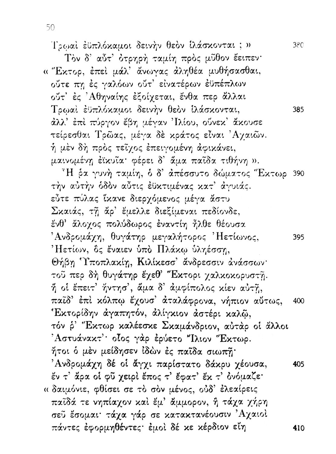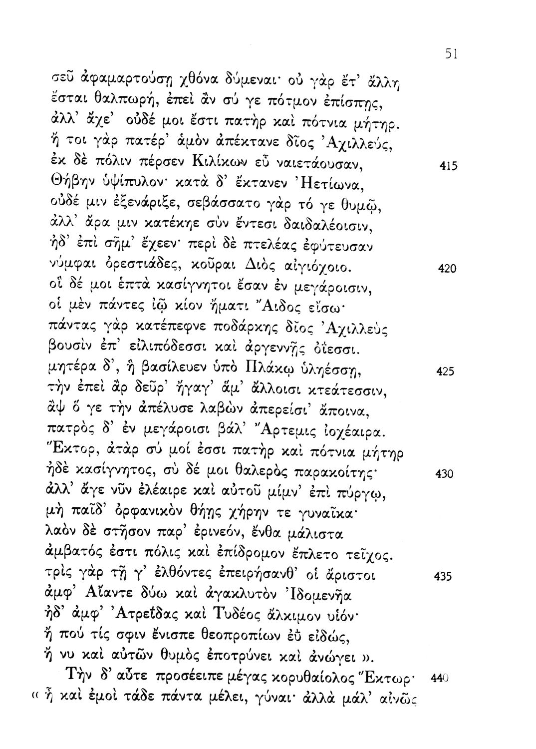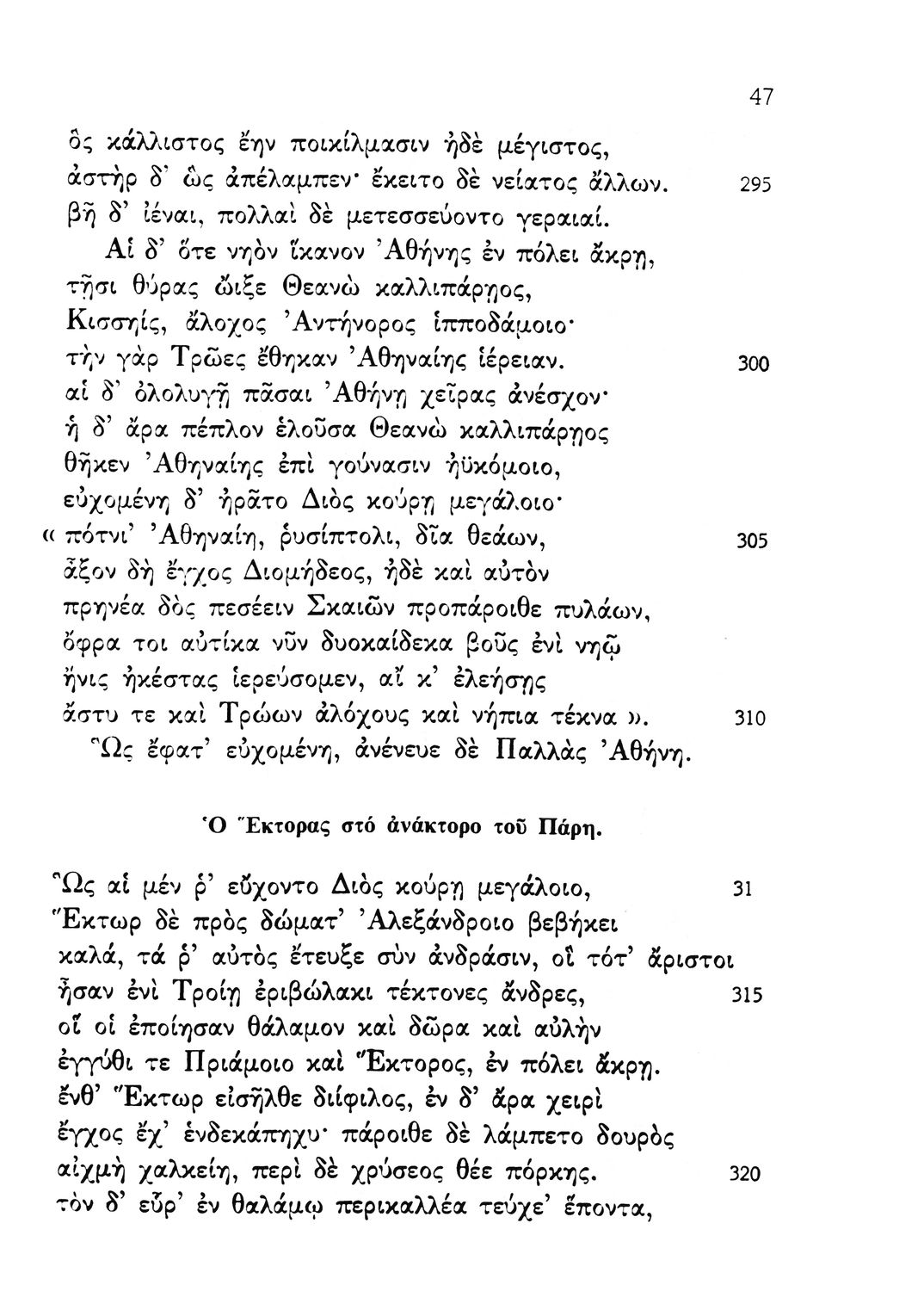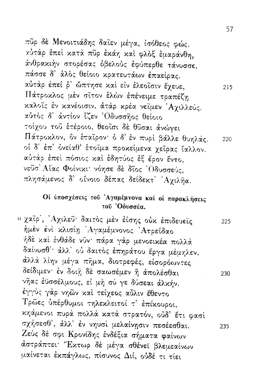 Σχολικό εγχειρίδιο Αρχαίων Ελληνικών που περιέχει εισαγωγικό σημείωμα σχετικά με το περιεχόμενο της Ιλιάδας του Ομήρου και την εποχή στην οποία αναφέρεται ο μύθος. Σε πρωτότυπο κείμενο περιλαμβάνονται αποσπάσματα από τις Ραψωδίες της Ιλιάδας Α, Γ, Ε, Ζ, Ι, Ω και παρεμβάλλονται συνδετικές περιλήψεις μεταξύ των ραψωδιών στη δημοτική γλώσσα. Τέλος, περιέχονται ερμηνευτικές σημειώσεις (σημασιολογικές, γραμματικές, πραγματολογικές) και παράρτημα εικόνων και χαρτών.
