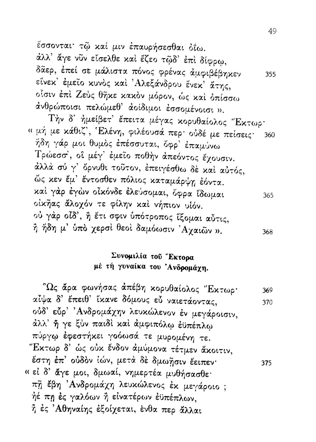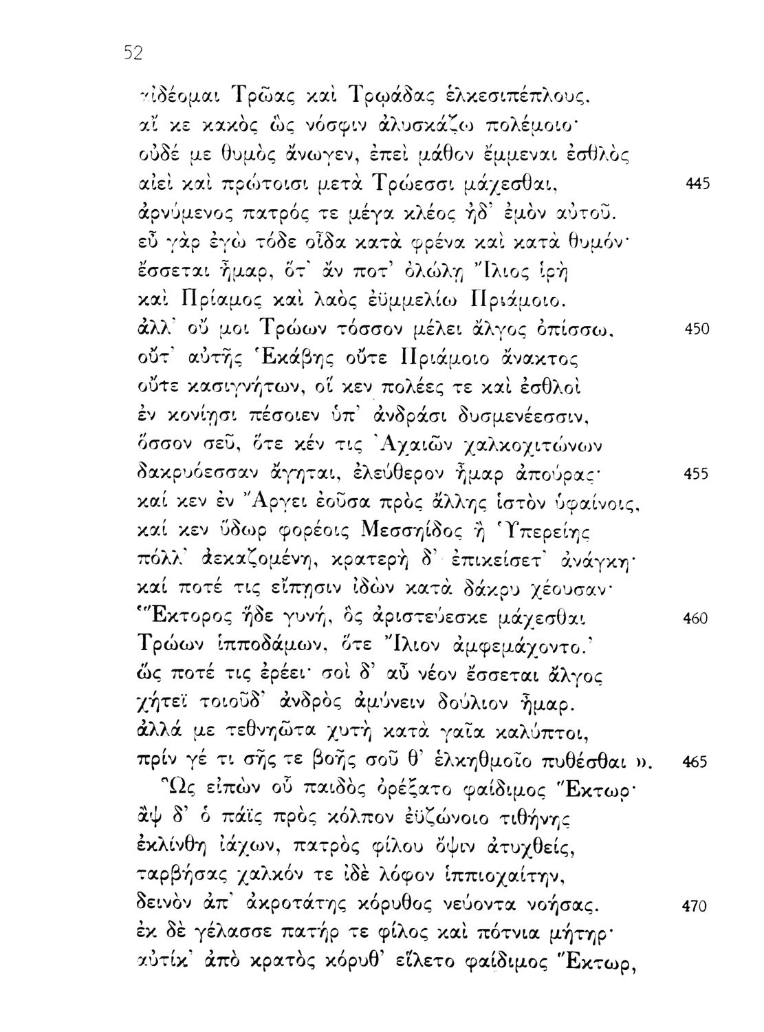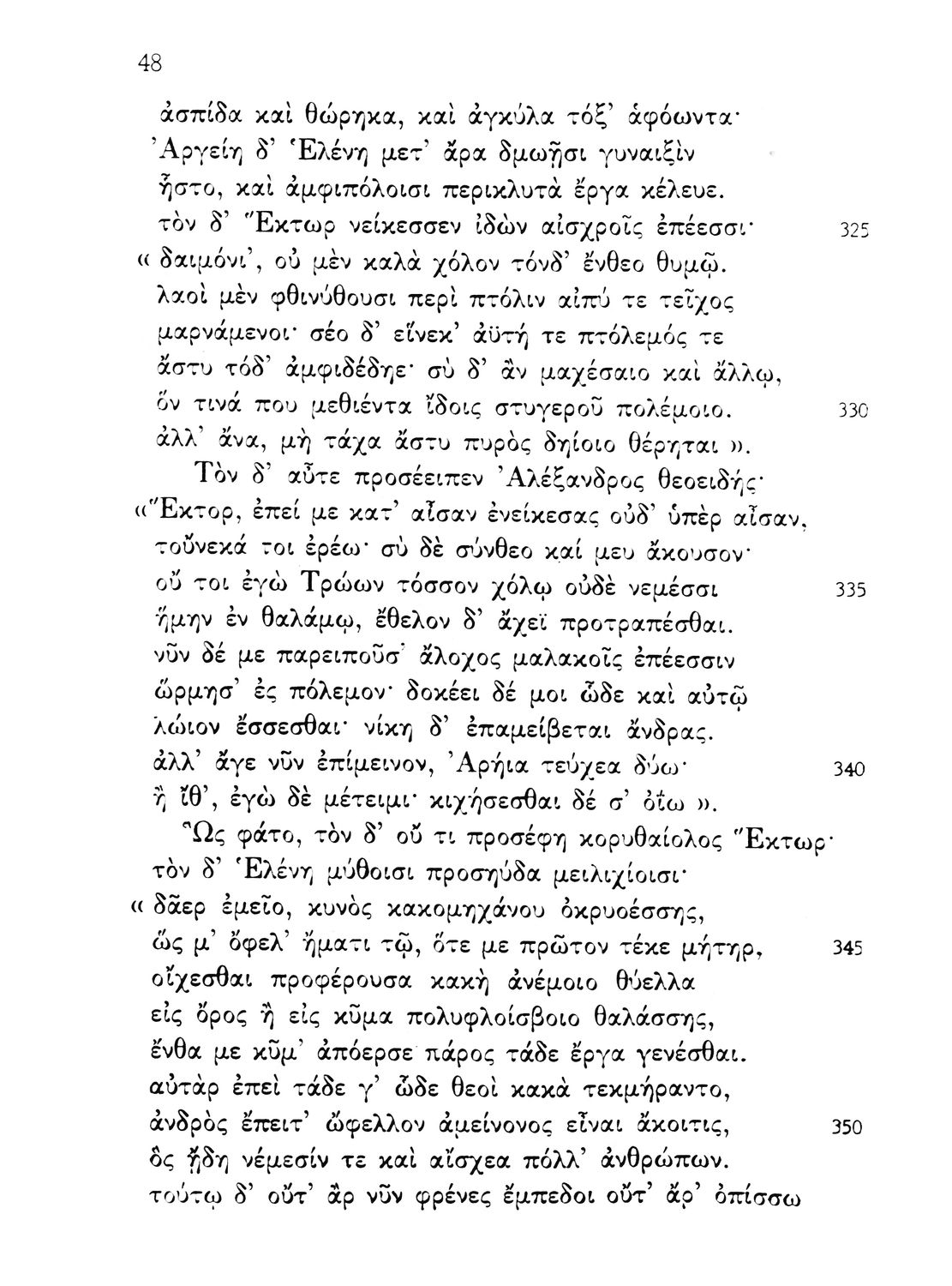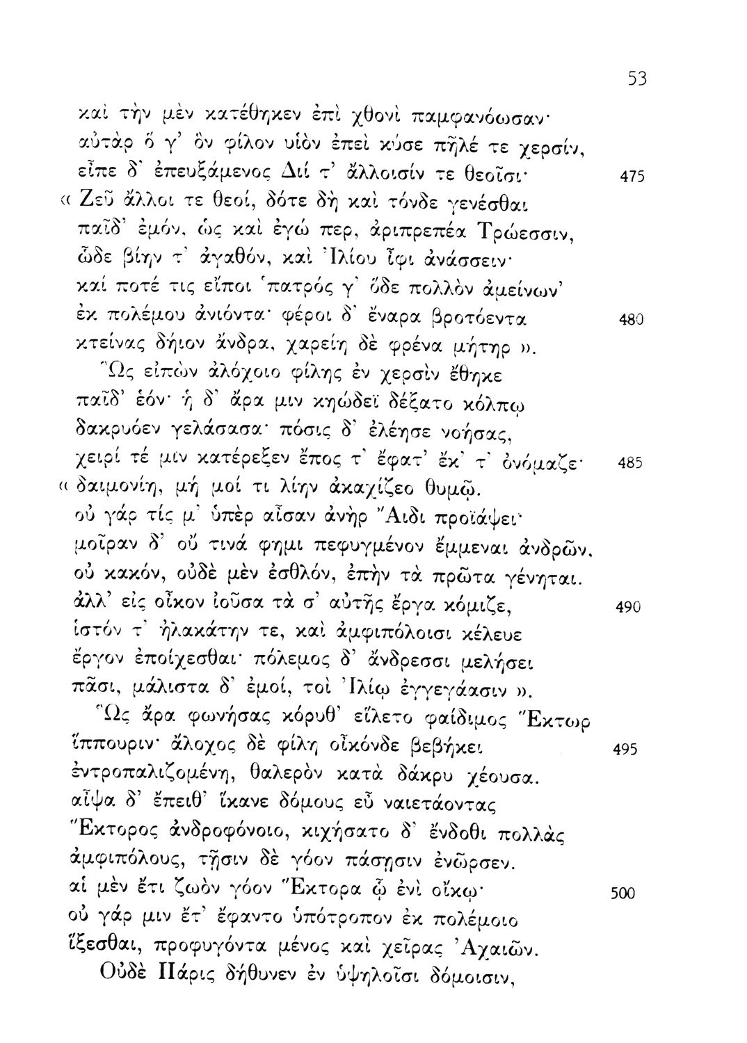 Σχολικό εγχειρίδιο Αρχαίων Ελληνικών που περιέχει εισαγωγικό σημείωμα σχετικά με το περιεχόμενο της Ιλιάδας του Ομήρου και την εποχή στην οποία αναφέρεται ο μύθος. Σε πρωτότυπο κείμενο περιλαμβάνονται αποσπάσματα από τις Ραψωδίες της Ιλιάδας Α, Γ, Ε, Ζ, Ι, Ω και παρεμβάλλονται συνδετικές περιλήψεις μεταξύ των ραψωδιών στη δημοτική γλώσσα. Τέλος, περιέχονται ερμηνευτικές σημειώσεις (σημασιολογικές, γραμματικές, πραγματολογικές) και παράρτημα εικόνων και χαρτών.