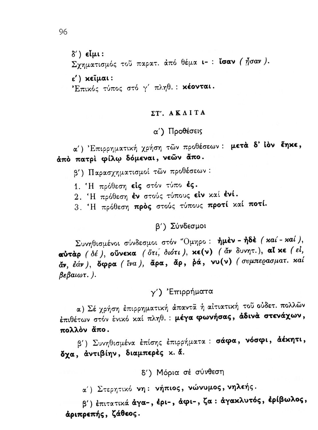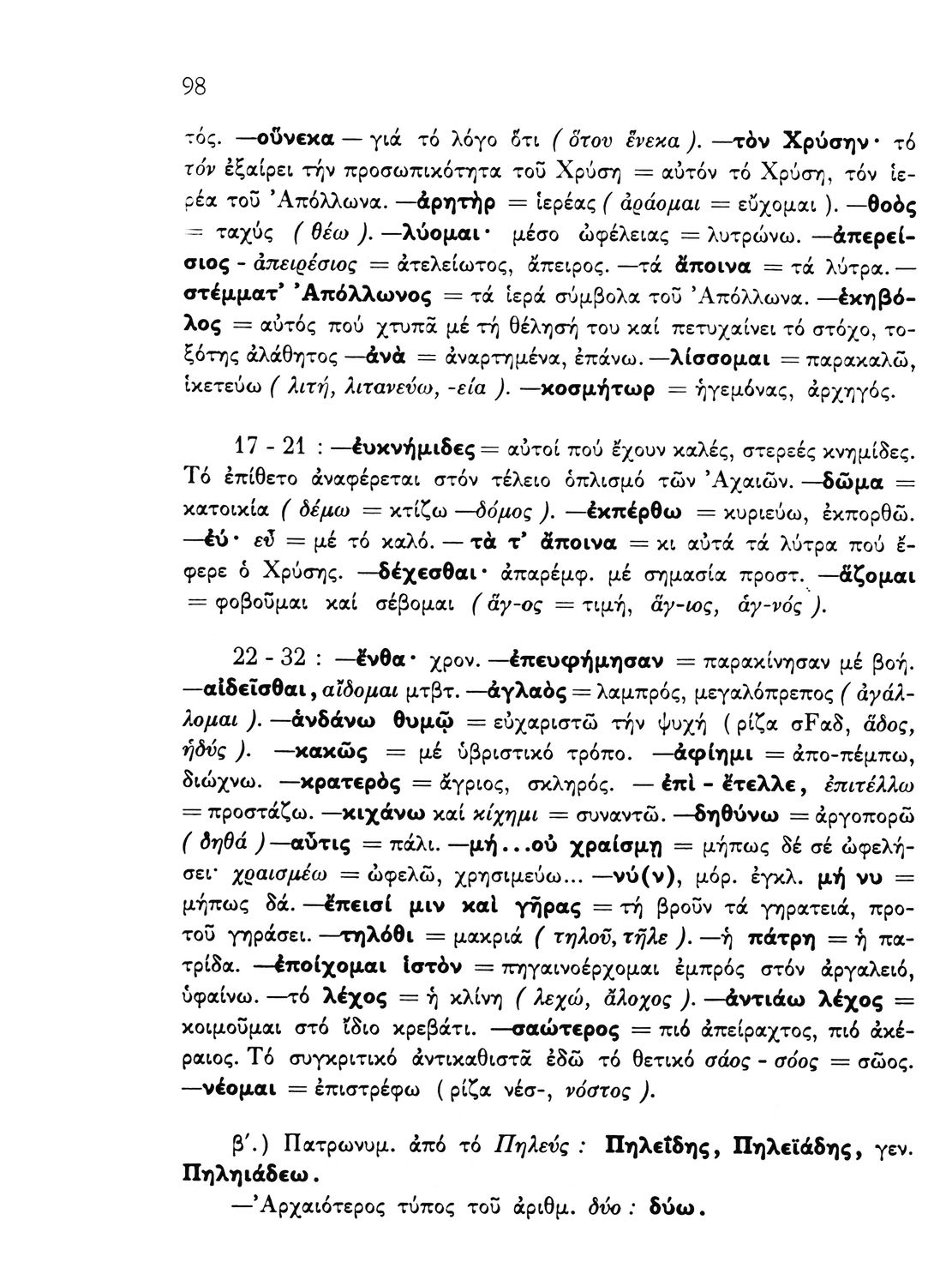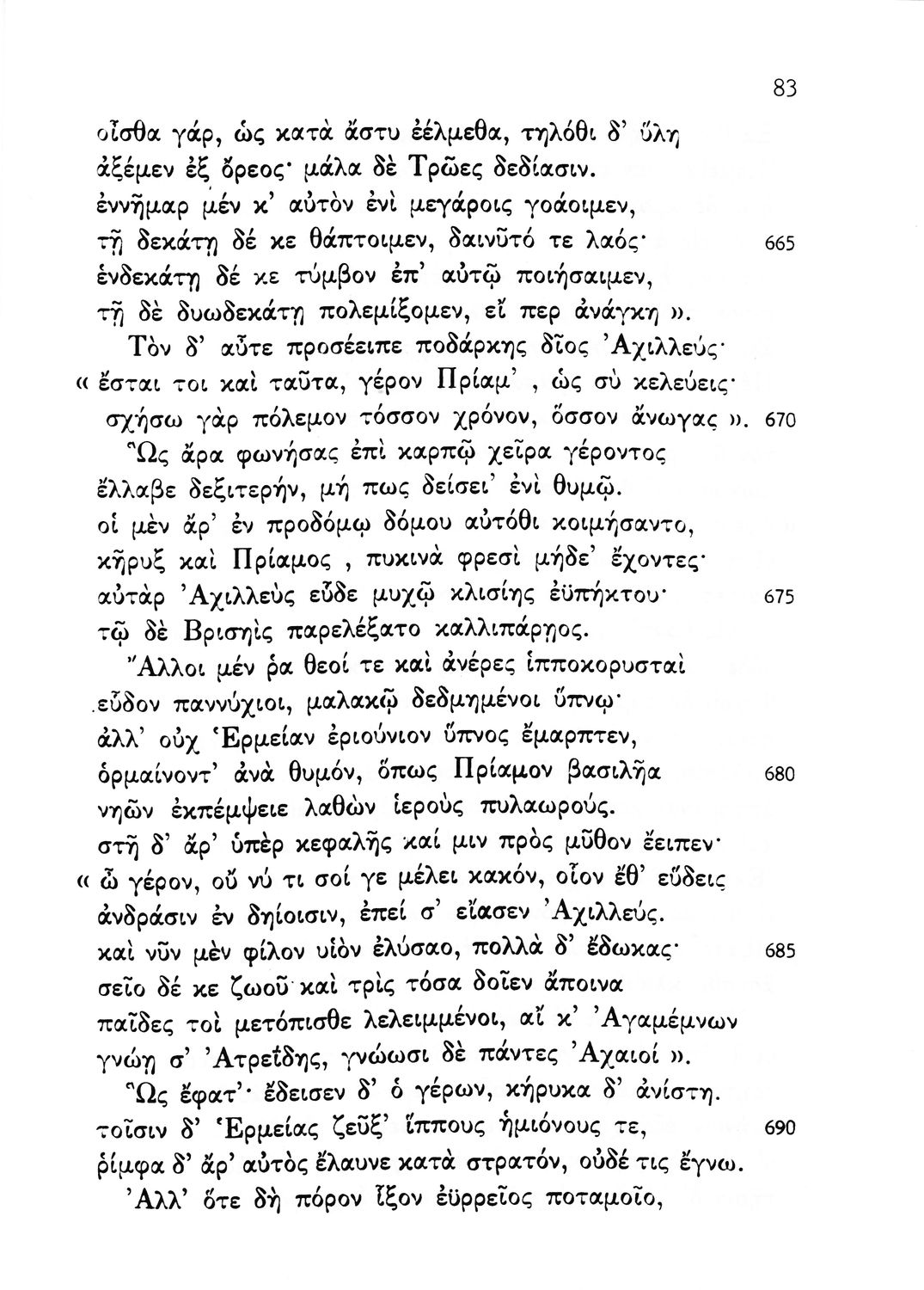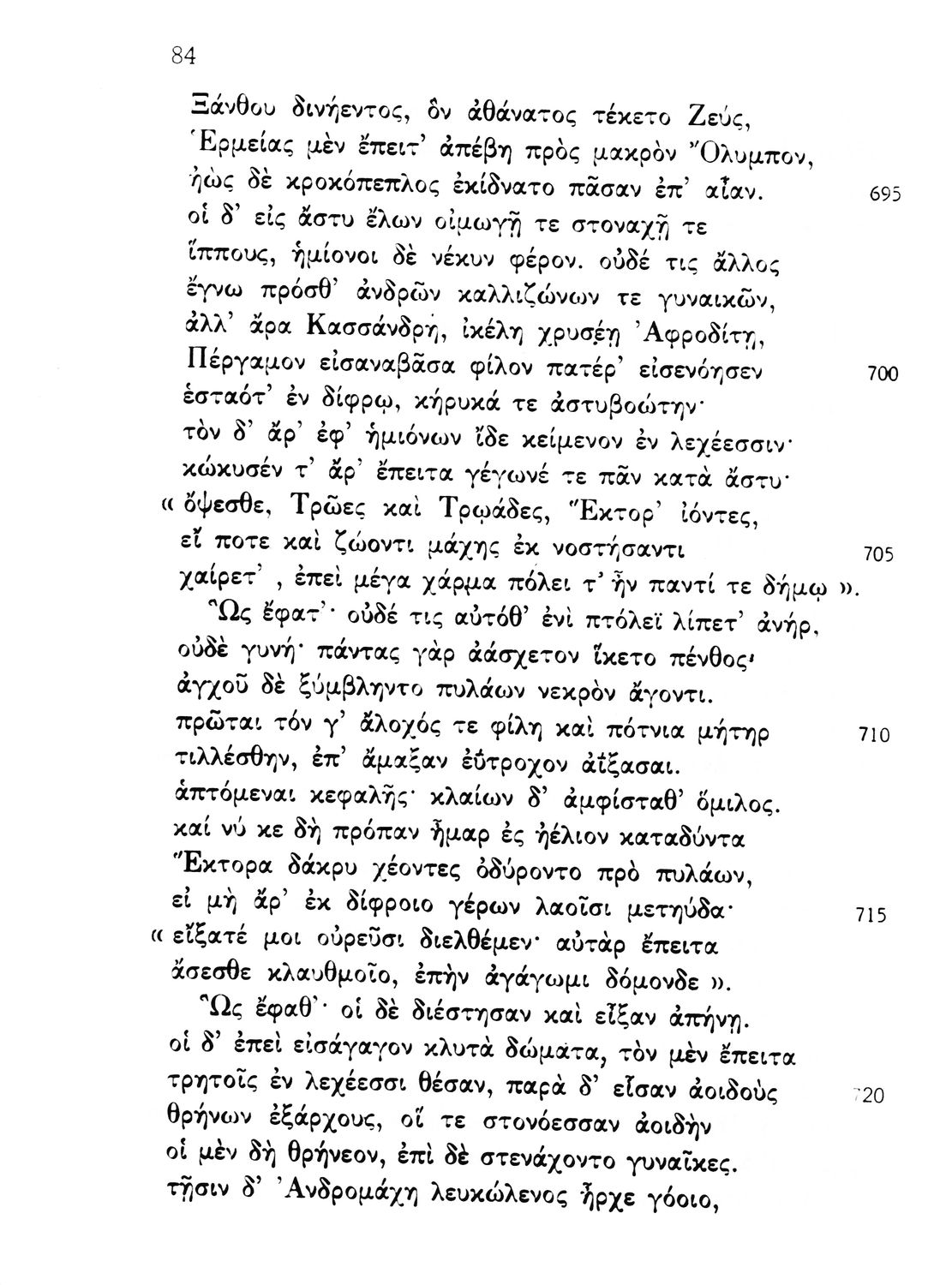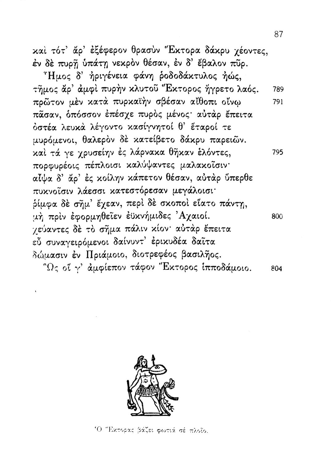 520 ## _aΣχολικό εγχειρίδιο Αρχαίων Ελληνικών που περιέχει εισαγωγικό σημείωμα σχετικά με το περιεχόμενο της Ιλιάδας του Ομήρου και την εποχή στην οποία αναφέρεται ο μύθος. Σε πρωτότυπο κείμενο περιλαμβάνονται αποσπάσματα από τις Ραψωδίες της Ιλιάδας Α, Γ, Ε, Ζ, Ι, Ω και παρεμβάλλονται συνδετικές περιλήψεις μεταξύ των ραψωδιών στη δημοτική γλώσσα. Τέλος, περιέχονται ερμηνευτικές σημειώσεις (σημασιολογικές, γραμματικές, πραγματολογικές) και παράρτημα εικόνων και χαρτών.