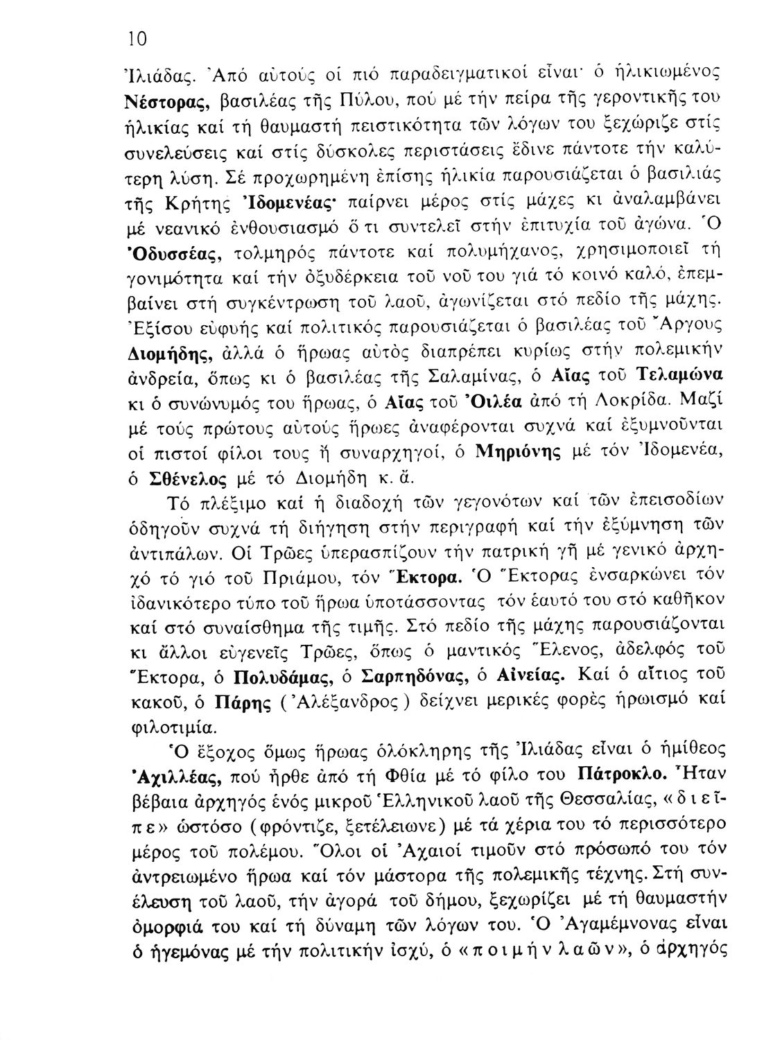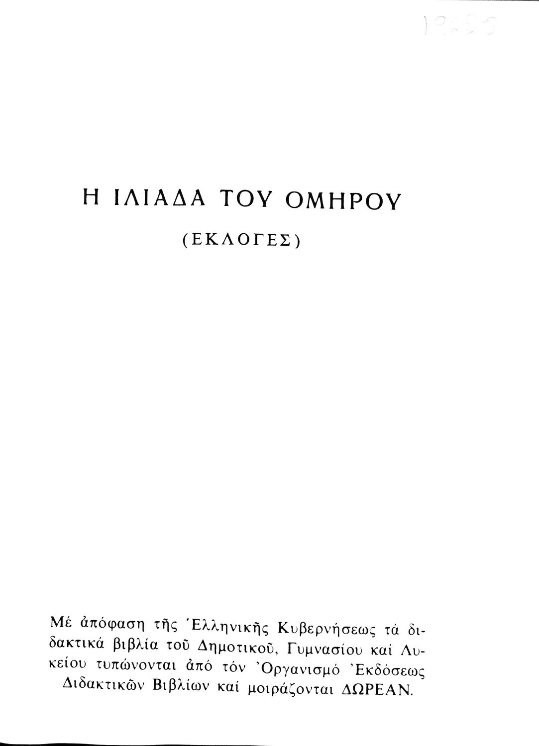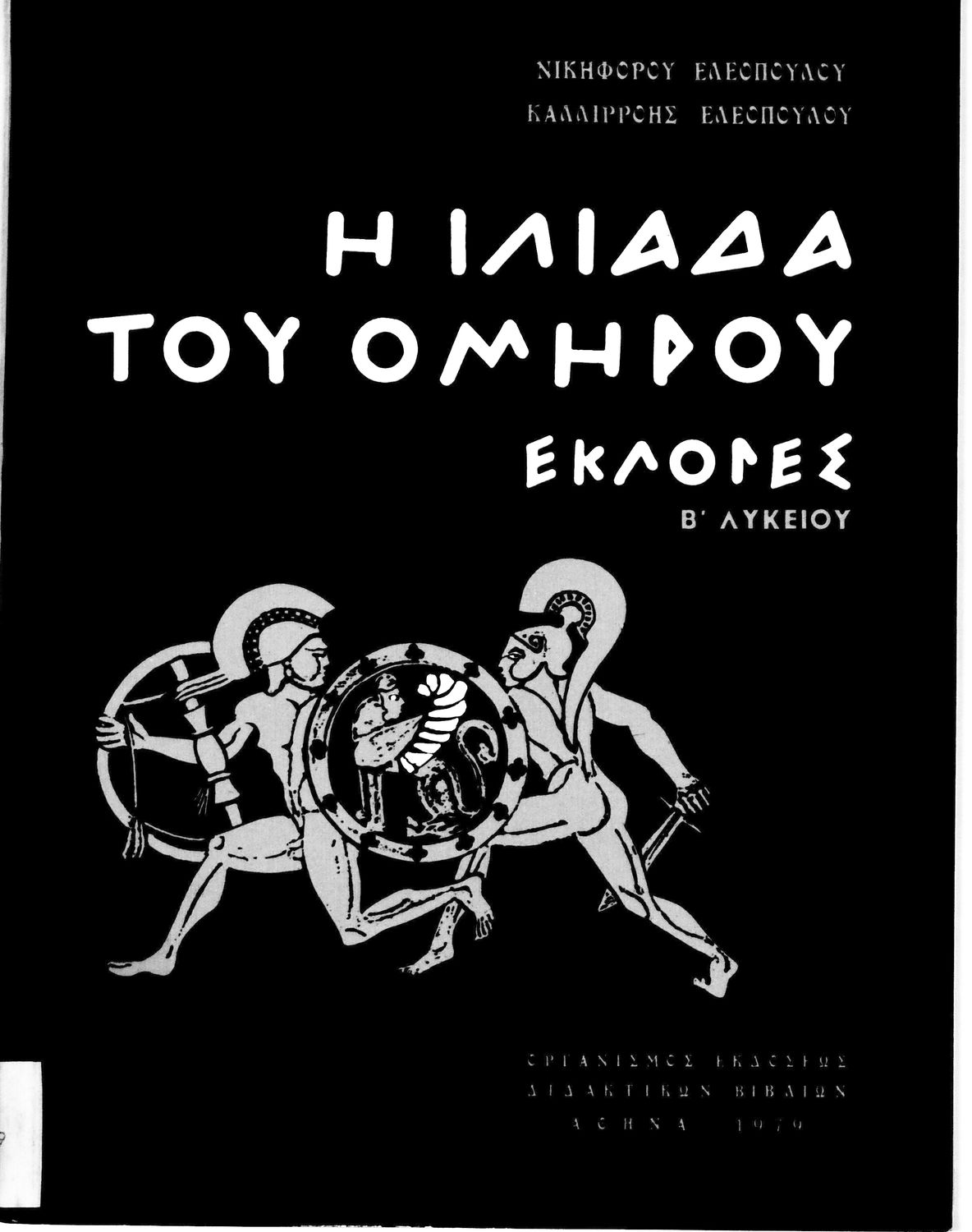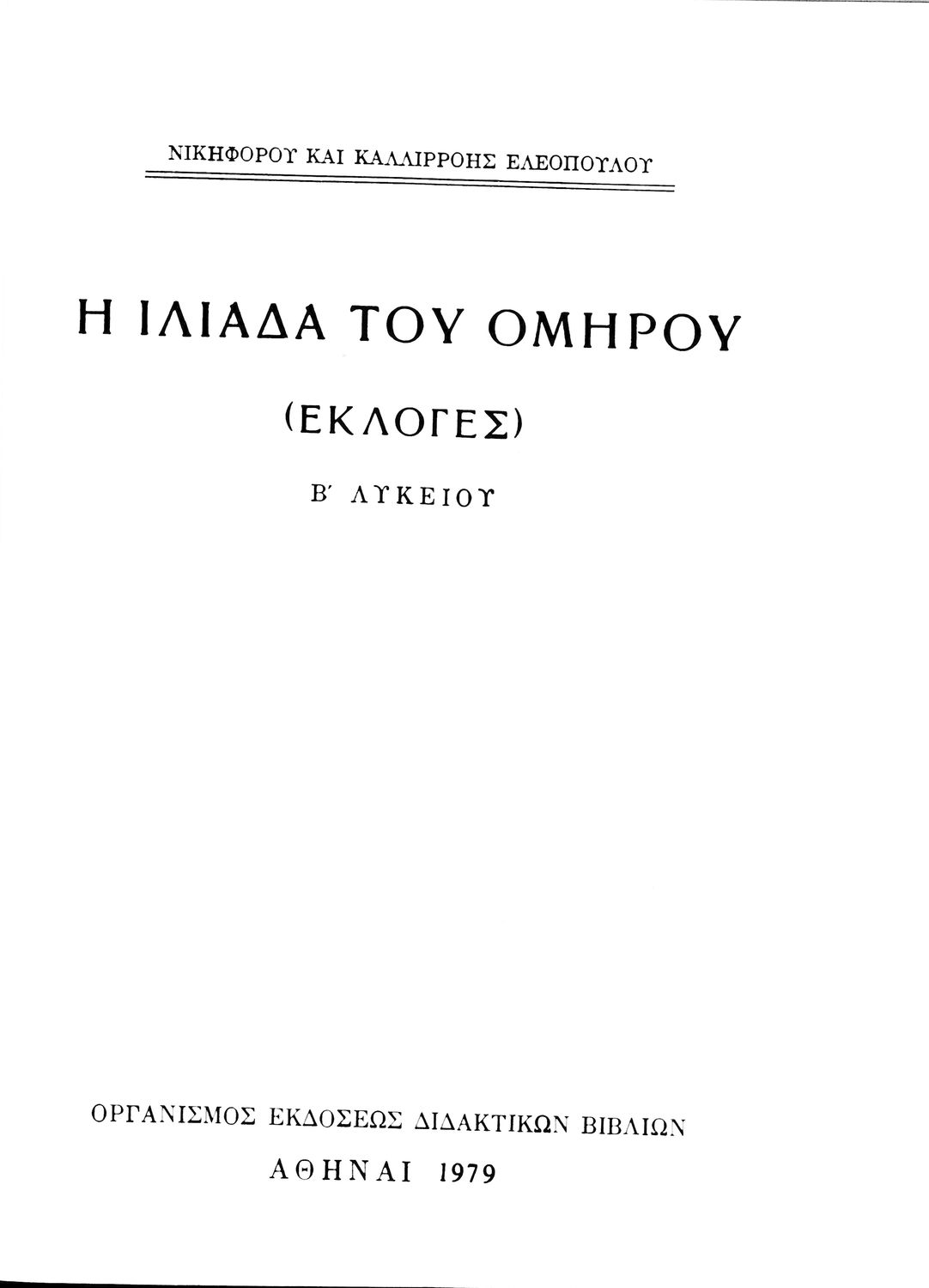 Σχολικό εγχειρίδιο Αρχαίων Ελληνικών που περιέχει εισαγωγικό σημείωμα σχετικά με το περιεχόμενο της Ιλιάδας του Ομήρου και την εποχή στην οποία αναφέρεται ο μύθος. Σε πρωτότυπο κείμενο περιλαμβάνονται αποσπάσματα από τις Ραψωδίες της Ιλιάδας Α, Γ, Ε, Ζ, Ι, Ω και παρεμβάλλονται συνδετικές περιλήψεις μεταξύ των ραψωδιών στη δημοτική γλώσσα. Τέλος, περιέχονται ερμηνευτικές σημειώσεις (σημασιολογικές, γραμματικές, πραγματολογικές) και παράρτημα εικόνων και χαρτών.