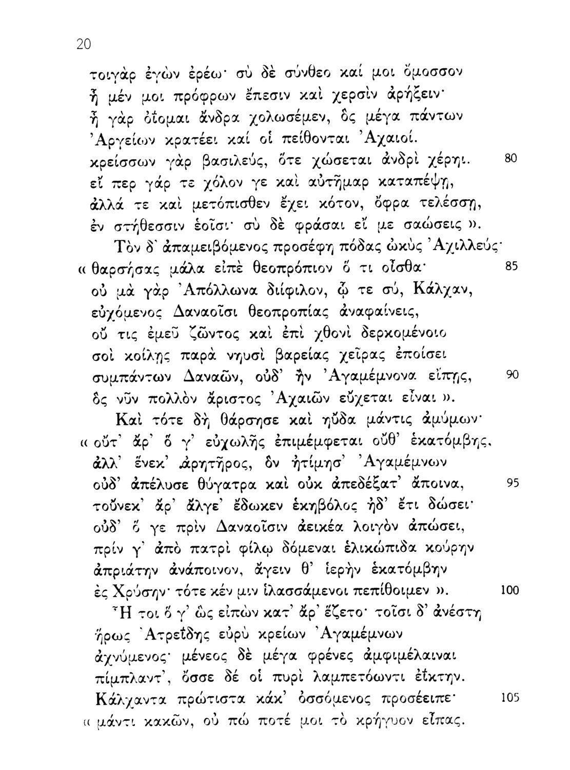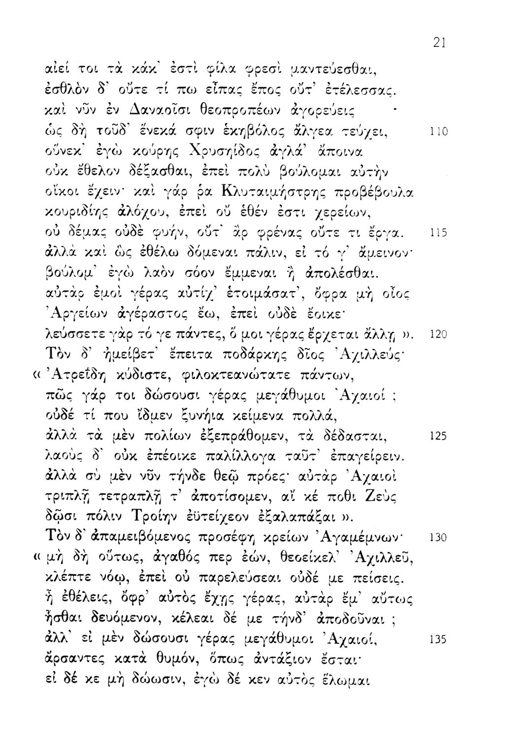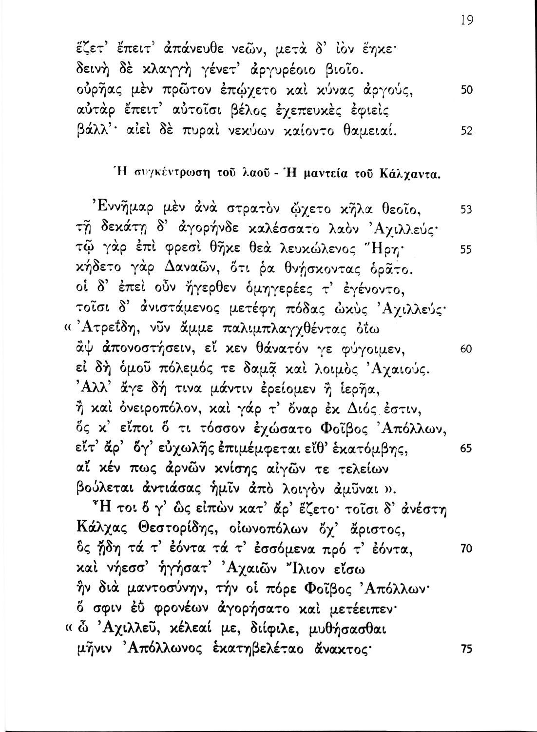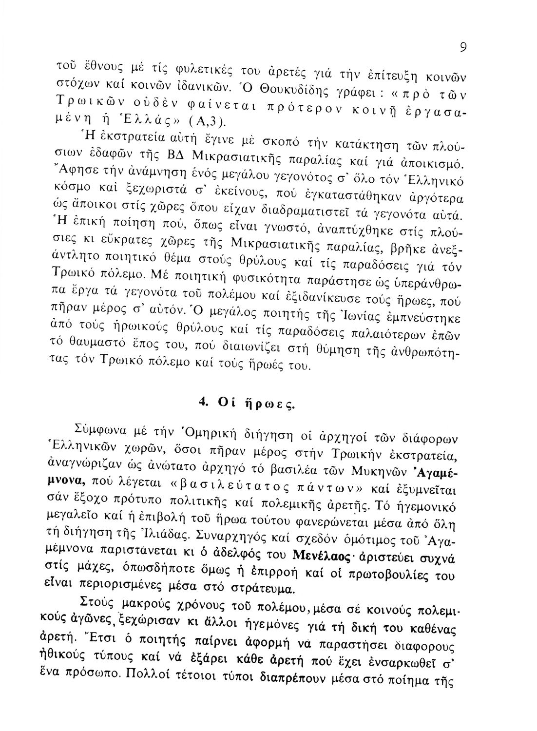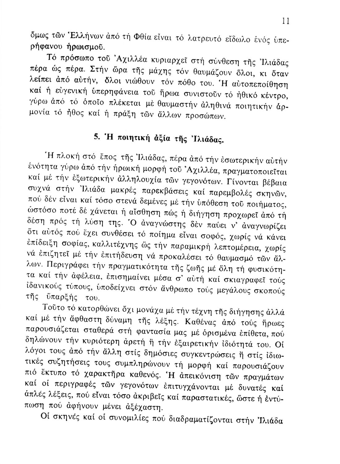 Σχολικό εγχειρίδιο Αρχαίων Ελληνικών που περιέχει εισαγωγικό σημείωμα σχετικά με το περιεχόμενο της Ιλιάδας του Ομήρου και την εποχή στην οποία αναφέρεται ο μύθος. Σε πρωτότυπο κείμενο περιλαμβάνονται αποσπάσματα από τις Ραψωδίες της Ιλιάδας Α, Γ, Ε, Ζ, Ι, Ω και παρεμβάλλονται συνδετικές περιλήψεις μεταξύ των ραψωδιών στη δημοτική γλώσσα. Τέλος, περιέχονται ερμηνευτικές σημειώσεις (σημασιολογικές, γραμματικές, πραγματολογικές) και παράρτημα εικόνων και χαρτών.