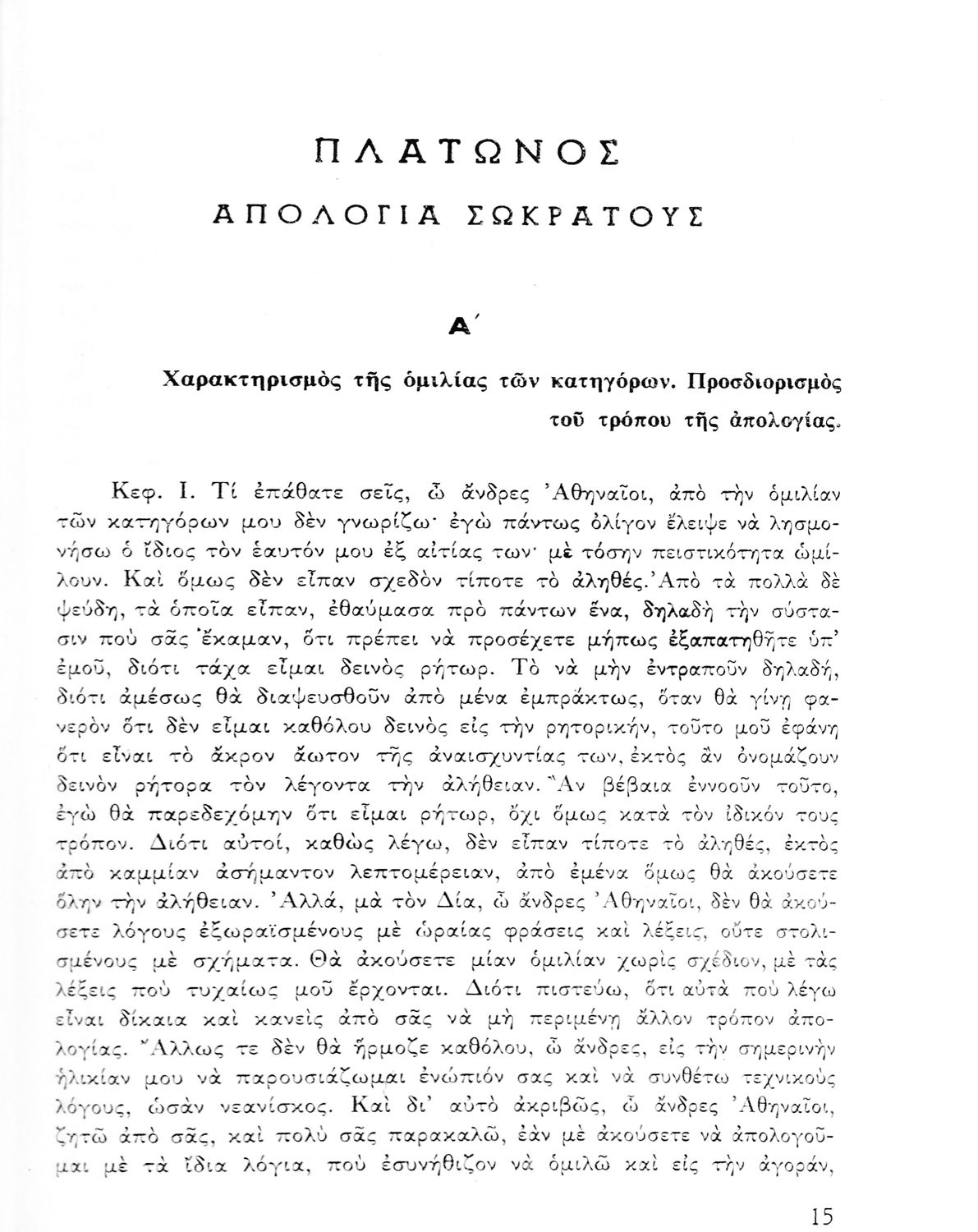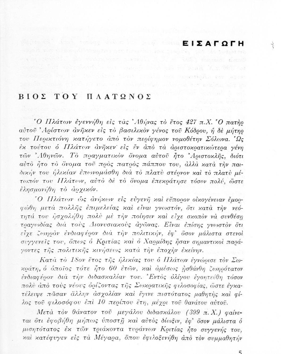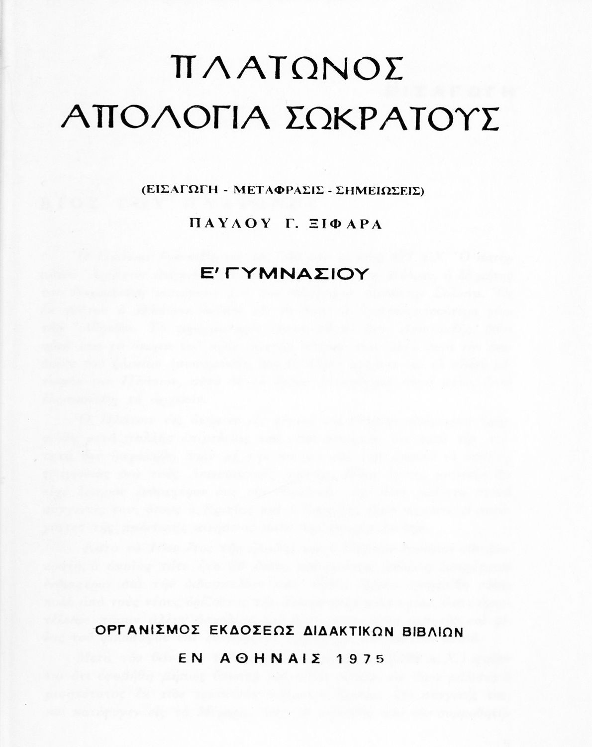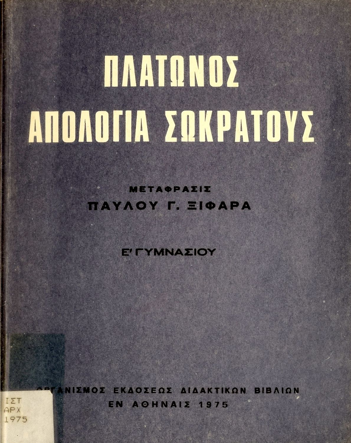 Σχολικό εγχειρίδιο Αρχαίων Ελληνικών για την Ε' Γυμνασίου. Το βιβλίο περιλαμβάνει εισαγωγή με το βίο του Πλάτωνα ενώ το κείμενο είναι μετάφραση από το πρωτότυπο.
