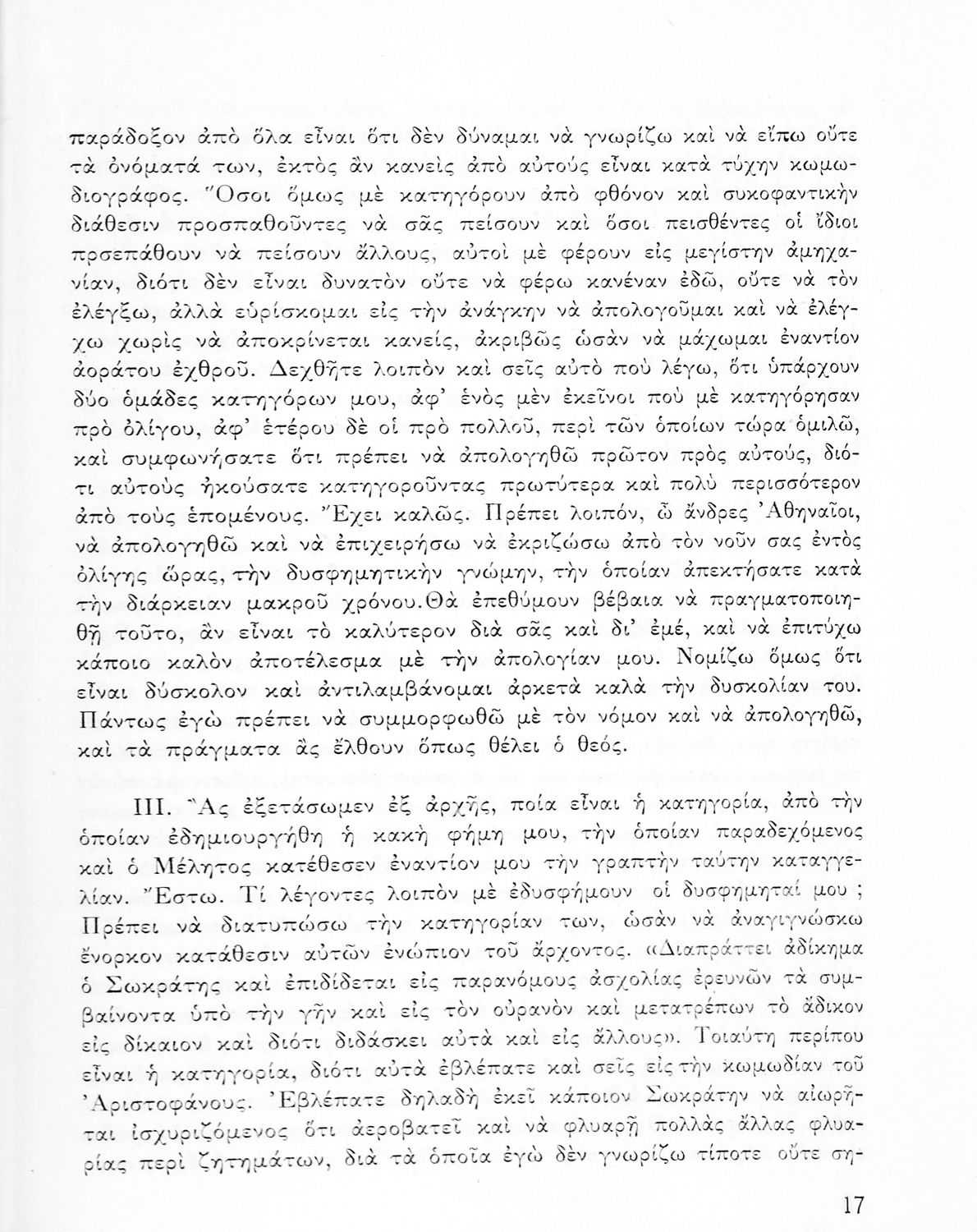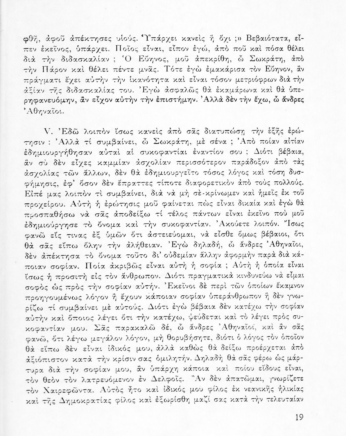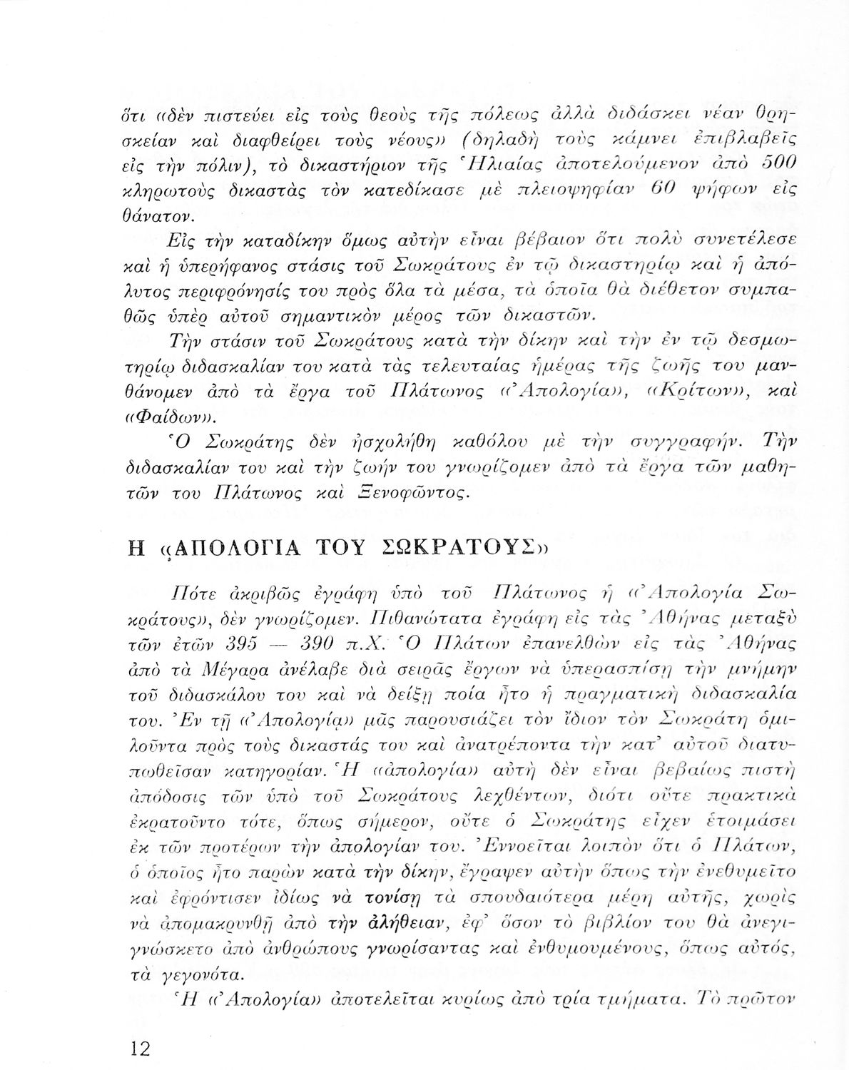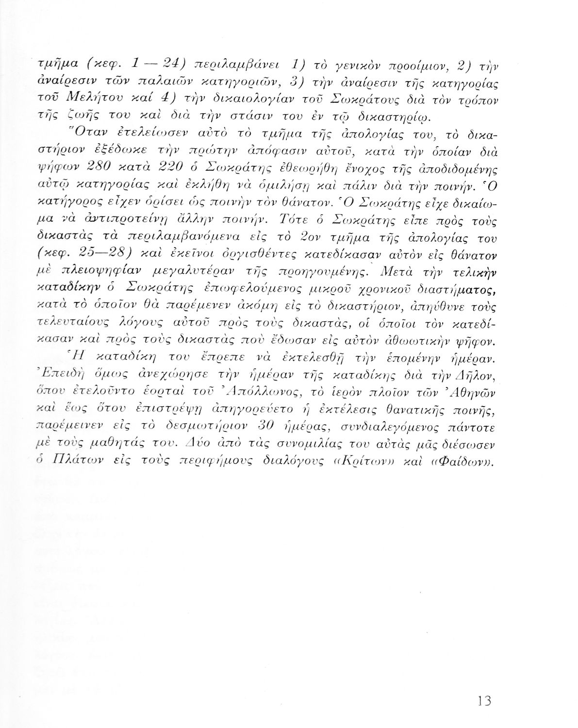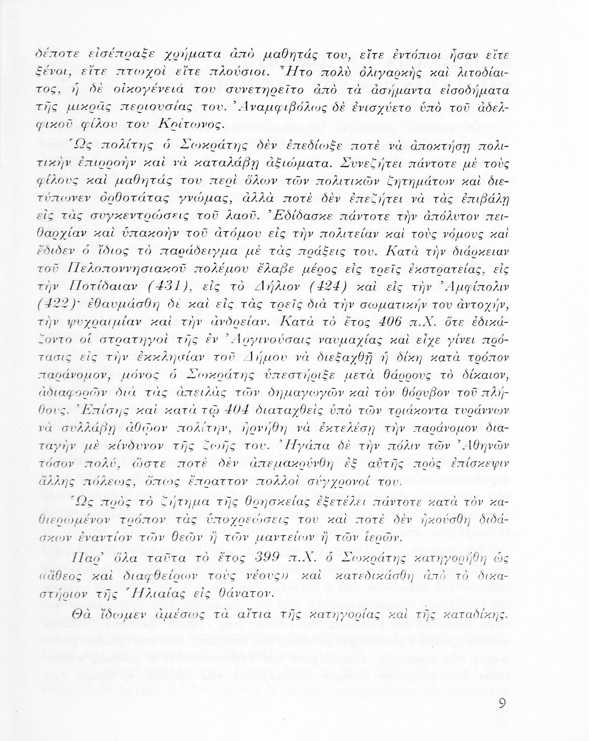 Σχολικό εγχειρίδιο Αρχαίων Ελληνικών για την Ε' Γυμνασίου. Το βιβλίο περιλαμβάνει εισαγωγή με το βίο του Πλάτωνα ενώ το κείμενο είναι μετάφραση από το πρωτότυπο.
