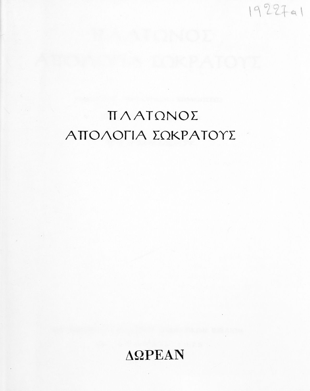 Κωδικός αναγνώρισης: 01-19227a.1 Τίτλος: Πλάτωνος, Απολογία Σωκράτους, Ε΄ Γυμνασίου Συγγραφέας: Πλάτων, Παύλος Ξιφαράς (μετάφραση) Μέγεθος και υπόστρωμα: Σχολικό εγχειρίδιο, 20εκ., μαλακό εξώφυλλο, 50 σελίδες. |