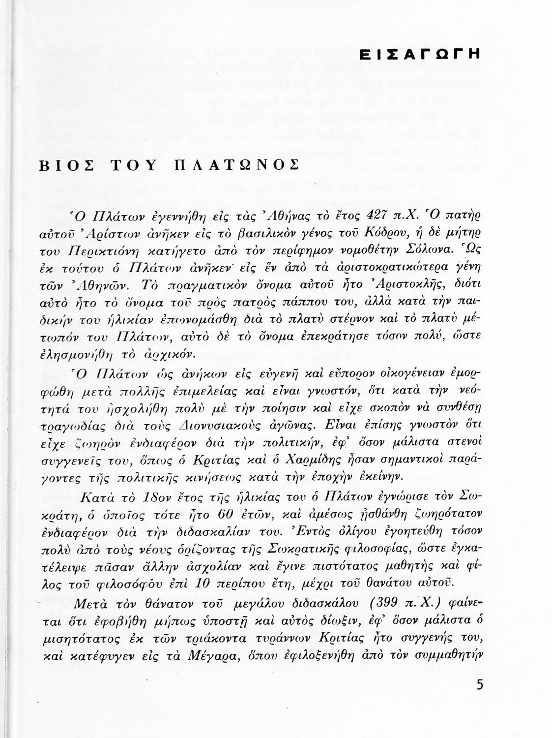 Σχολικό εγχειρίδιο Αρχαίων Ελληνικών για τη Ε' Γυμνασίου. Το βιβλίο περιλαμβάνει εισαγωγή με το βίο του Πλάτωνα και είναι μετάφραση από το πρωτότυπο.