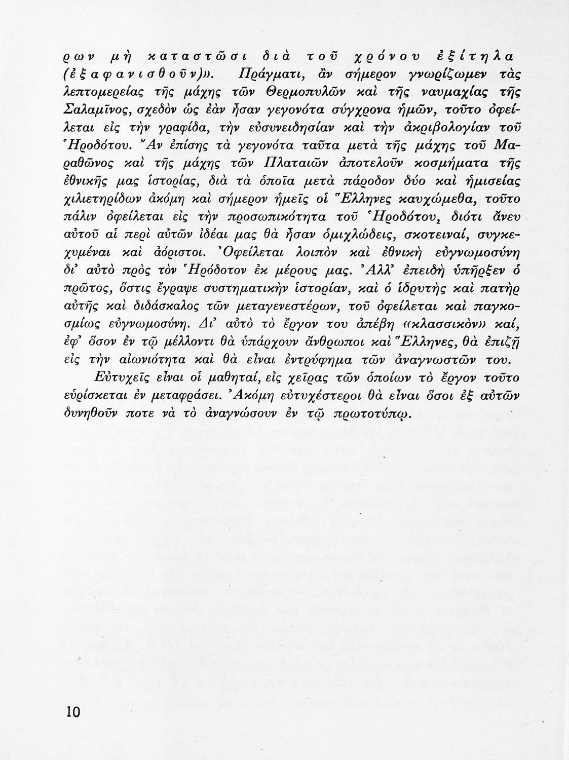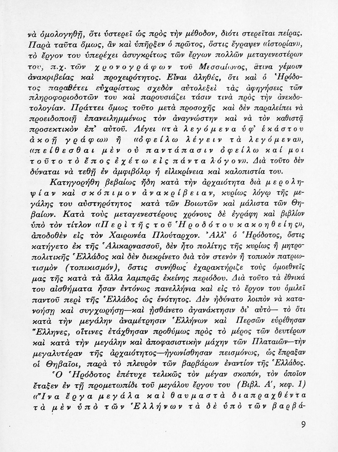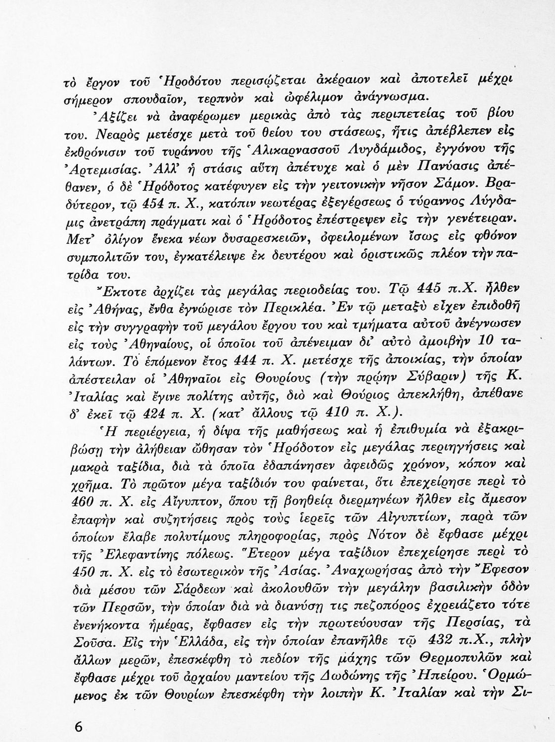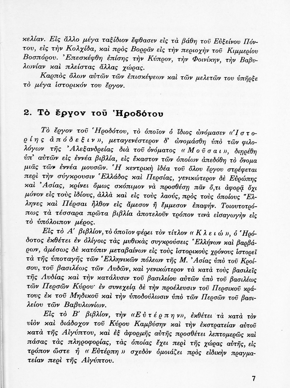 Σχολικό εγχειρίδιο Αρχαίων Ελληνικών Α΄ Γυμνασίου που περιλαμβάνει εισαγωγή στη ζωή και το έργο του Ηρόδοτου, και αποσπάσματα από τα 9 βιβλία της Ιστορίας του σε μετάφραση. Φέρει το σύμβολο της δικτατορίας.