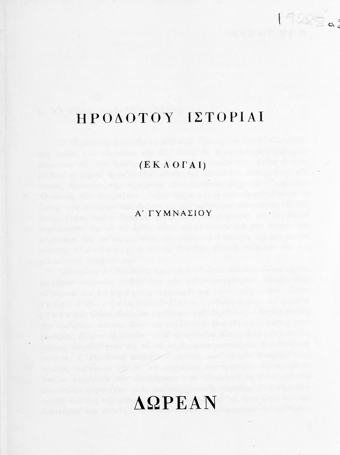 Βαθμίδα εκπαίδευσης: Δευτεροβάθμια Τάξη: Α' Γυμνασίου Μάθημα: Αρχαία Ελληνικά Γλώσσα: Καθαρεύουσα Παρουσίαση περιεχομένου: Σχολικό εγχειρίδιο Αρχαίων Ελληνικών Α΄ Γυμνασίου που περιλαμβάνει εισαγωγή στη ζωή και το έργο του Ηρόδοτου, και αποσπάσματα από τα 9 βιβλία της Ιστορίας του σε μετάφραση. |