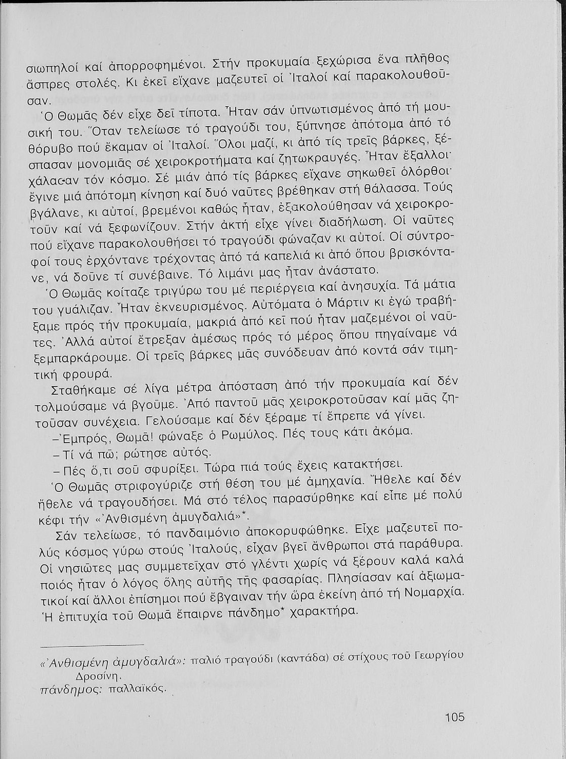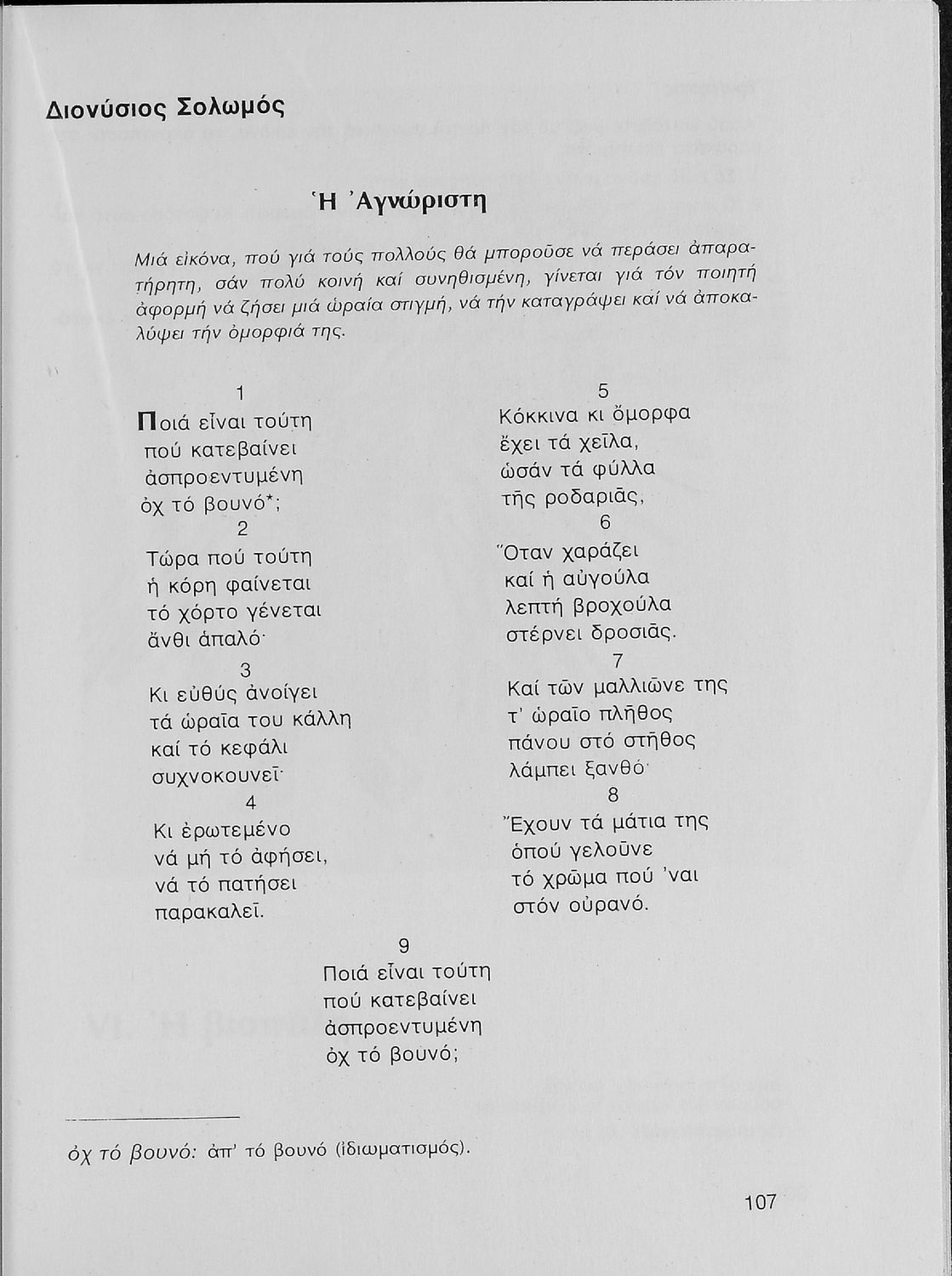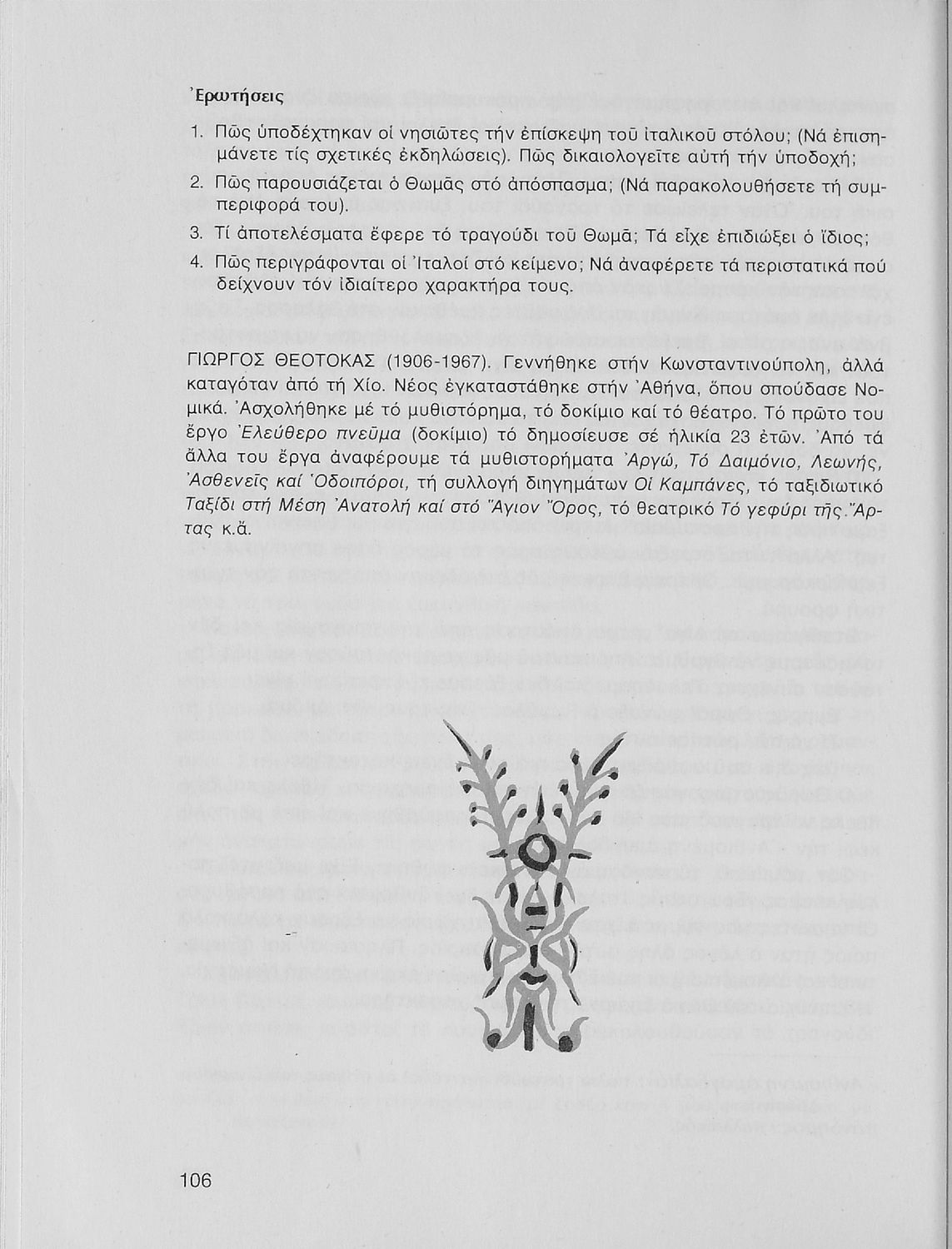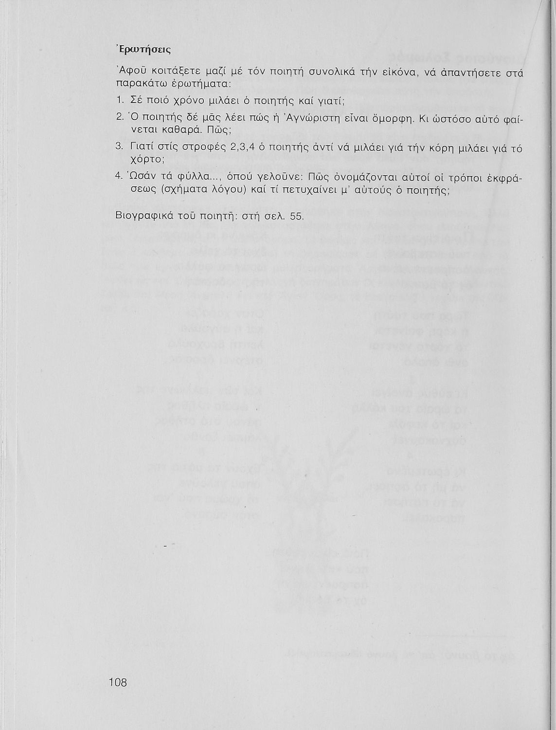 Σχολικό εγχειρίδιο Νέων Ελληνικών Α΄ Γυμνασίου που περιλαμβάνει δοκίμια, πεζά και ποιήματα Ελλήνων συγγραφέων και δημοτικά τραγούδια εμπνευσμένα από τη θρησκευτική, εθνική και κοινωνική ζωή, τη "δοκιμασία της Κύπρου", και την ελληνική φύση. Περιέχει και έργα ευρωπαίων συγγραφέων.