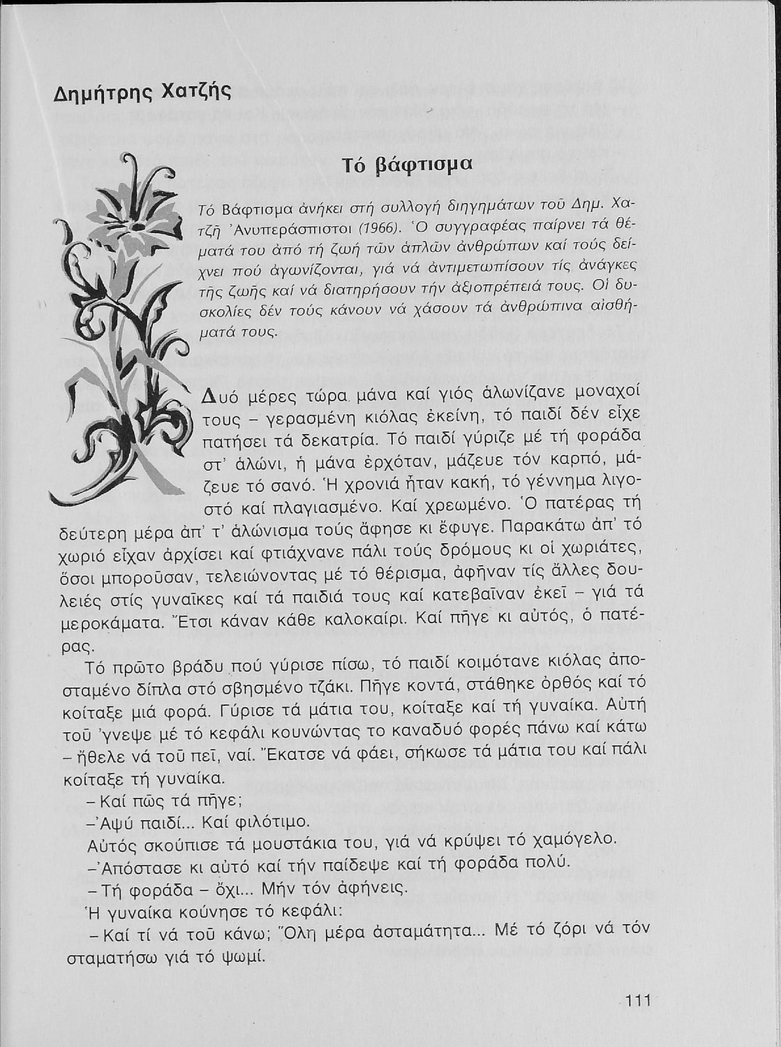 Σχολικό εγχειρίδιο Νέων Ελληνικών Α΄ Γυμνασίου που περιλαμβάνει δοκίμια, πεζά και ποιήματα Ελλήνων συγγραφέων και δημοτικά τραγούδια εμπνευσμένα από τη θρησκευτική, εθνική και κοινωνική ζωή, τη "δοκιμασία της ...