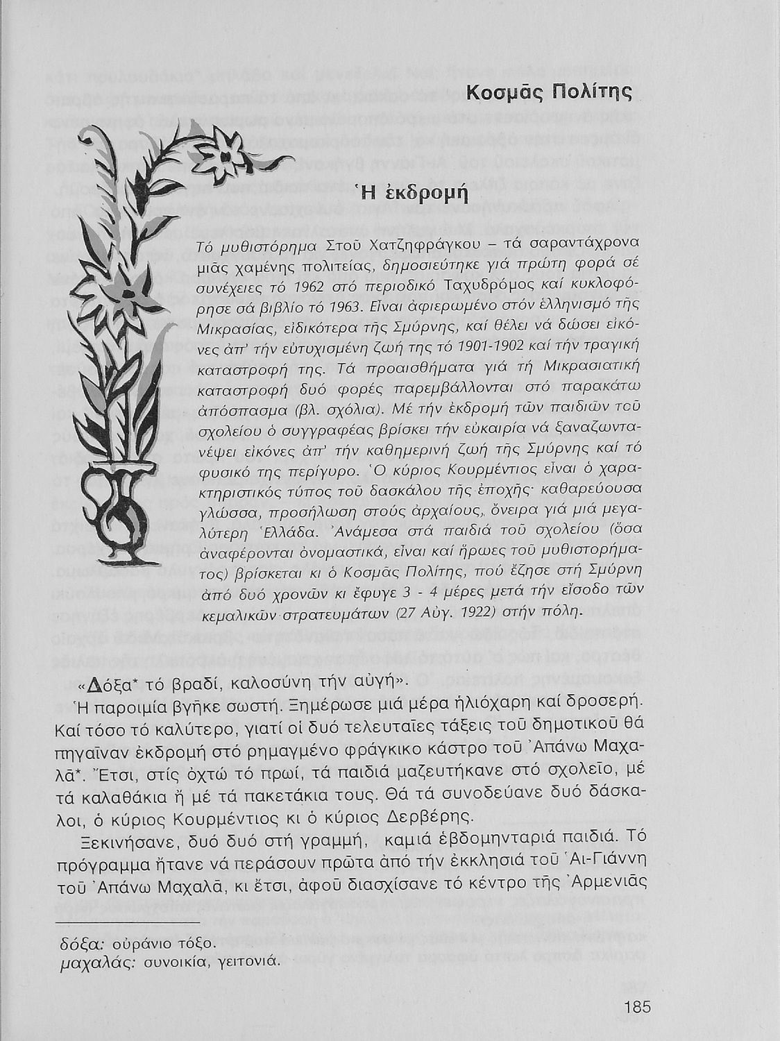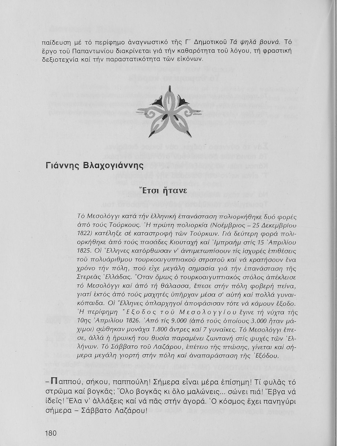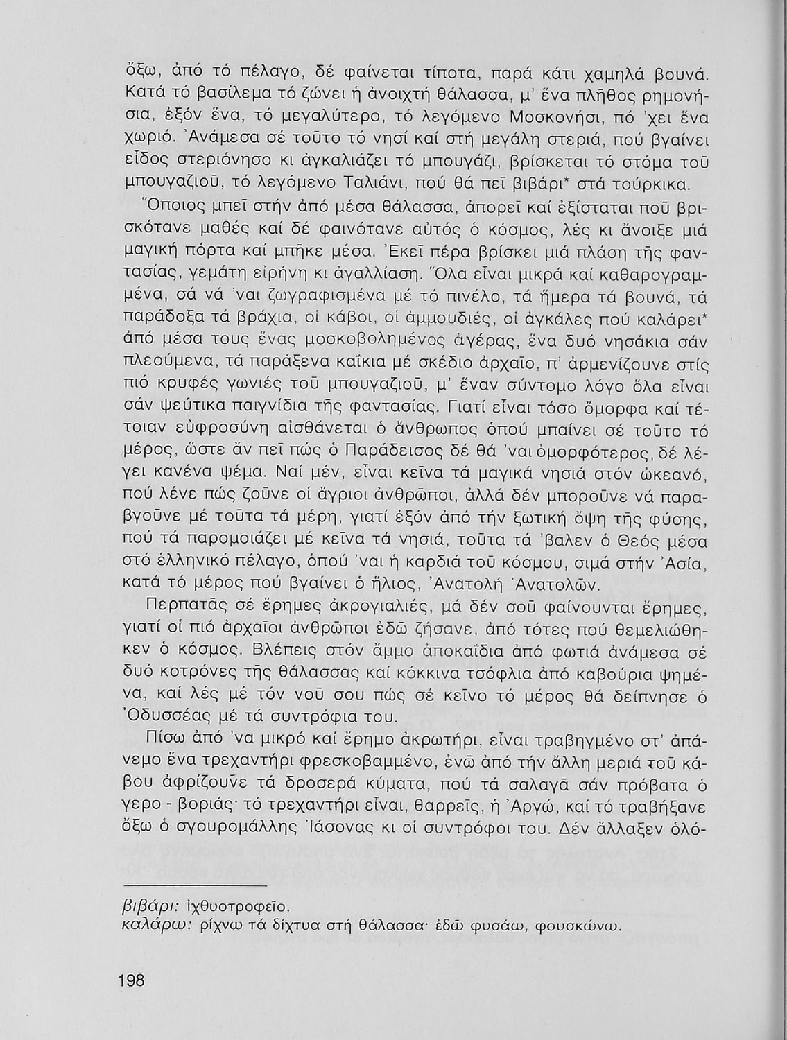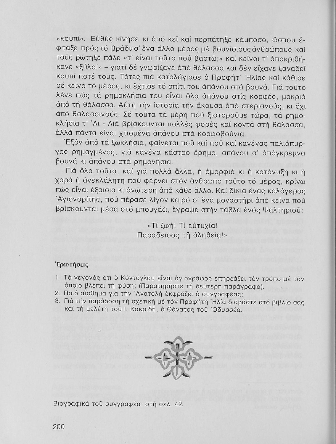 Σχολικό εγχειρίδιο Νέων Ελληνικών Α΄ Γυμνασίου που περιλαμβάνει δοκίμια, πεζά και ποιήματα Ελλήνων συγγραφέων και δημοτικά τραγούδια εμπνευσμένα από τη θρησκευτική, εθνική και κοινωνική ζωή, τη "δοκιμασία της Κύπρου", και την ελληνική φύση. Περιέχει και έργα ευρωπαίων συγγραφέων.