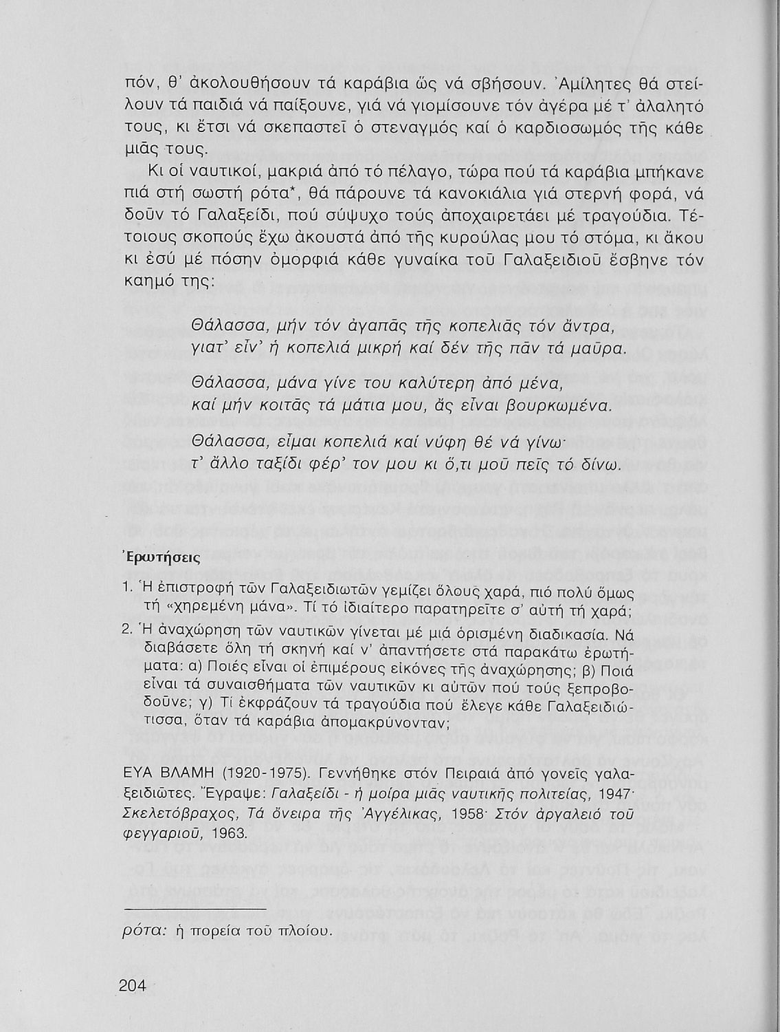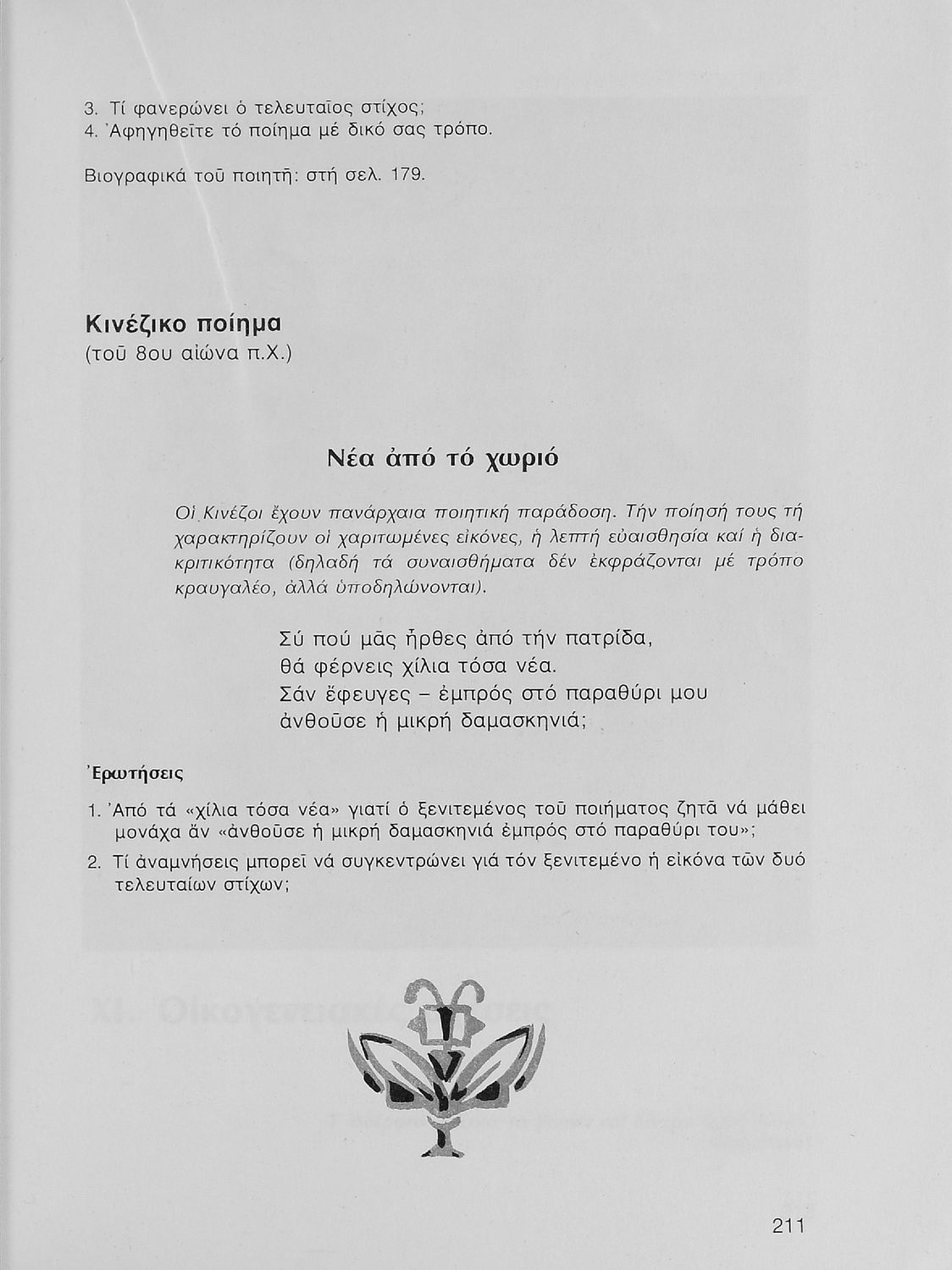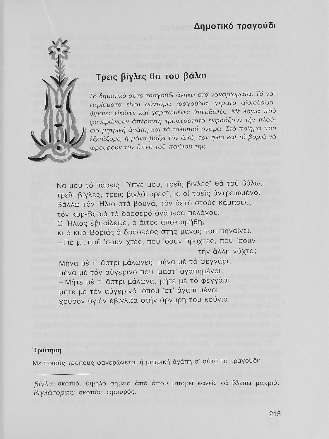 Σχολικό εγχειρίδιο Νέων Ελληνικών Α΄ Γυμνασίου που περιλαμβάνει δοκίμια, πεζά και ποιήματα Ελλήνων συγγραφέων και δημοτικά τραγούδια εμπνευσμένα από τη θρησκευτική, εθνική και κοινωνική ζωή, τη "δοκιμασία της Κύπρου", και την ελληνική φύση. Περιέχει και έργα ευρωπαίων συγγραφέων.
