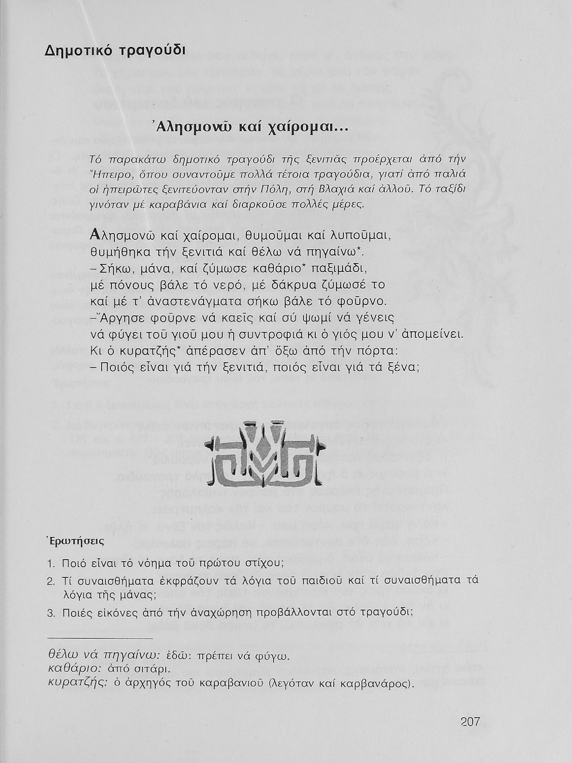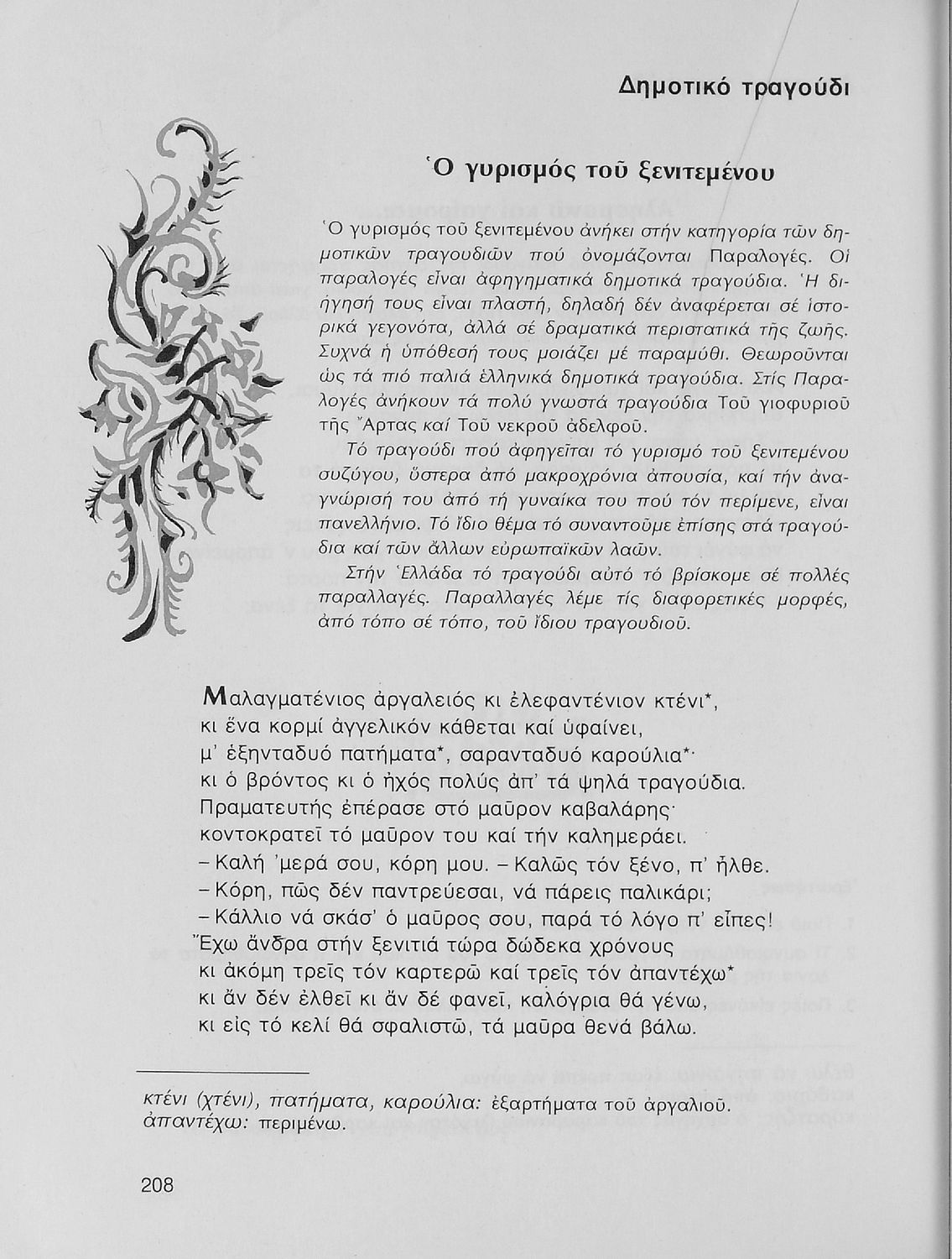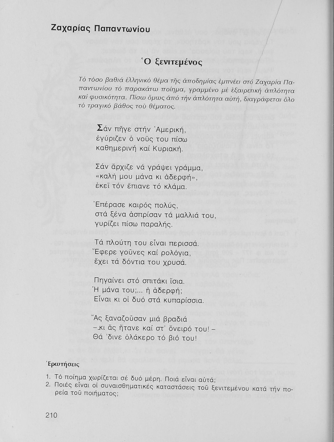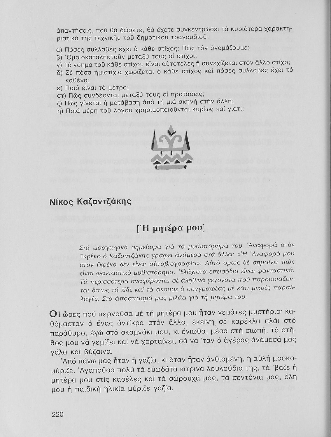 Σχολικό εγχειρίδιο Νέων Ελληνικών Α΄ Γυμνασίου που περιλαμβάνει δοκίμια, πεζά και ποιήματα Ελλήνων συγγραφέων και δημοτικά τραγούδια εμπνευσμένα από τη θρησκευτική, εθνική και κοινωνική ζωή, τη "δοκιμασία της Κύπρου", και την ελληνική φύση. Περιέχει και έργα ευρωπαίων συγγραφέων.