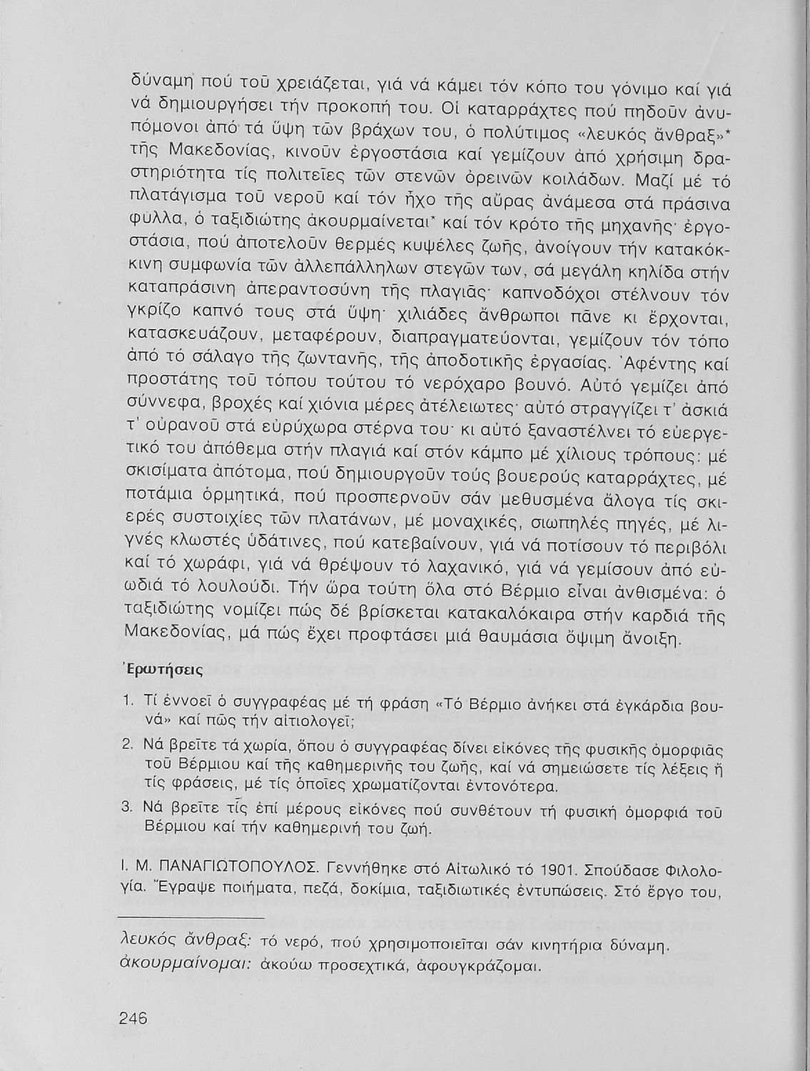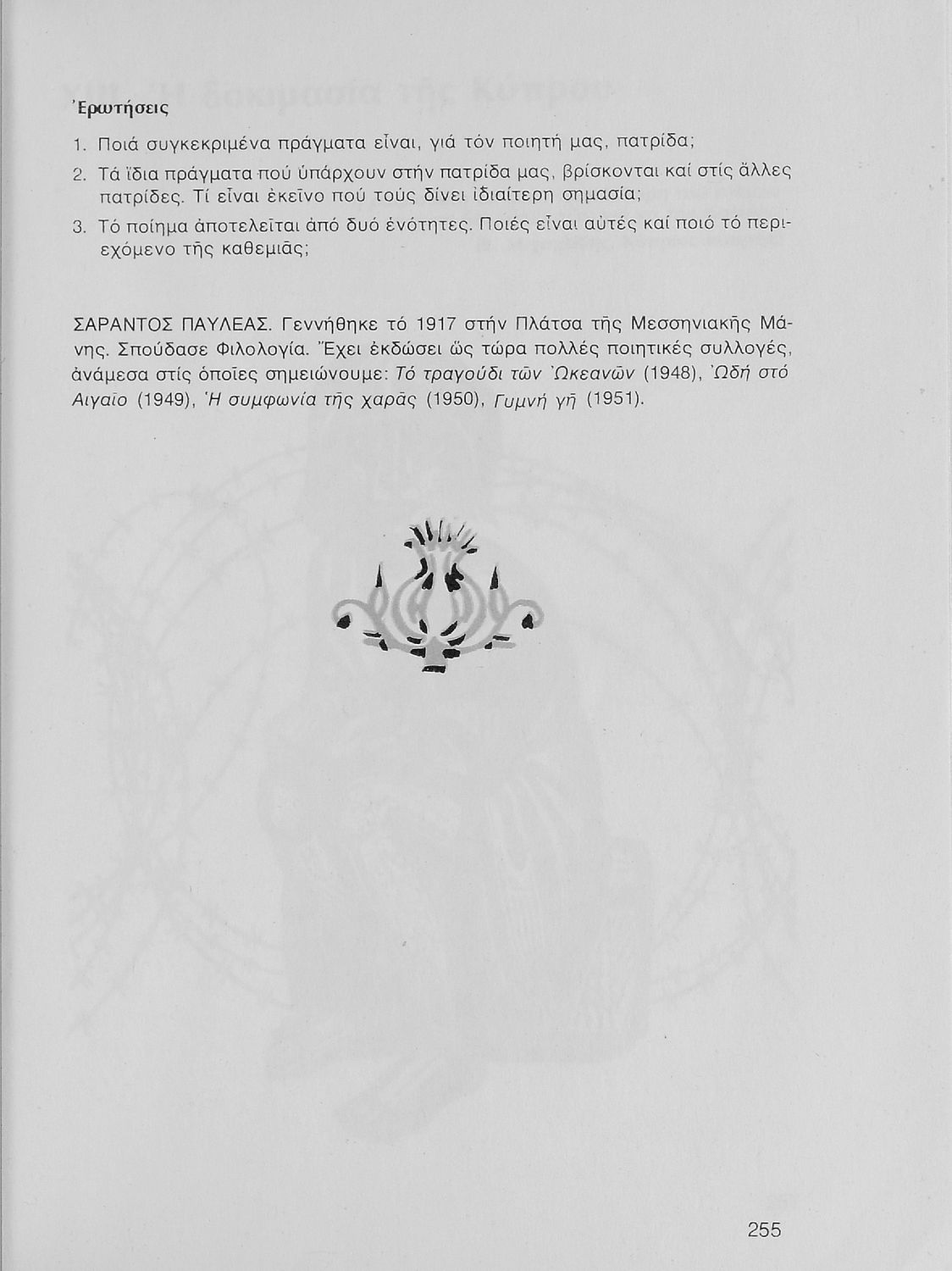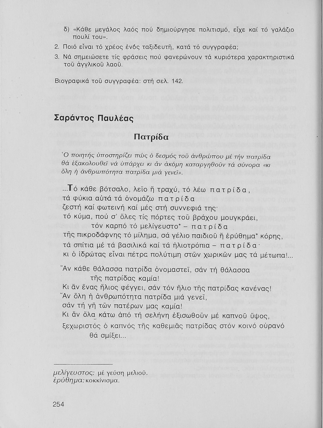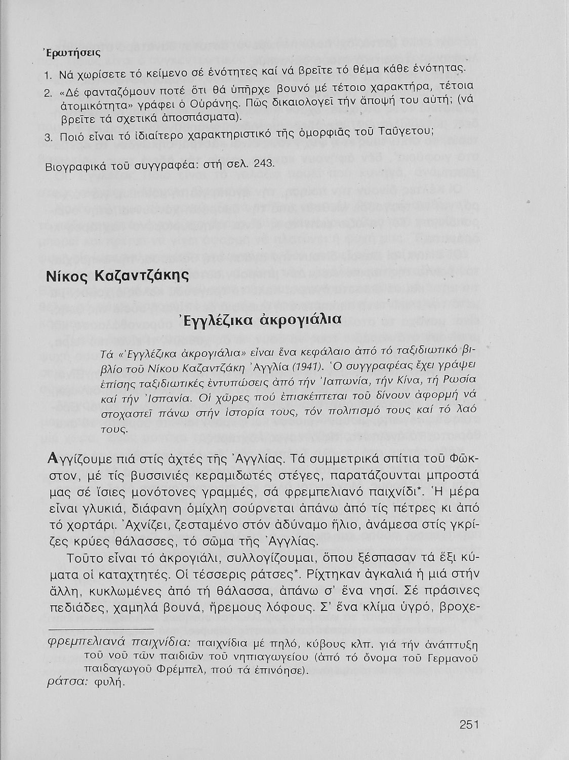 Σχολικό εγχειρίδιο Νέων Ελληνικών Α΄ Γυμνασίου που περιλαμβάνει δοκίμια, πεζά και ποιήματα Ελλήνων συγγραφέων και δημοτικά τραγούδια εμπνευσμένα από τη θρησκευτική, εθνική και κοινωνική ζωή, τη "δοκιμασία της Κύπρου", και την ελληνική φύση. Περιέχει και έργα ευρωπαίων συγγραφέων.