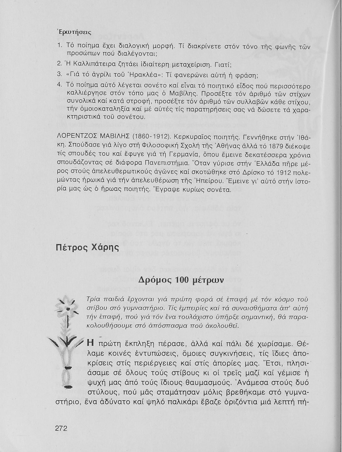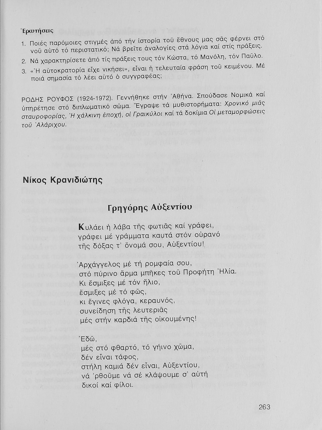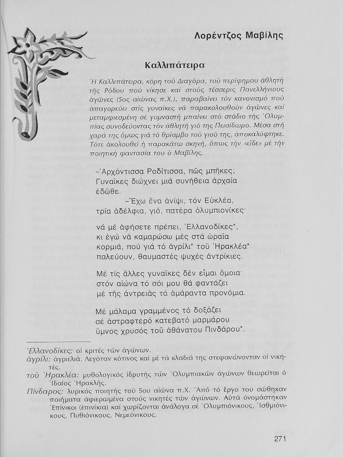 Σχολικό εγχειρίδιο Νέων Ελληνικών Α΄ Γυμνασίου που περιλαμβάνει δοκίμια, πεζά και ποιήματα Ελλήνων συγγραφέων και δημοτικά τραγούδια εμπνευσμένα από τη θρησκευτική, εθνική και κοινωνική ζωή, τη "δοκιμασία της Κύπρου", και την ελληνική φύση. Περιέχει και έργα ευρωπαίων συγγραφέων.