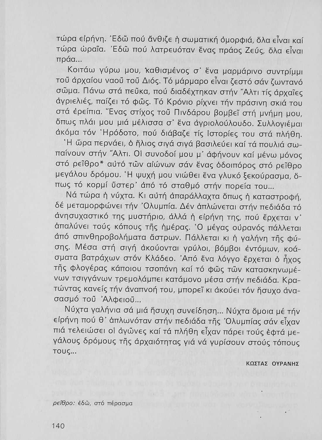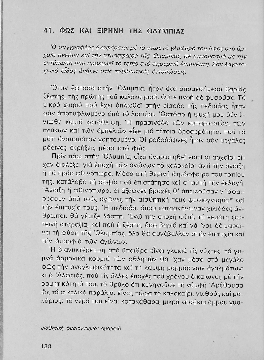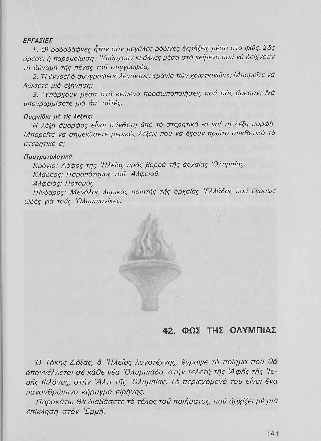 Αναγνωστικό ΣΤ΄ Δημοτικού που περιέχει πεζά και ποιήματα εμπνευσμένα από την κοινωνική, θρησκευτική και εθνική ζωή, την πολιτιστική κληρονομιά και τα ολυμπιακά ιδεώδη καθώς και από τις ασχολίες των ανθρώπων και τα προβλήματά τους. Περιέχει και βιογραφίες των συγγραφέων.