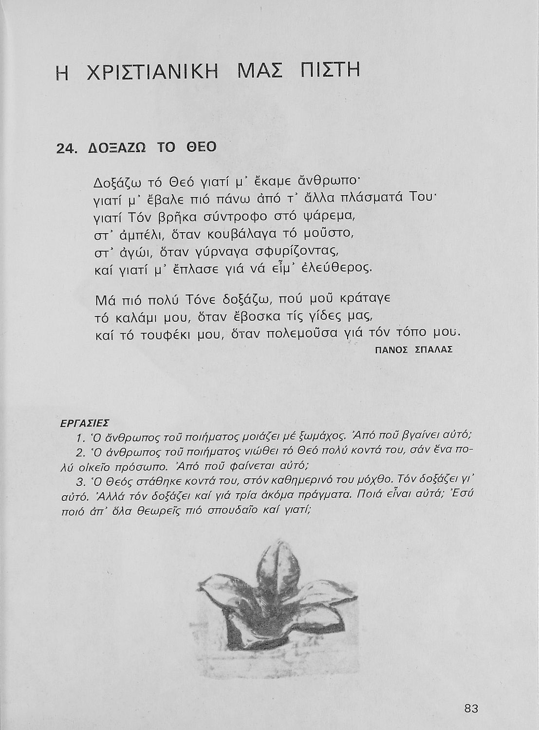 Αναγνωστικό ΣΤ΄ Δημοτικού που αντλεί τα θέματά του από τη θρησκευτική, εθνική, οικογενειακή, κοινωνική και επαγγελματική ζωή και την σύγχρονη ελληνική ιστορία. Φέρει το σύμβολο της δικτατορίας.