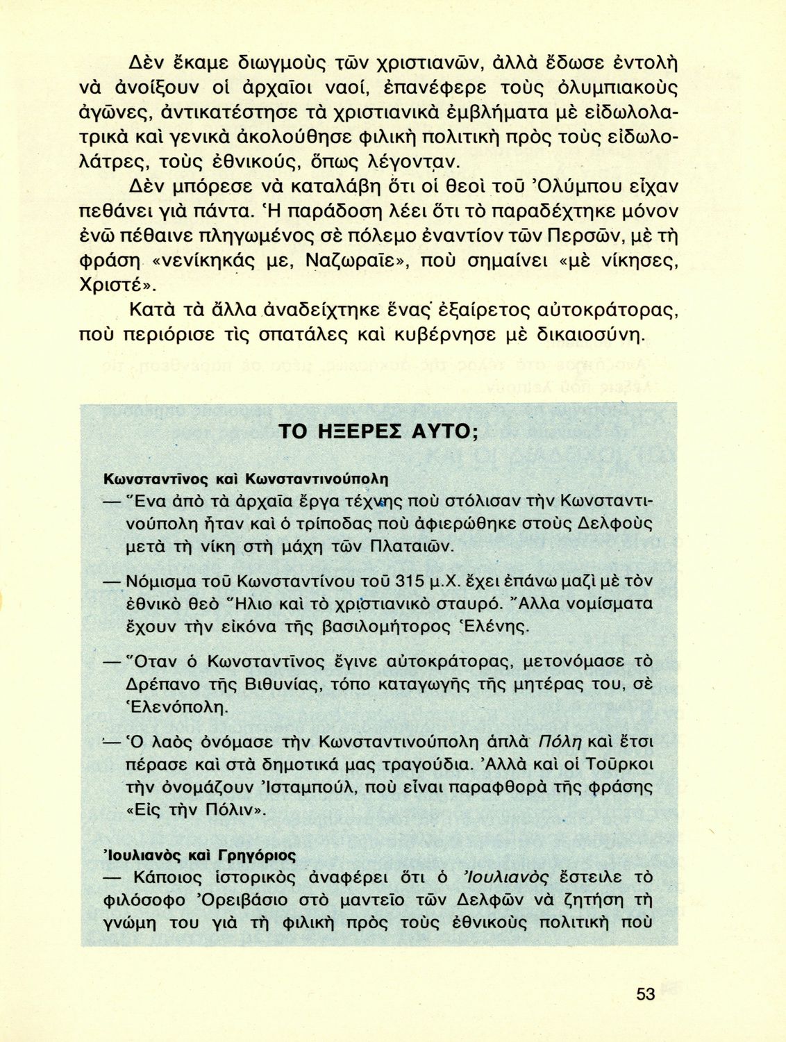 Σχολικό εγχειρίδιο της Ε΄ Δημοτικού για το μάθημα της Ιστορίας. Αναφέρεται στη ρωμαϊκή και Βυζαντινή Αυτοκρατορία. Αναλύεται το έργο και η δράση κάθε αυτοκράτορα τελειώνει με την άλωση και την επικράτηση των Οθωμανών. Στο τέλος αναφέρεται στα γράμματα και τις ανακαλύψεις των νέων χωρών.