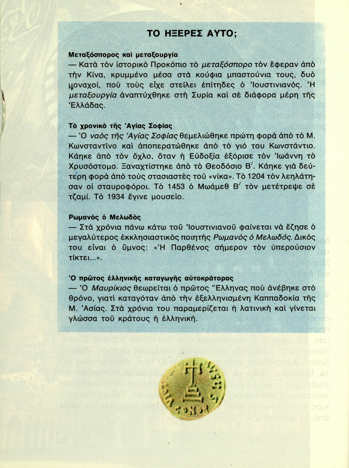 Σχολικό εγχειρίδιο της Ε΄ Δημοτικού για το μάθημα της Ιστορίας. Αναφέρεται στη ρωμαϊκή και Βυζαντινή Αυτοκρατορία. Αναλύεται το έργο και η δράση κάθε αυτοκράτορα τελειώνει με την άλωση και την επικράτηση των Οθωμανών. Στο τέλος αναφέρεται στα γράμματα και τις ανακαλύψεις των νέων χωρών.