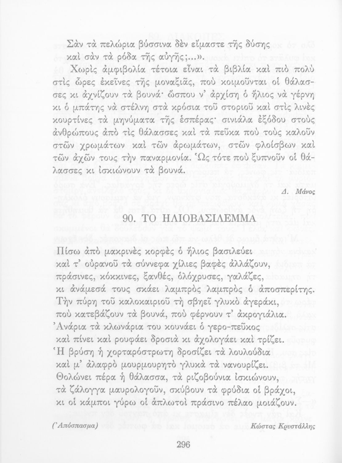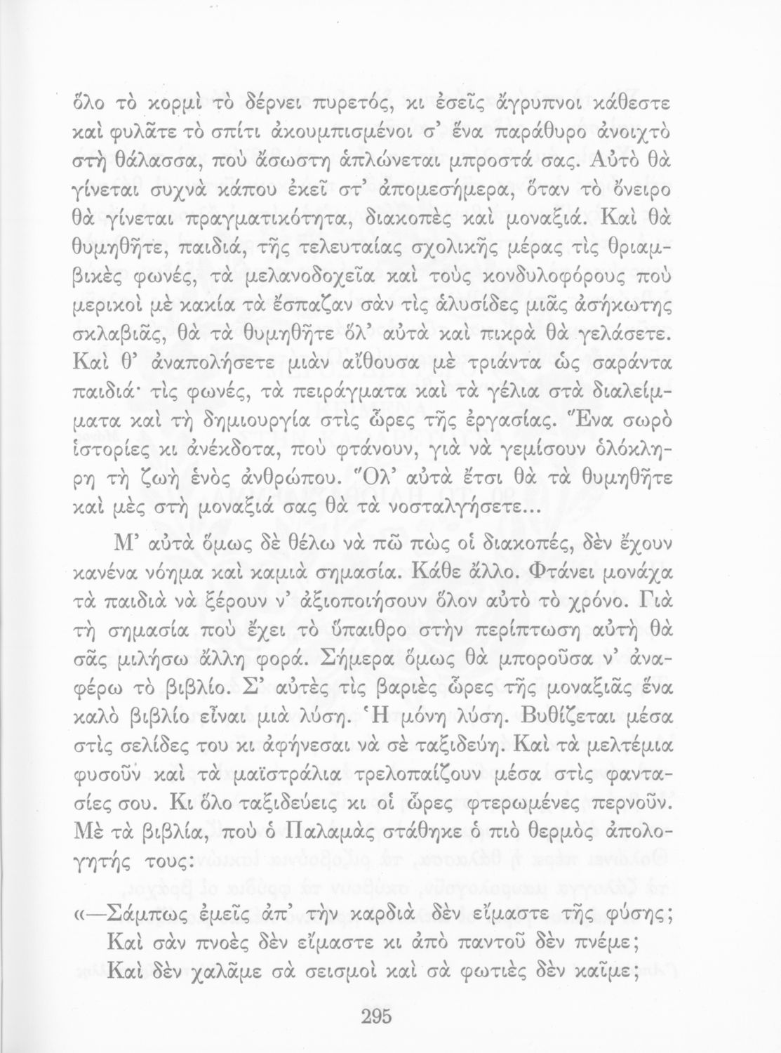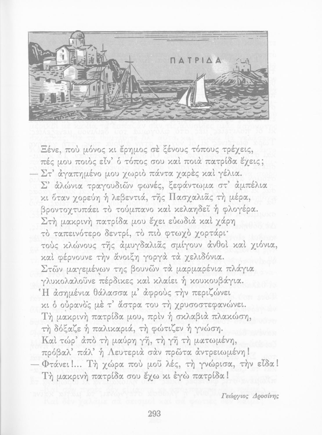 Αναγνωστικό ΣΤ΄ Δημοτικού που περιλαμβάνει πεζά και ποιήματα εμπνευσμένα από τη θρησκευτική, εθνική και κοινωνική ζωή καθώς και από τις ασχολίες των Ελλήνων.