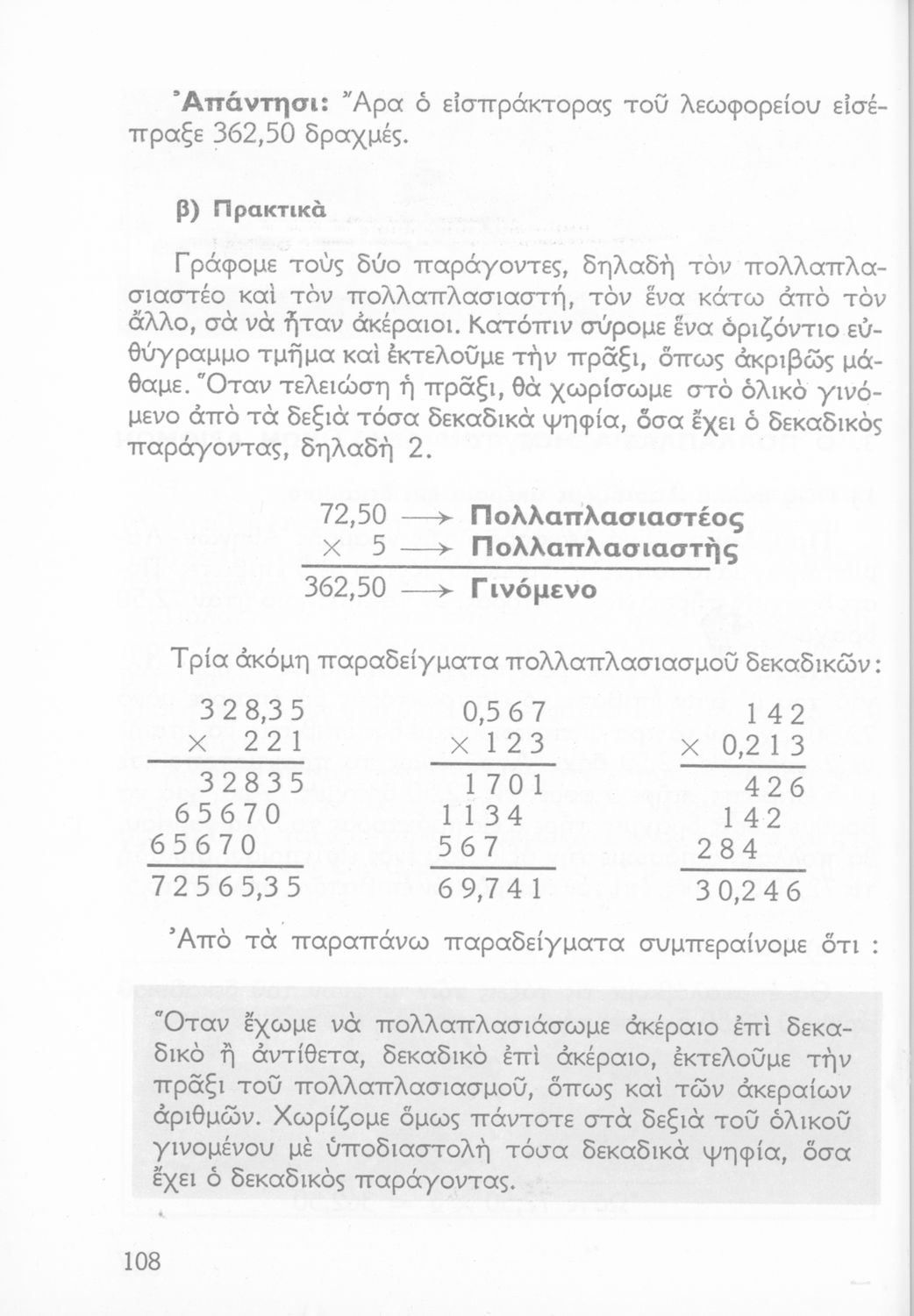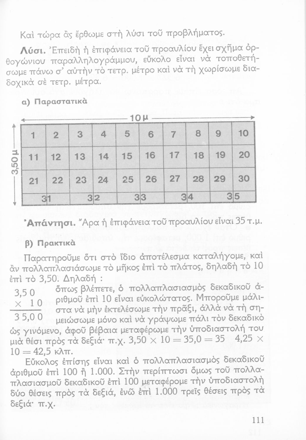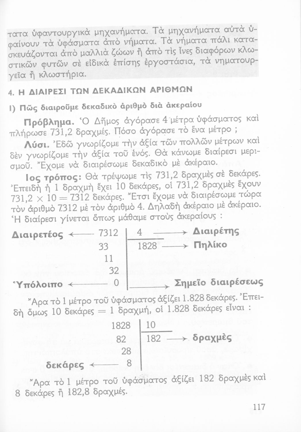Σχολικό εγχειρίδιο Αριθμητικής Δ΄ Δημοτικού χωρισμένο σε πρακτικά προβλήματα και τις λύσεις τους που περιλαμβάνει και κάποια στοιχεία Γεωμετρίας.