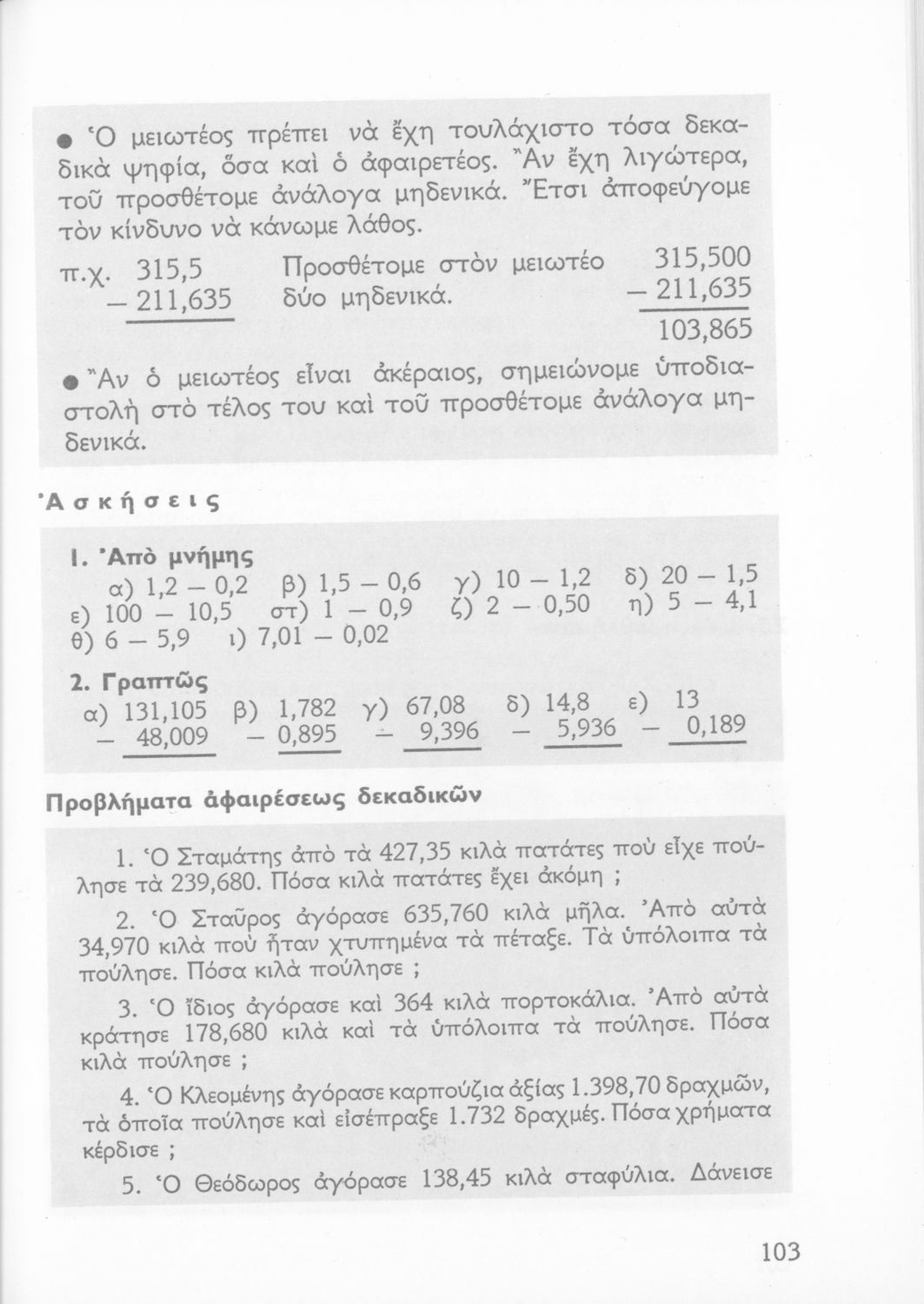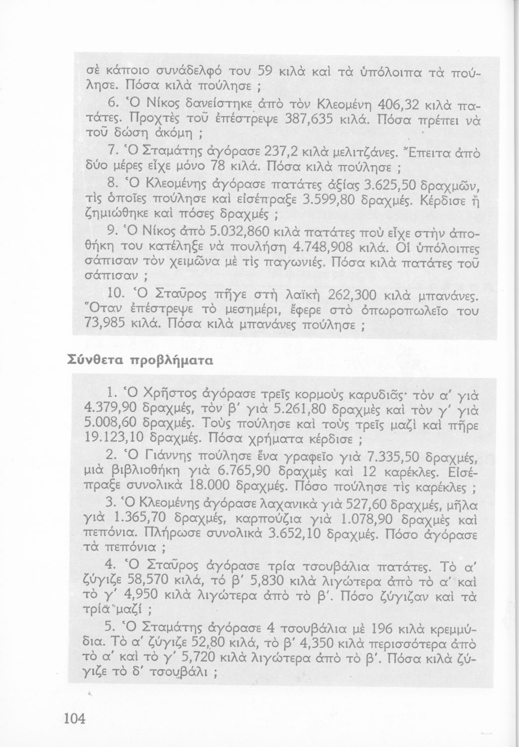 Σχολικό εγχειρίδιο Αριθμητικής Δ΄ Δημοτικού χωρισμένο σε πρακτικά προβλήματα και τις λύσεις τους που εστιάζει στις πράξεις με ακέραιους και συμμιγείς αριθμούς και περιλαμβάνει στοιχεία Γεωμετρίας.