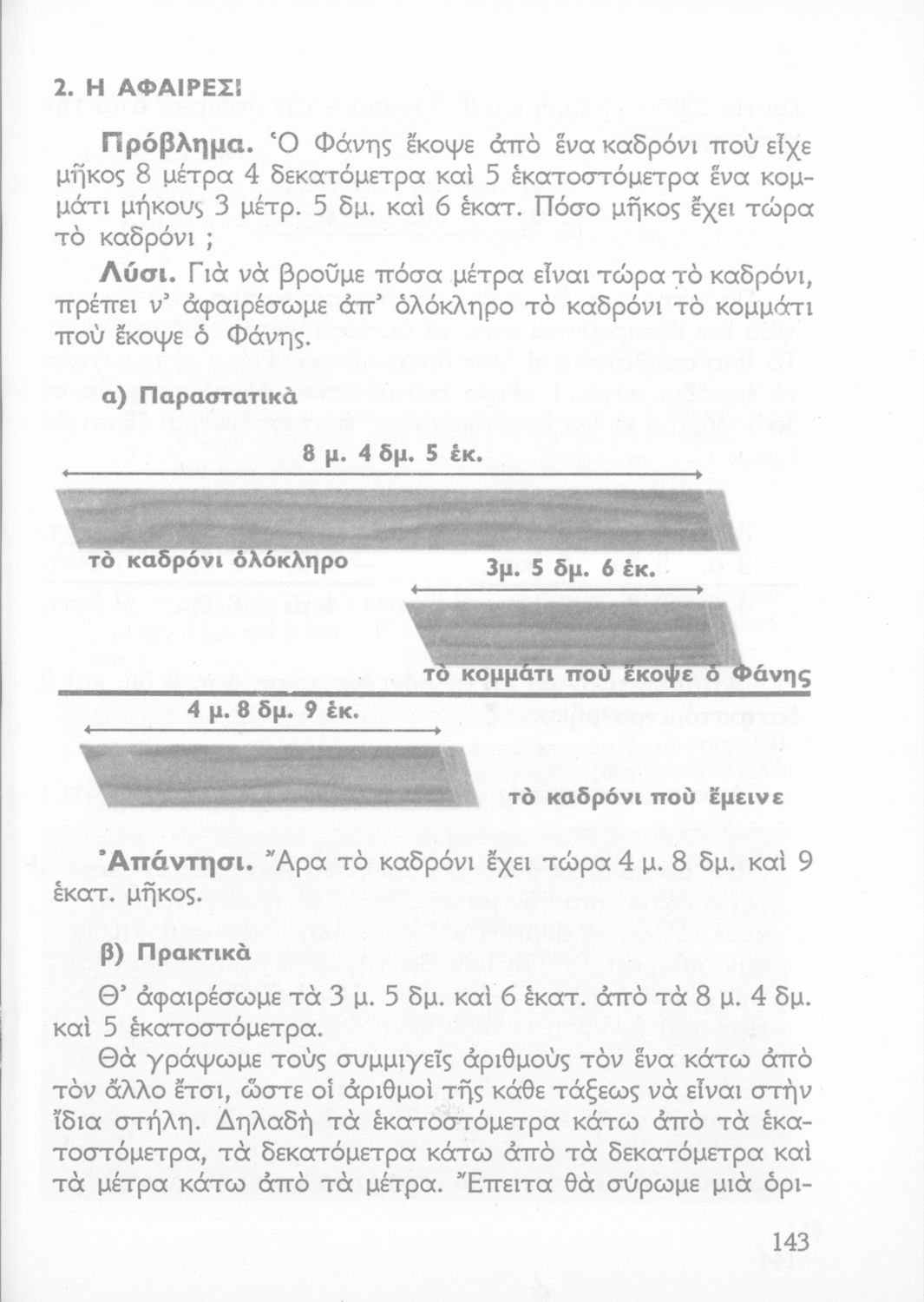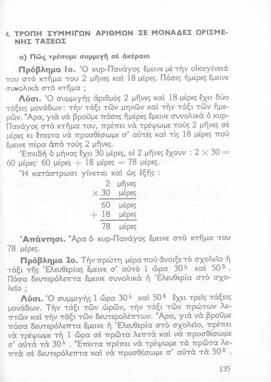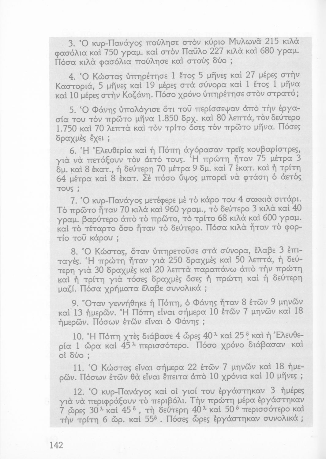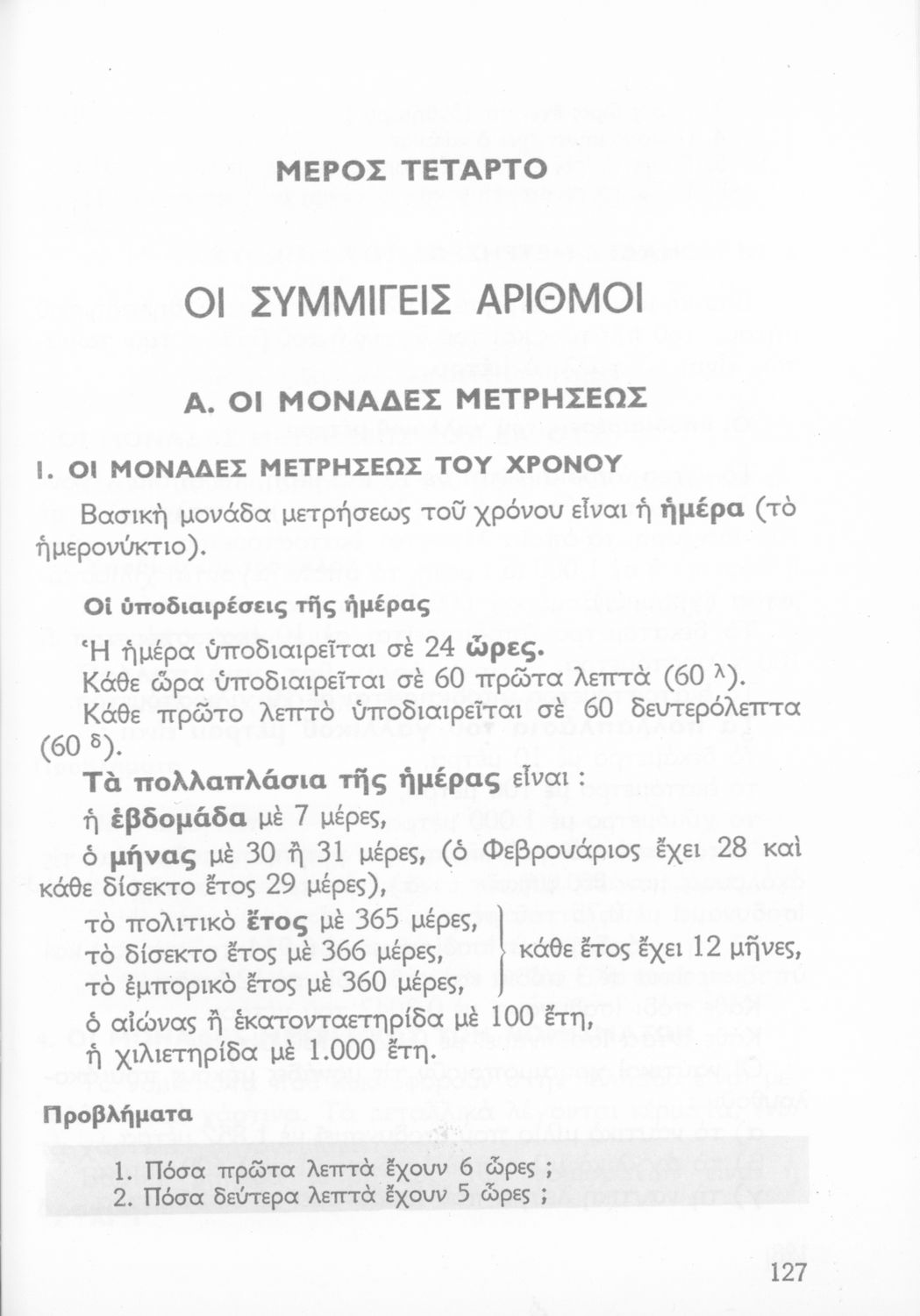 Σχολικό εγχειρίδιο Αριθμητικής Δ΄ Δημοτικού χωρισμένο σε πρακτικά προβλήματα και τις λύσεις τους που περιλαμβάνει και κάποια στοιχεία Γεωμετρίας.