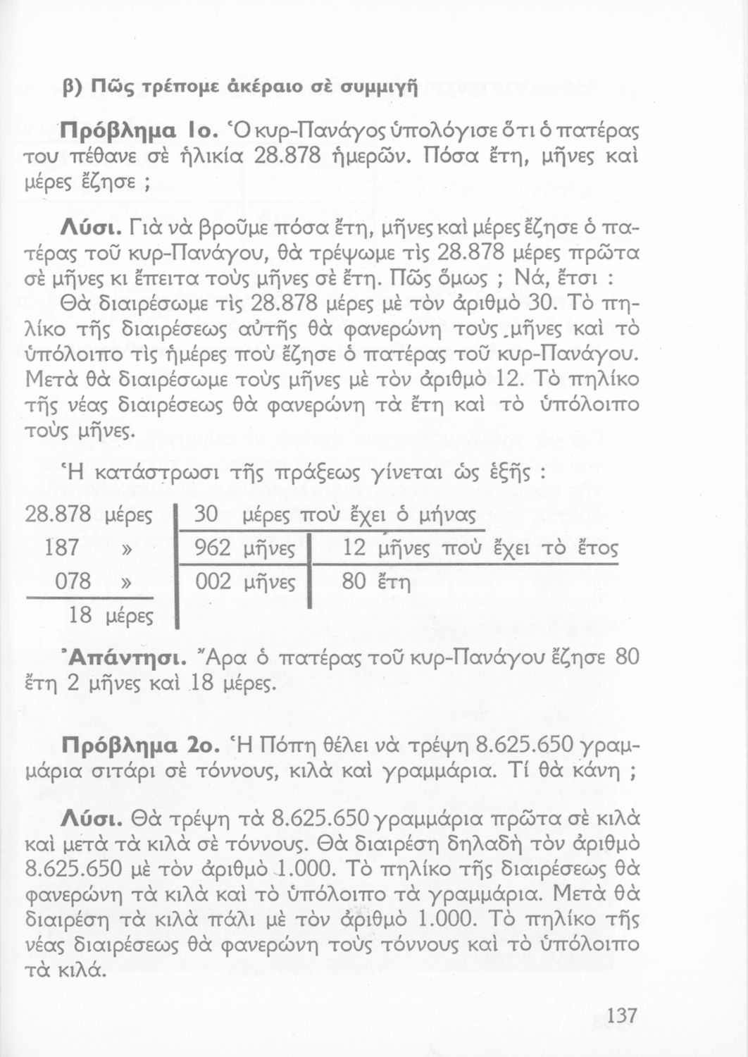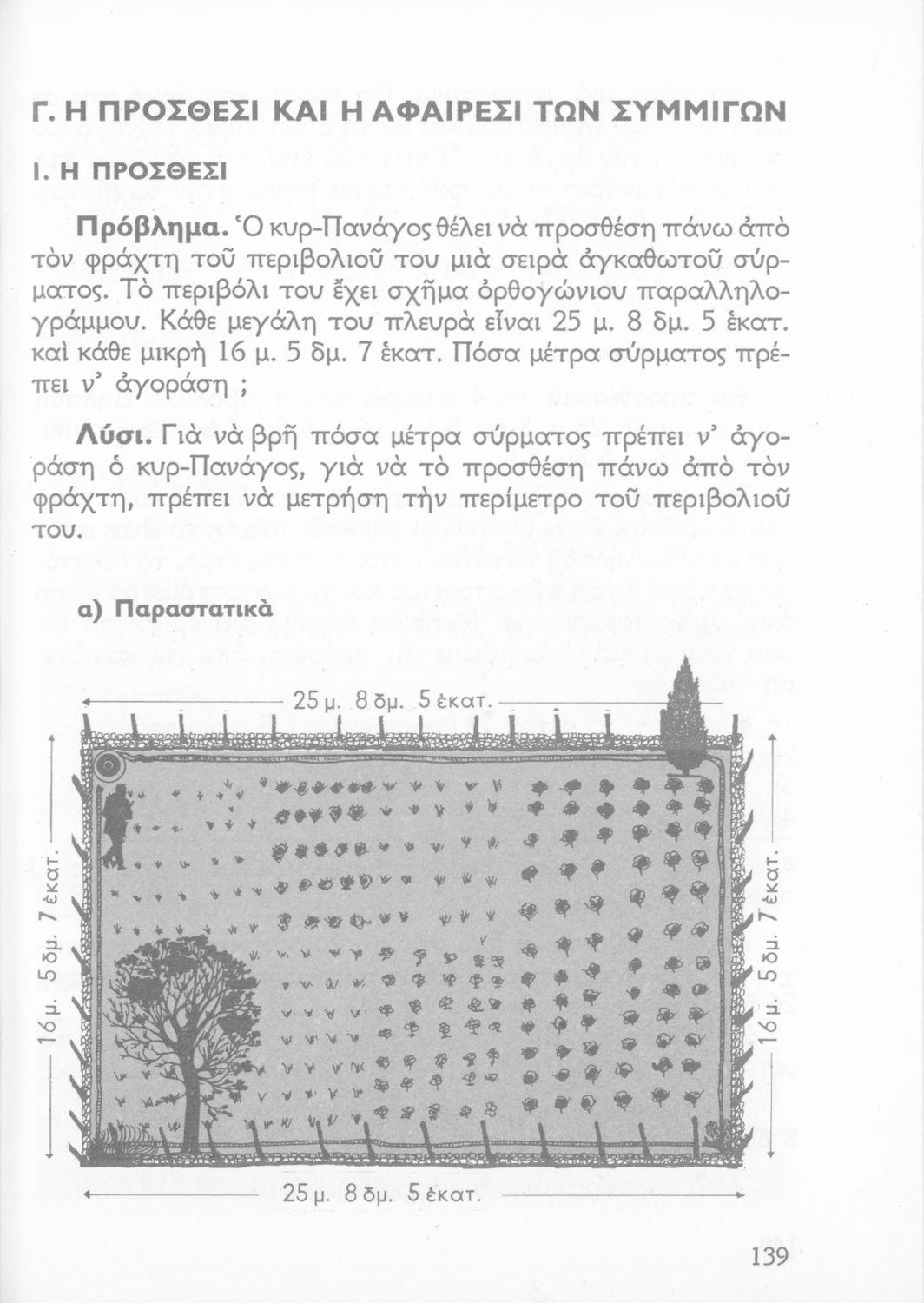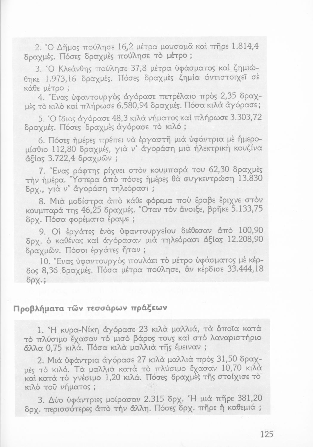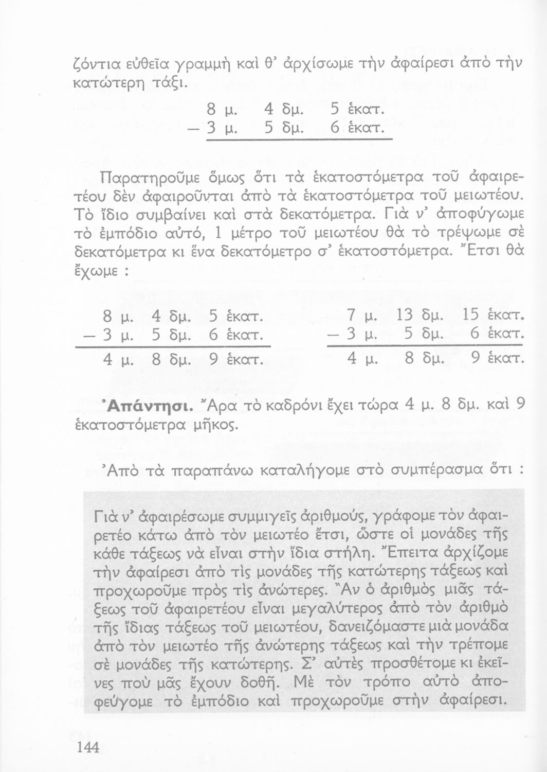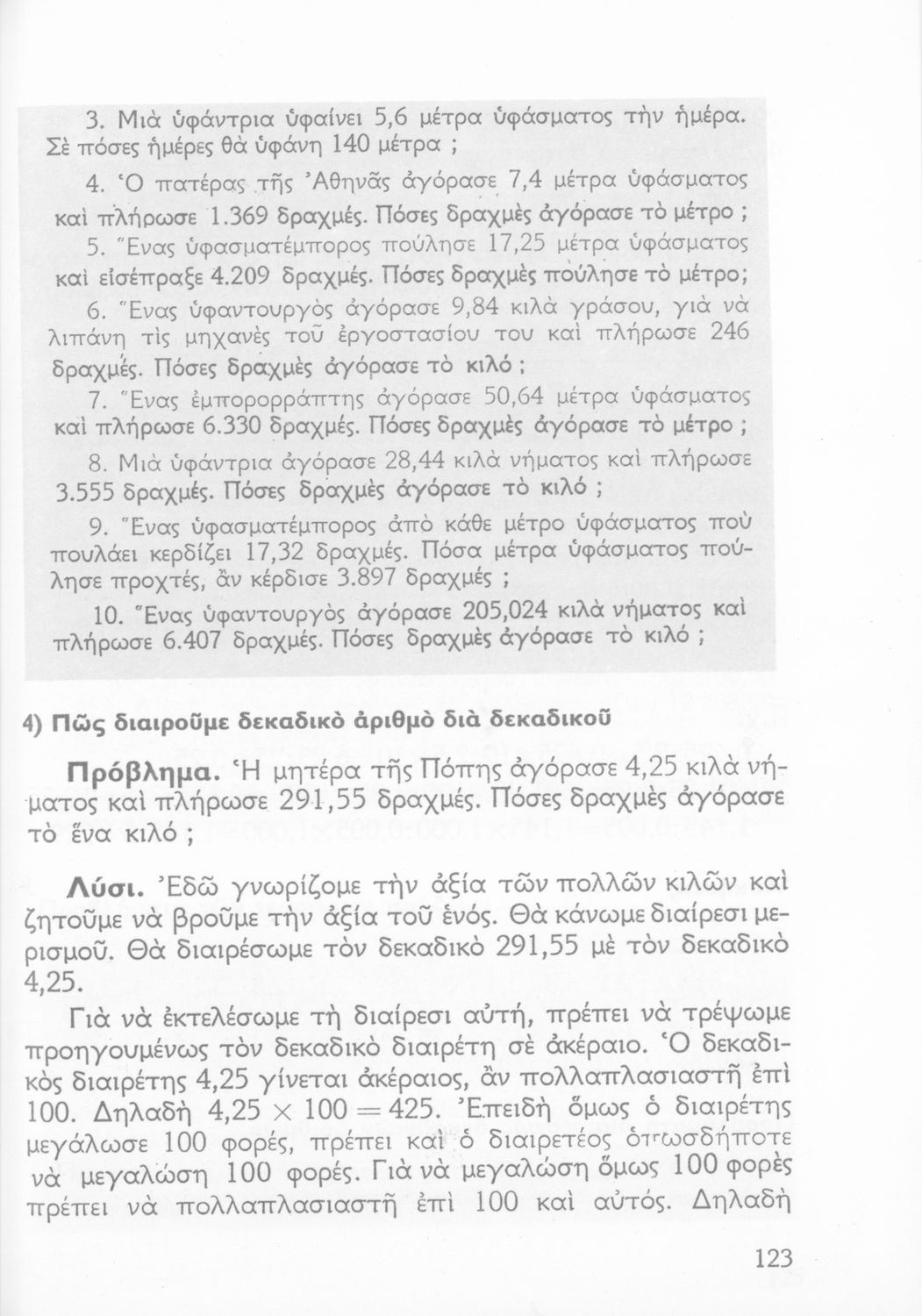 Σχολικό εγχειρίδιο Αριθμητικής Δ΄ Δημοτικού χωρισμένο σε πρακτικά προβλήματα και τις λύσεις τους που περιλαμβάνει και κάποια στοιχεία Γεωμετρίας.