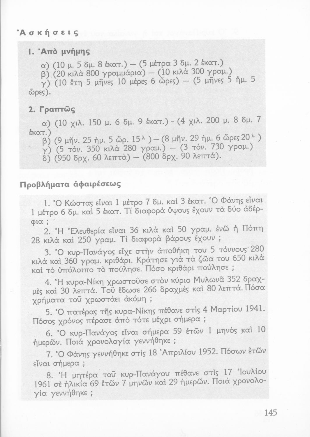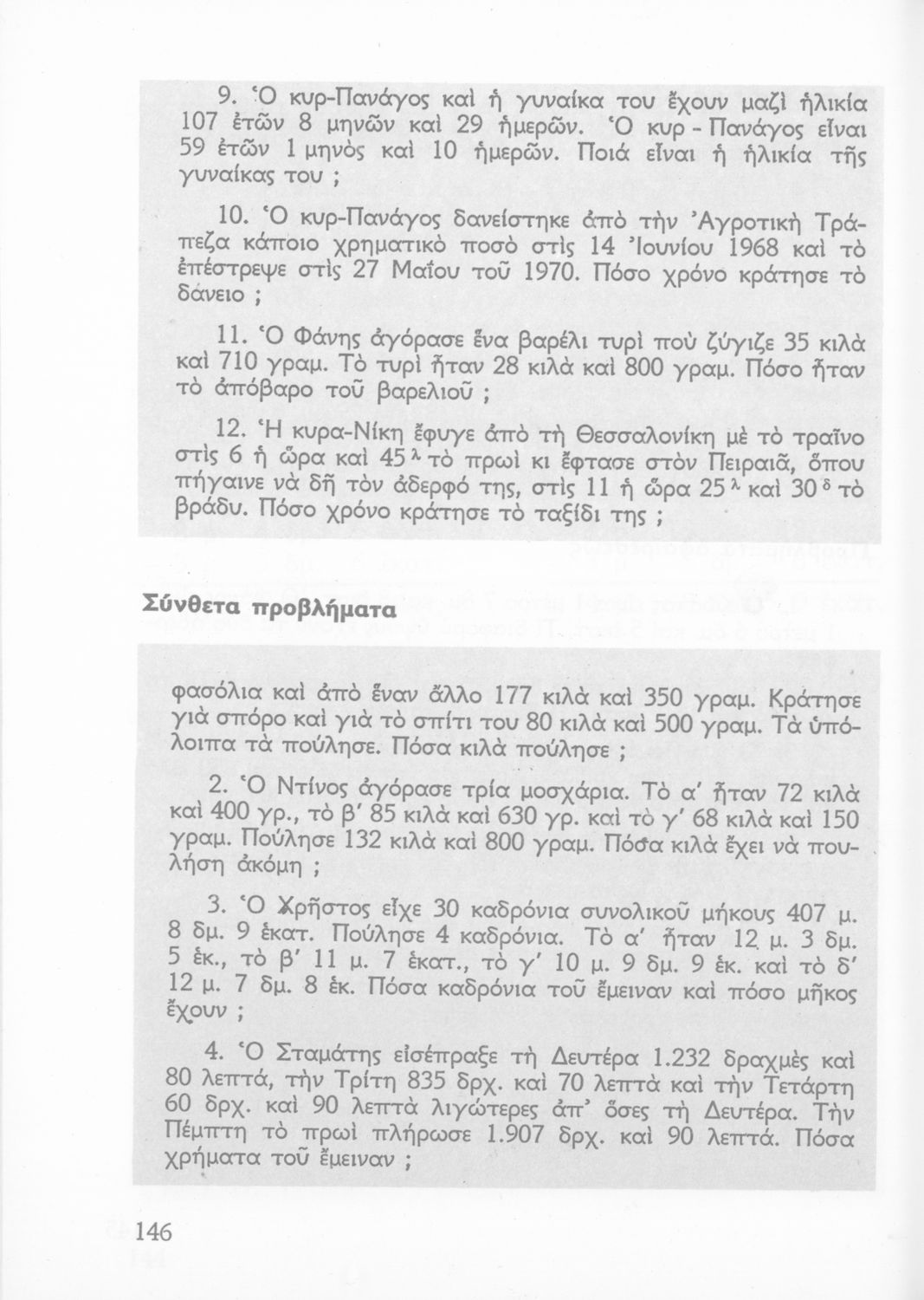 Σχολικό εγχειρίδιο Αριθμητικής Δ΄ Δημοτικού χωρισμένο σε πρακτικά προβλήματα και τις λύσεις τους που περιλαμβάνει και κάποια στοιχεία Γεωμετρίας.