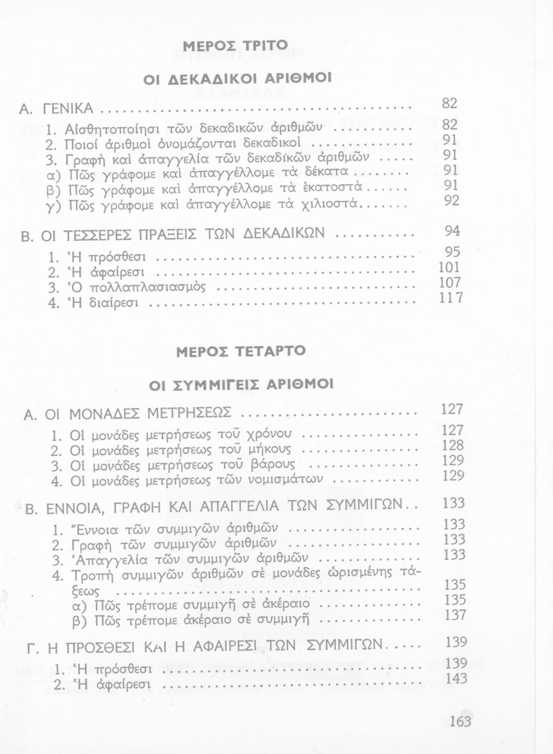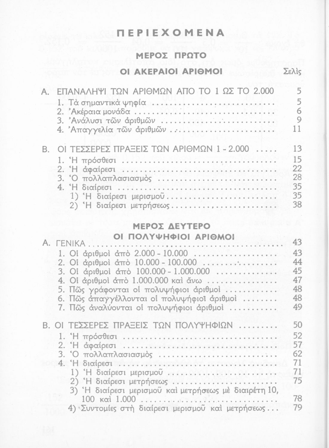 Σχολικό εγχειρίδιο Αριθμητικής Δ΄ Δημοτικού χωρισμένο σε πρακτικά προβλήματα και τις λύσεις τους που περιλαμβάνει και κάποια στοιχεία Γεωμετρίας.