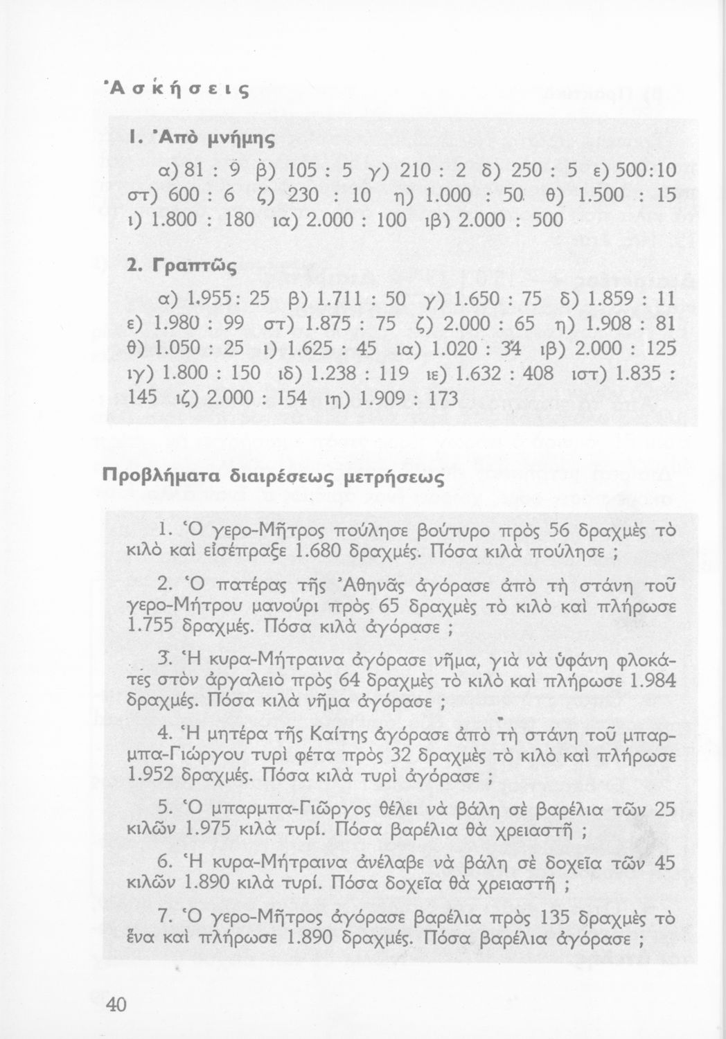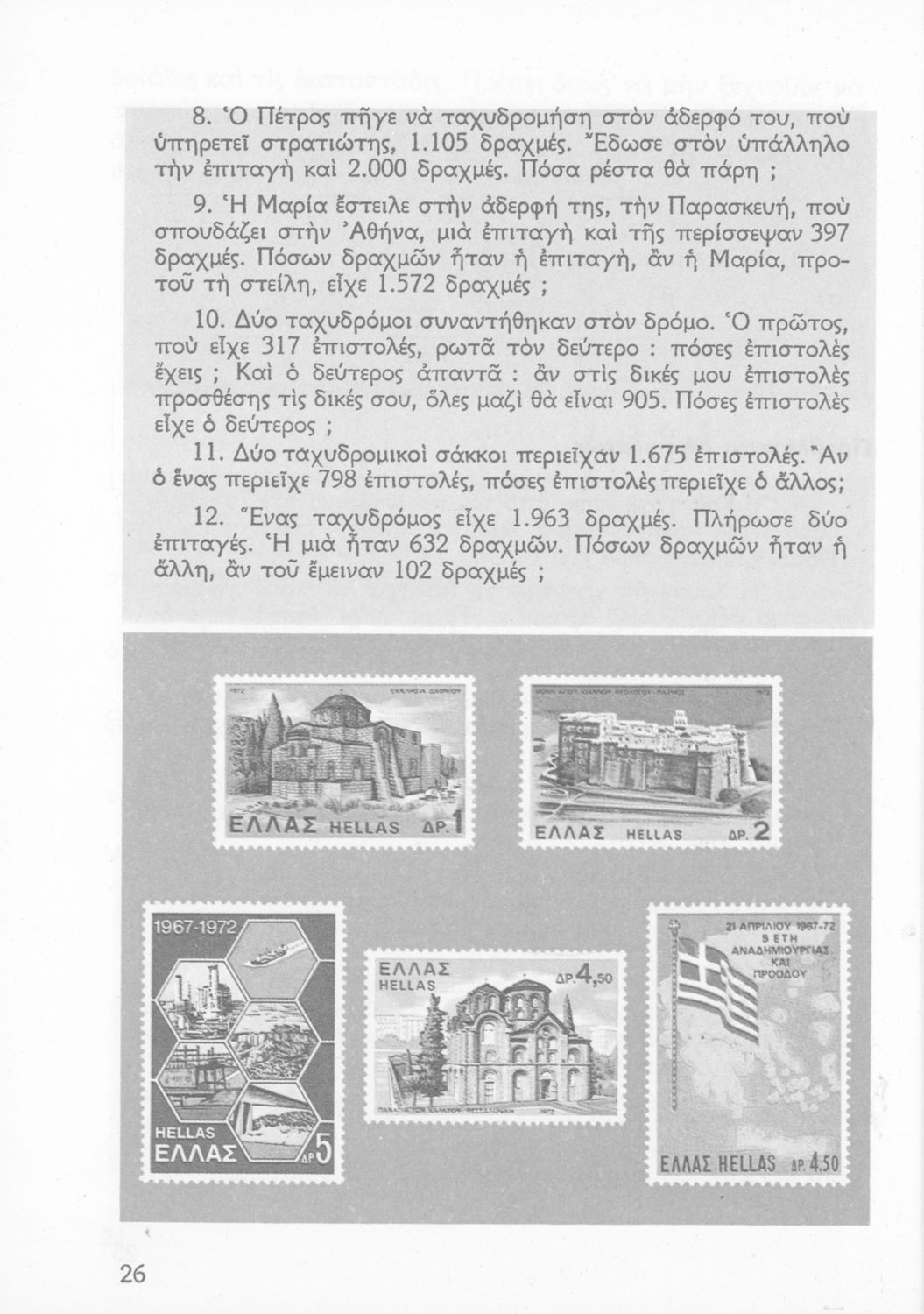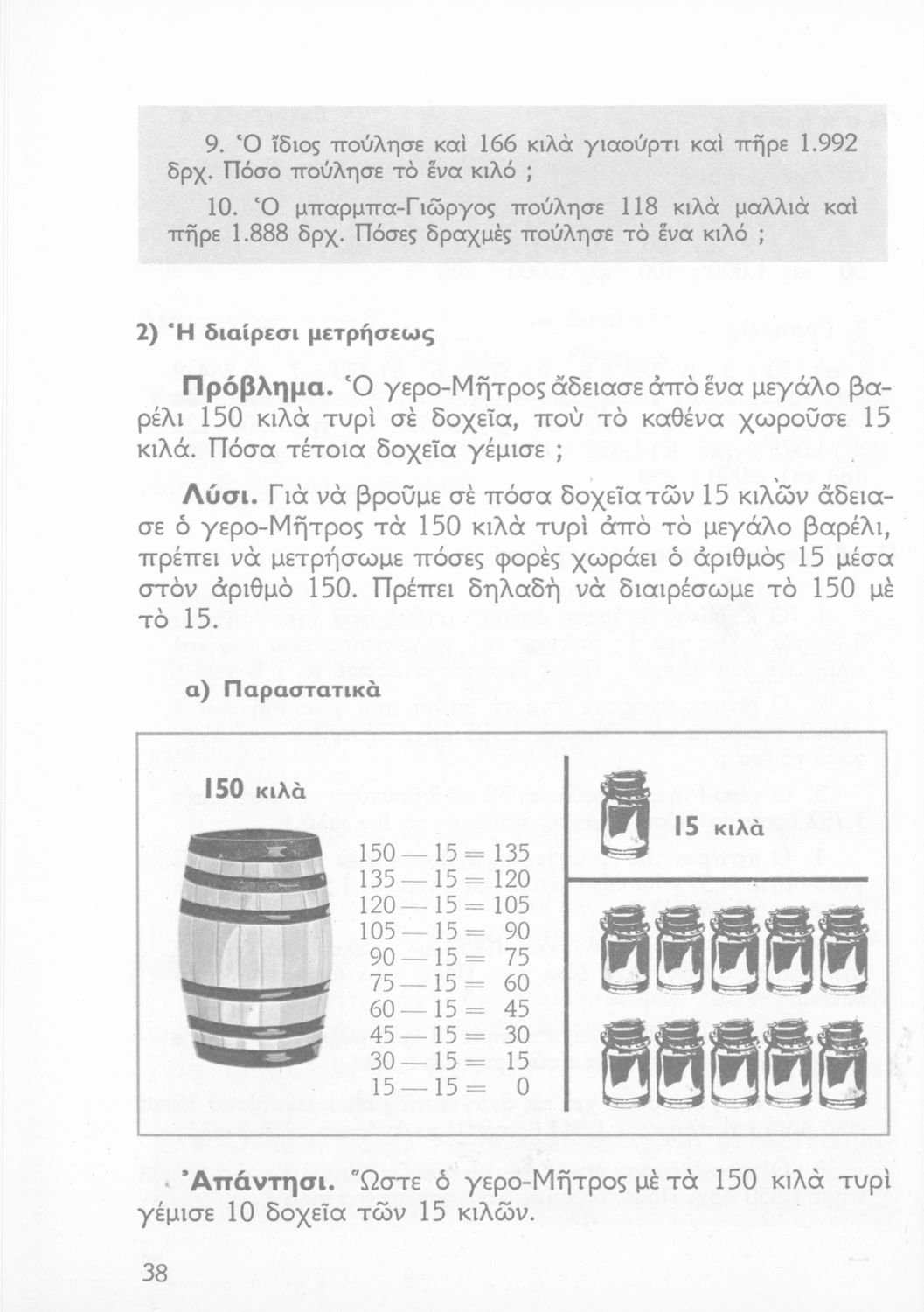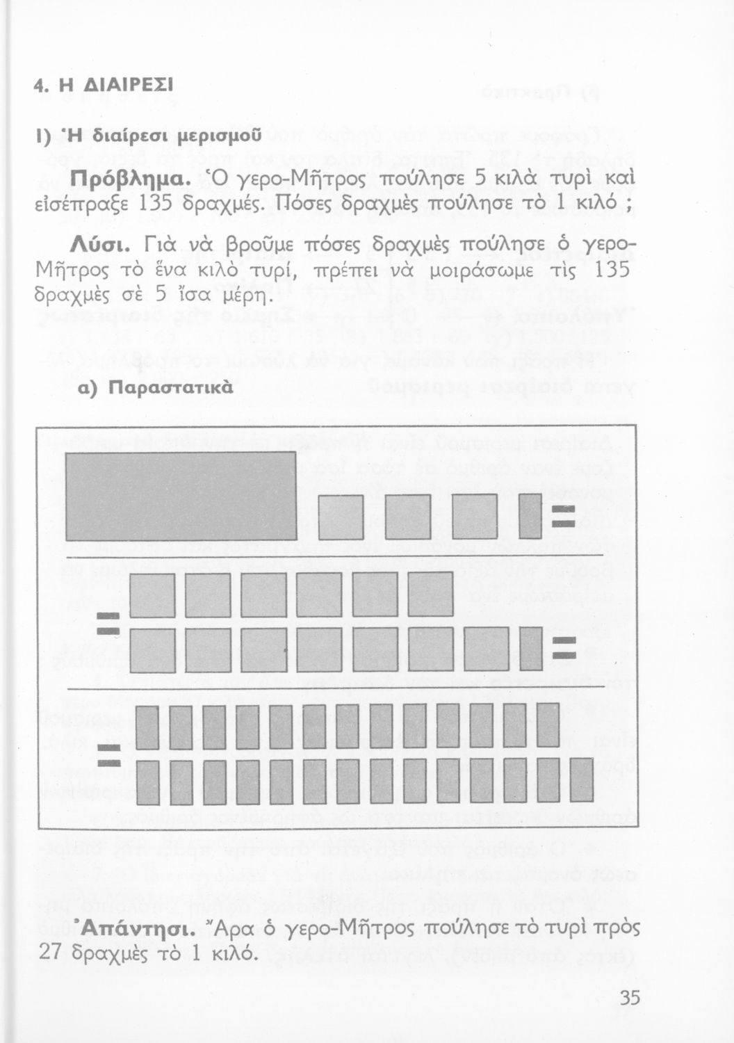 Σχολικό εγχειρίδιο Αριθμητικής Δ΄ Δημοτικού χωρισμένο σε πρακτικά προβλήματα και τις λύσεις τους που περιλαμβάνει και κάποια στοιχεία Γεωμετρίας.