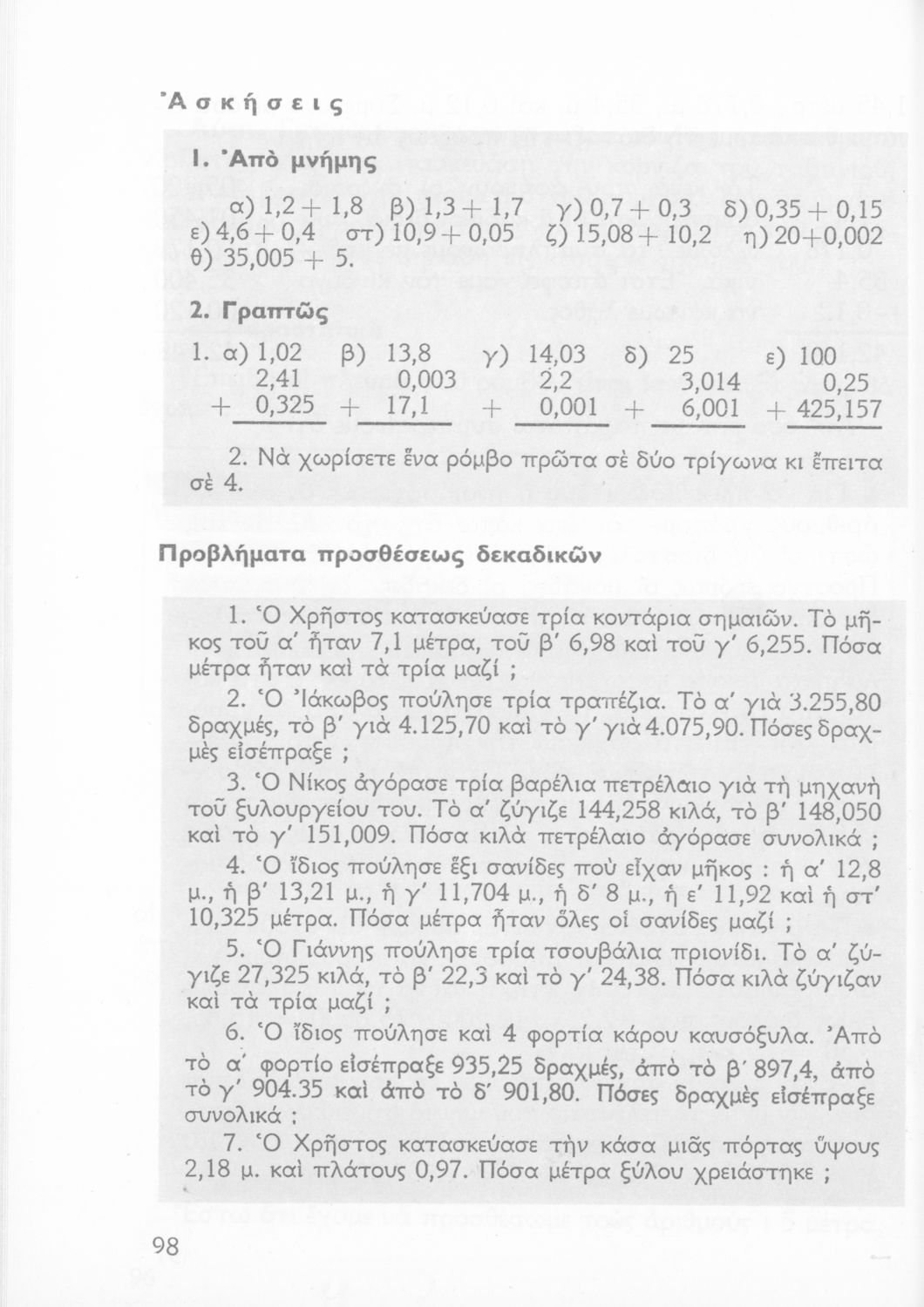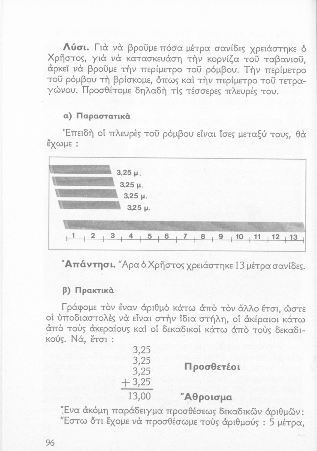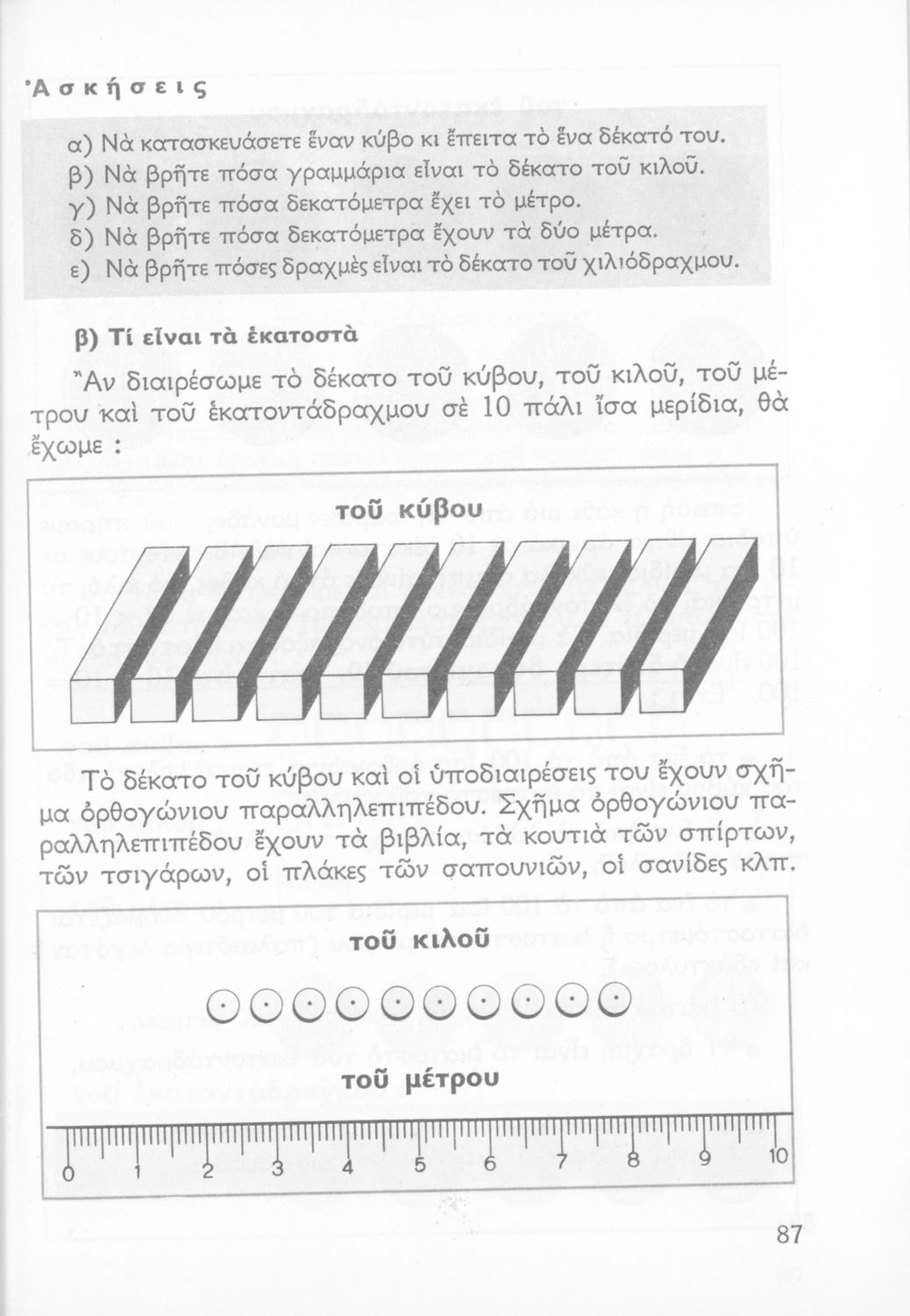 Σχολικό εγχειρίδιο Αριθμητικής Δ΄ Δημοτικού χωρισμένο σε πρακτικά προβλήματα και τις λύσεις τους που περιλαμβάνει και κάποια στοιχεία Γεωμετρίας.