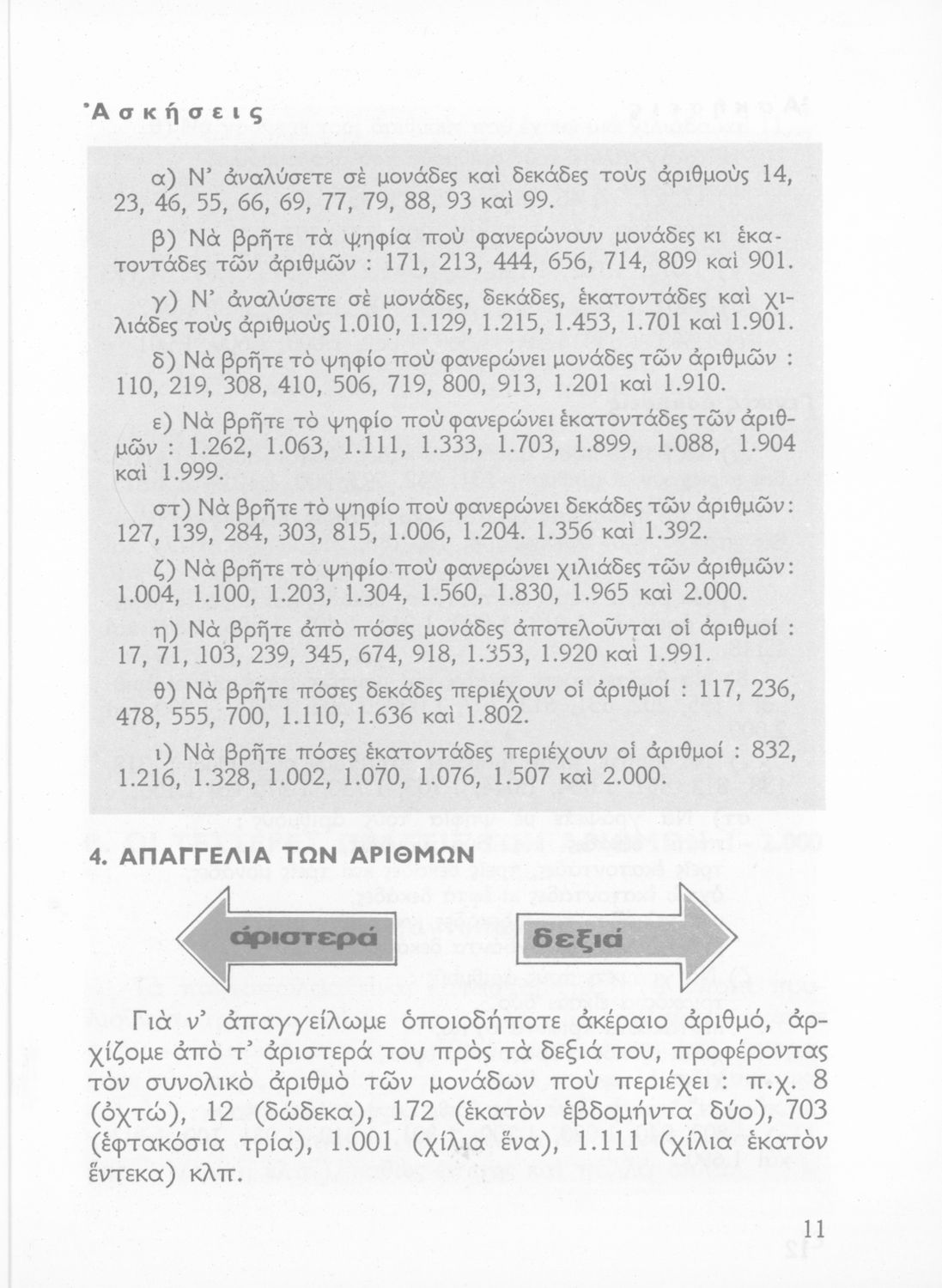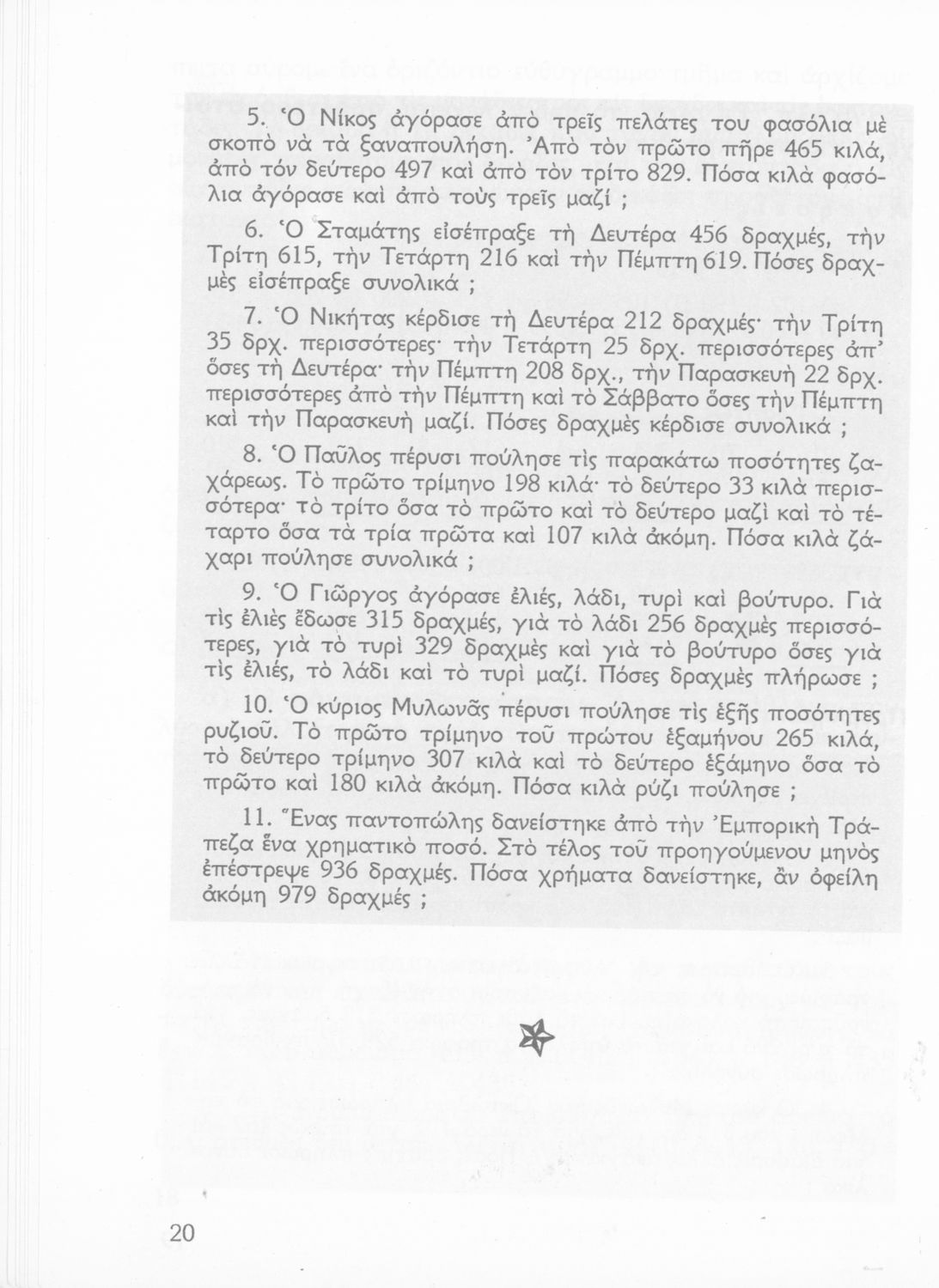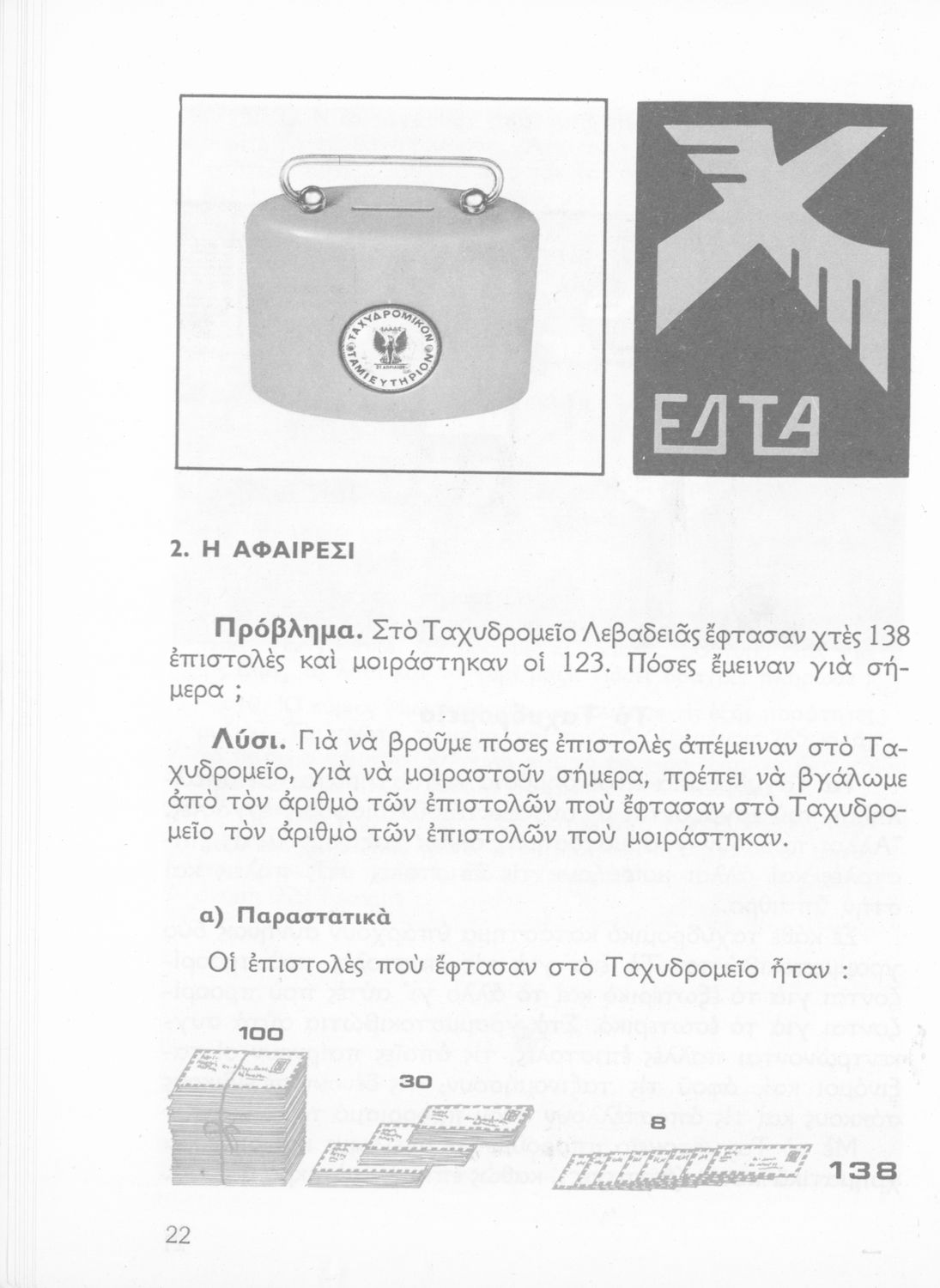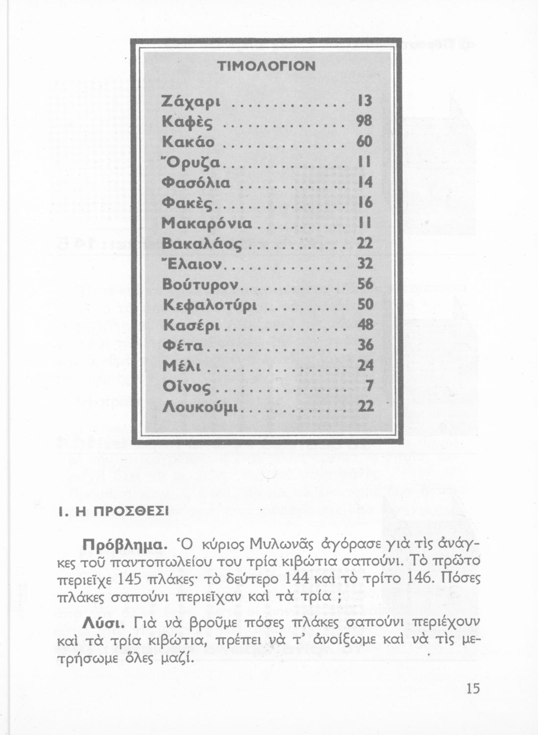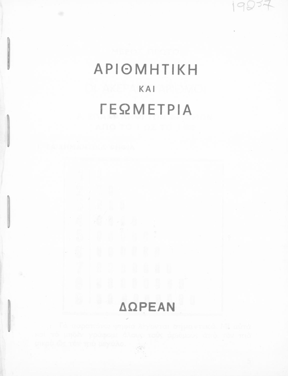Σχολικό εγχειρίδιο Αριθμητικής Δ΄ Δημοτικού χωρισμένο σε πρακτικά προβλήματα και τις λύσεις τους που περιλαμβάνει και κάποια στοιχεία Γεωμετρίας.